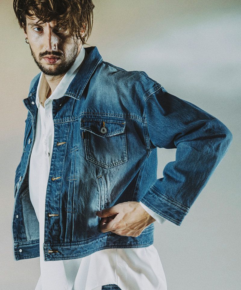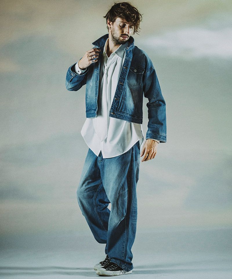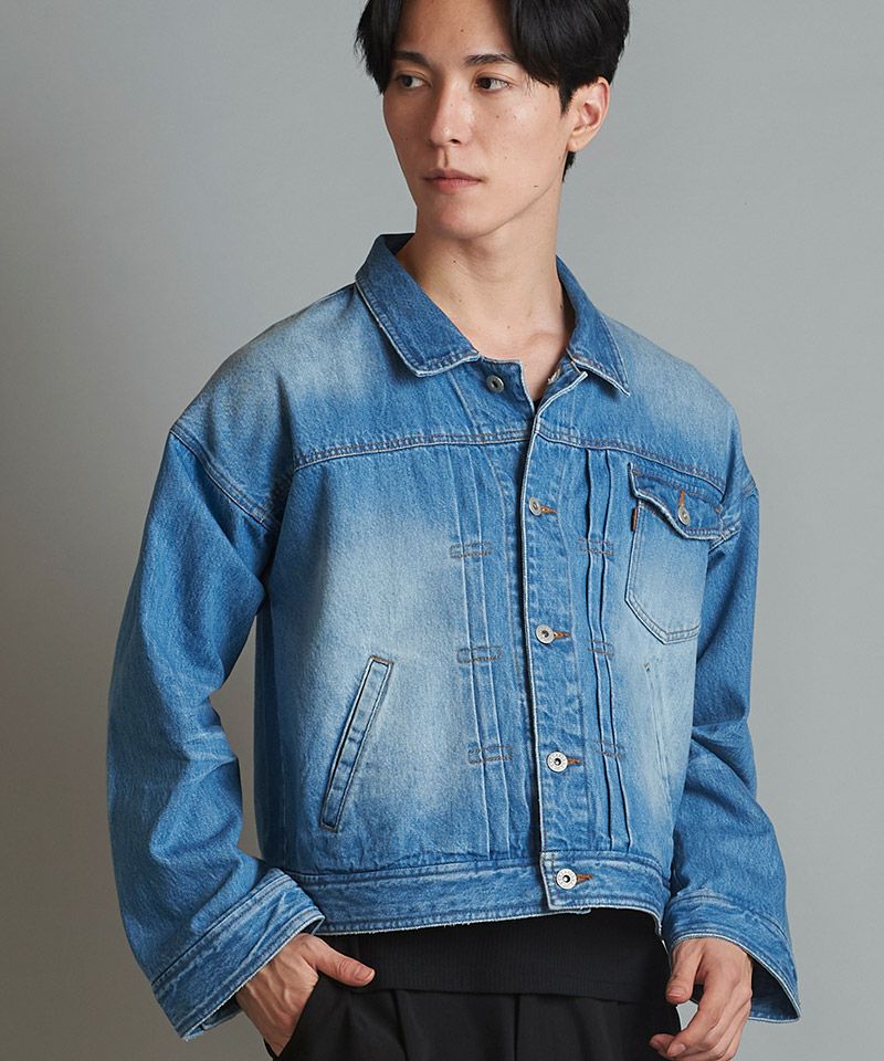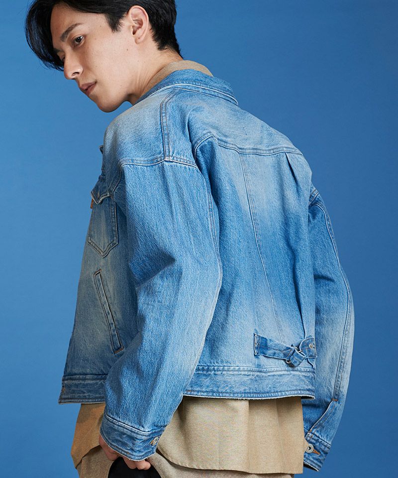 左胸のみ取り付けたフラップポケット、装飾的な役割の他にフロントボタンを締めて着用した時の可動域も確保してくれるフロントプリーツ、バックシンチと呼ばれるリベット補強されたバックルベルト、動きやすさを考慮した背面プリーツ、アルファベットの【T】の様に見える切替などヴィンテージデニムの要素をふんだんに取り入れた本格志向のデザイン。