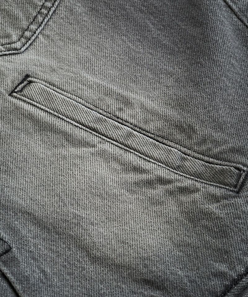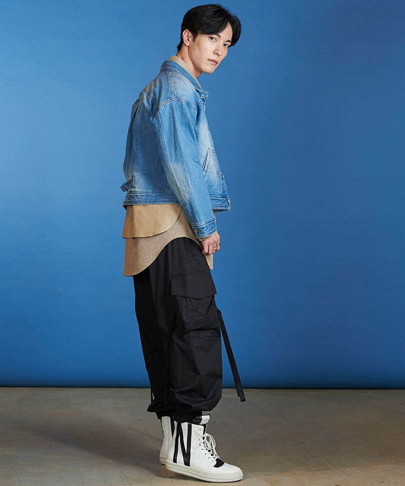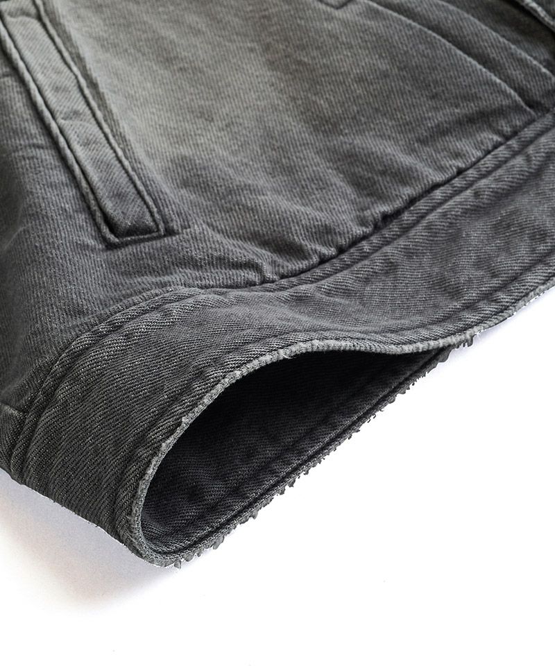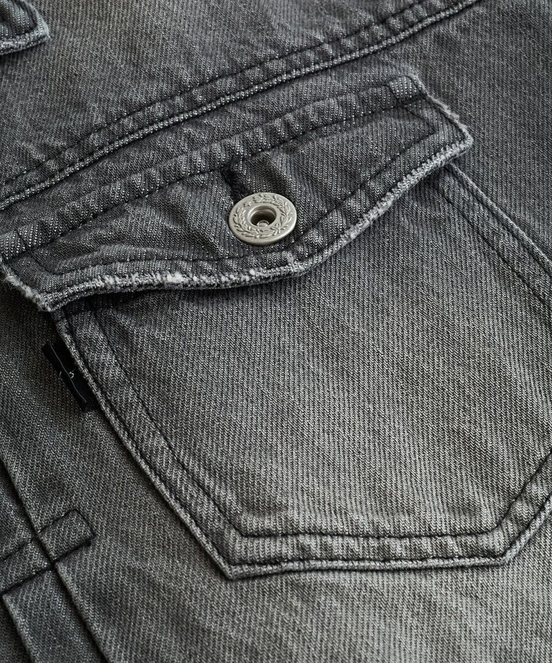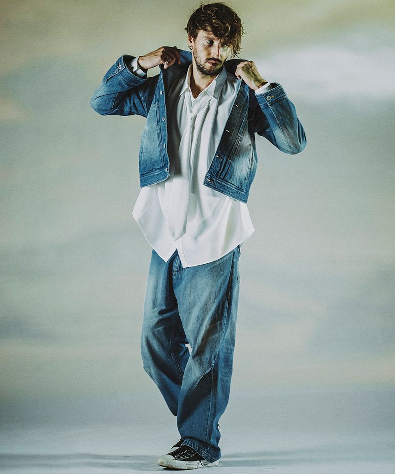 左胸のみ取り付けたフラップポケット、装飾的な役割の他にフロントボタンを締めて着用した時の可動域も確保してくれるフロントプリーツ、バックシンチと呼ばれるリベット補強されたバックルベルト、動きやすさを考慮した背面プリーツ、アルファベットの【T】の様に見える切替などヴィンテージデニムの要素をふんだんに取り入れた本格志向のデザイン。