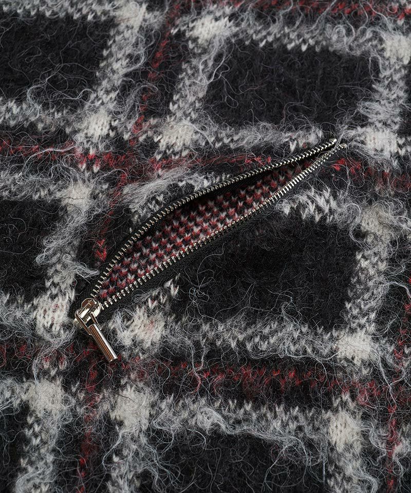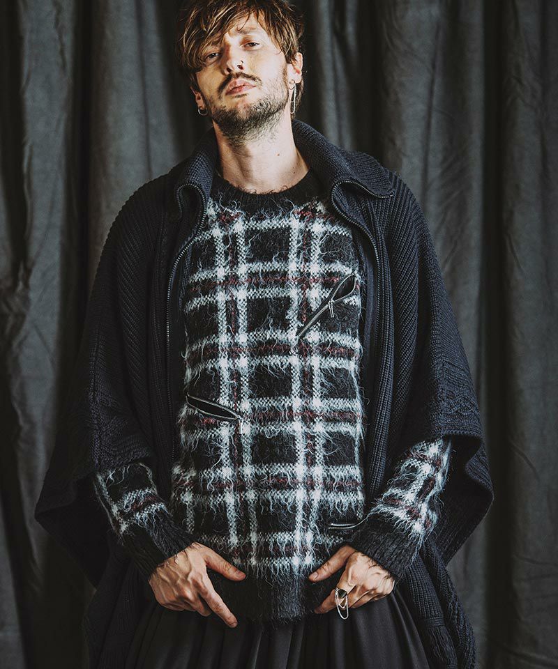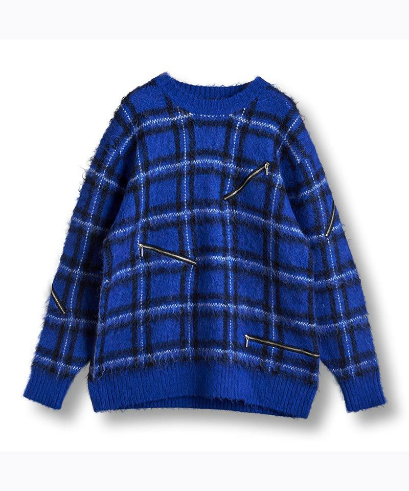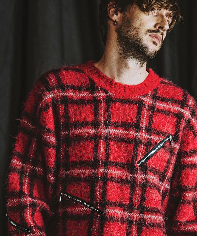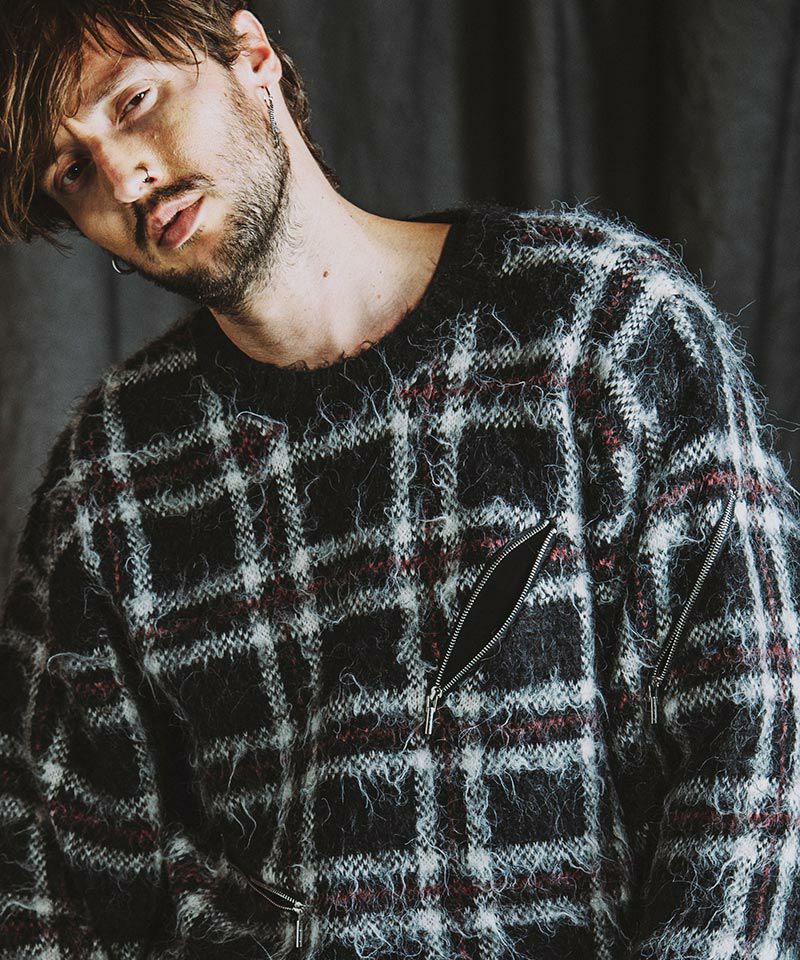 モヘヤ混のふんわりとした毛足の長い起毛感による糸とチェック柄とファスナー使いによりパンクテイスト感じるアイテムに仕上げたオーバーサイズのプルオーバーニット。