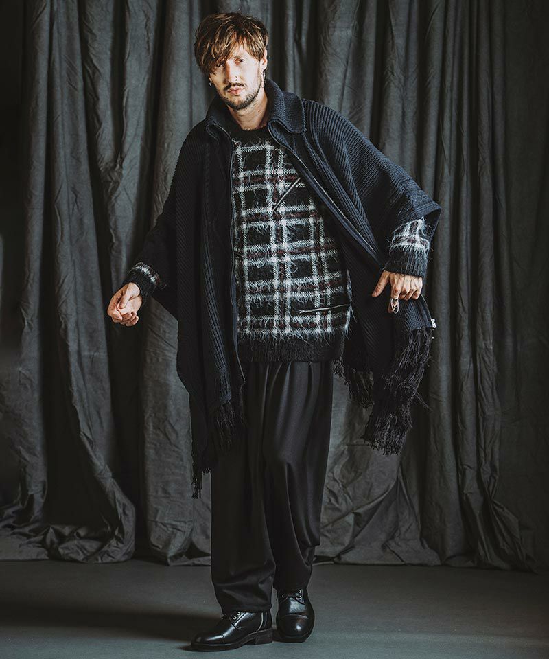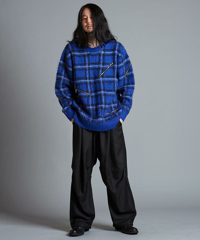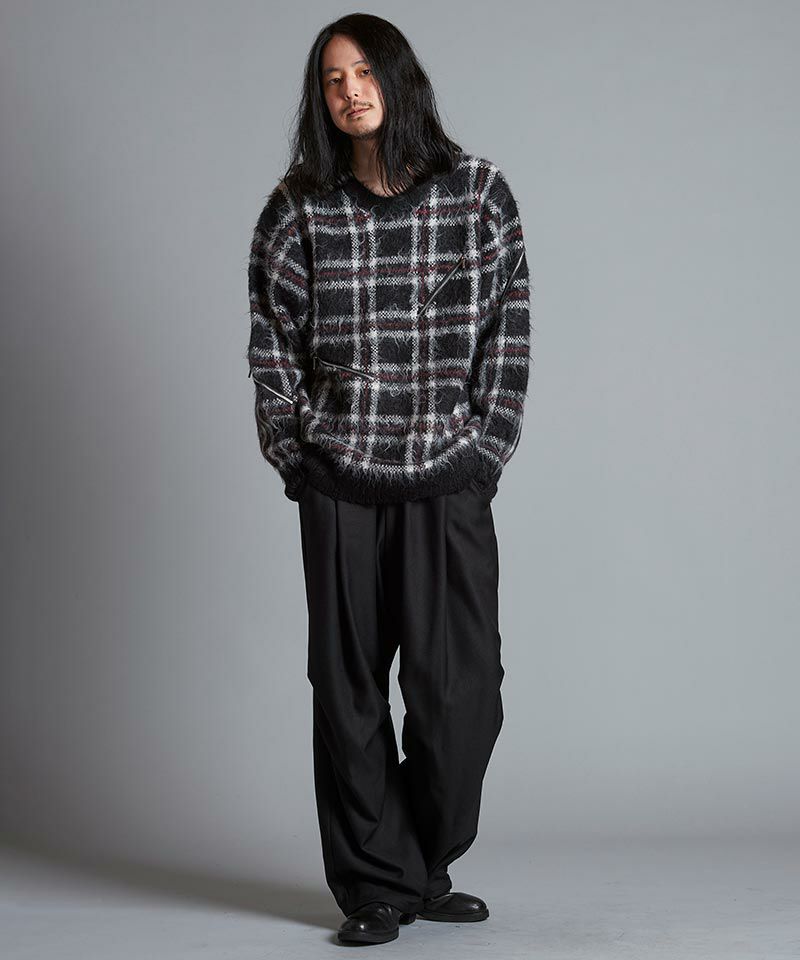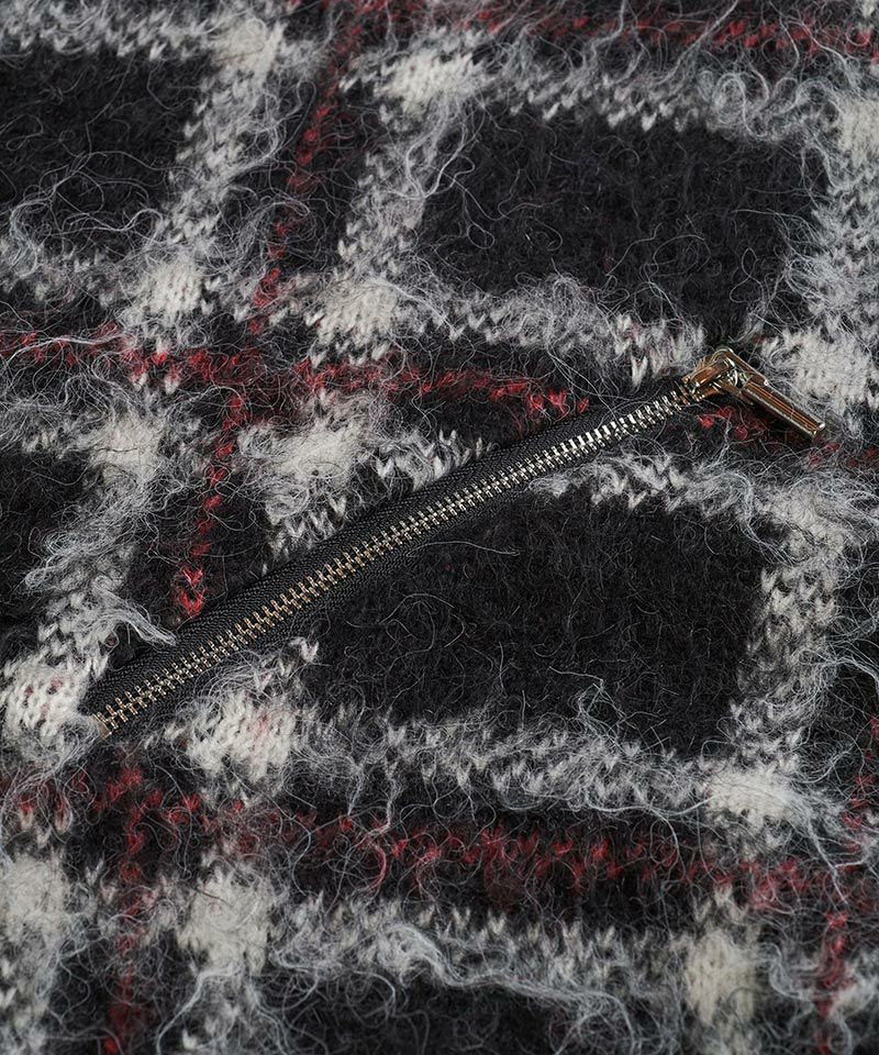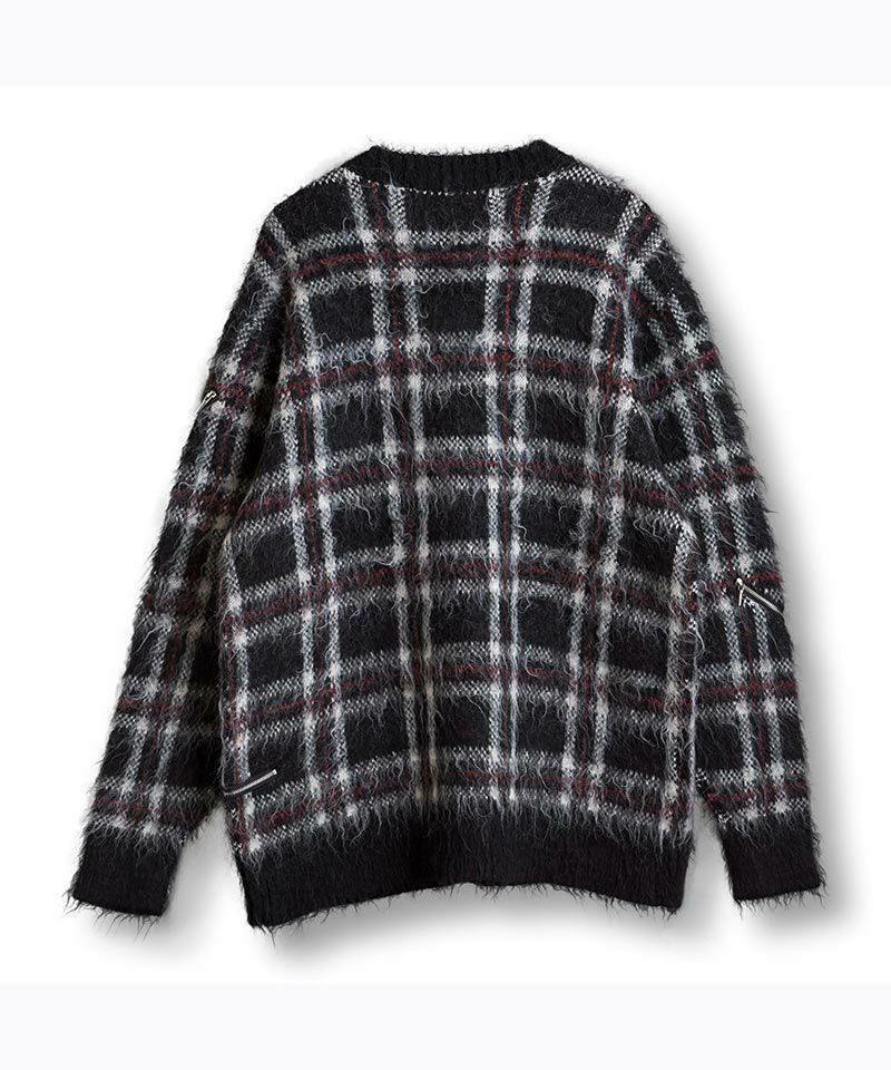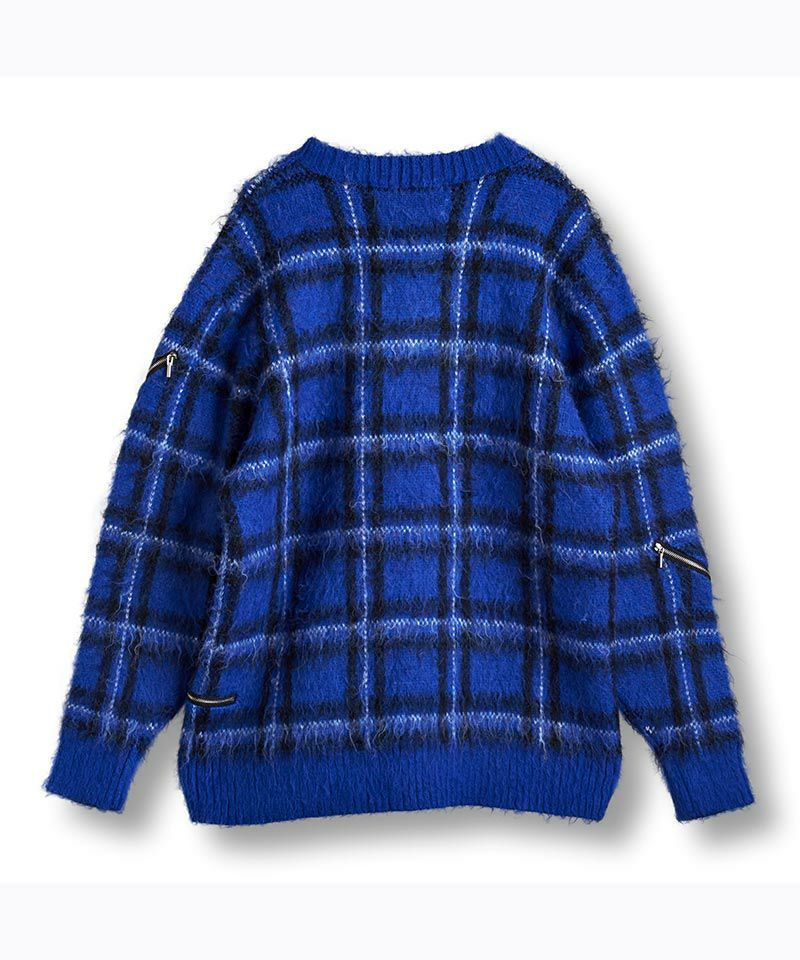 モヘヤ混のふんわりとした毛足の長い起毛感による糸とチェック柄とファスナー使いによりパンクテイスト感じるアイテムに仕上げたオーバーサイズのプルオーバーニット。