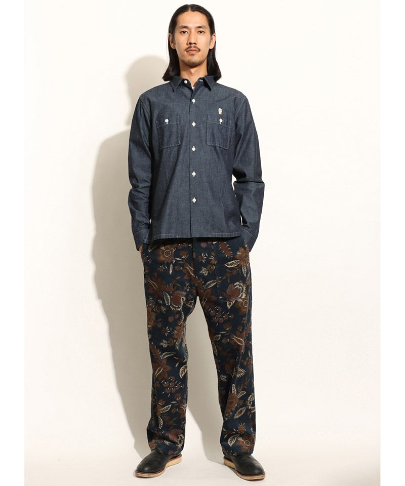 フラワー総柄生地を使用したベイカーパンツ。