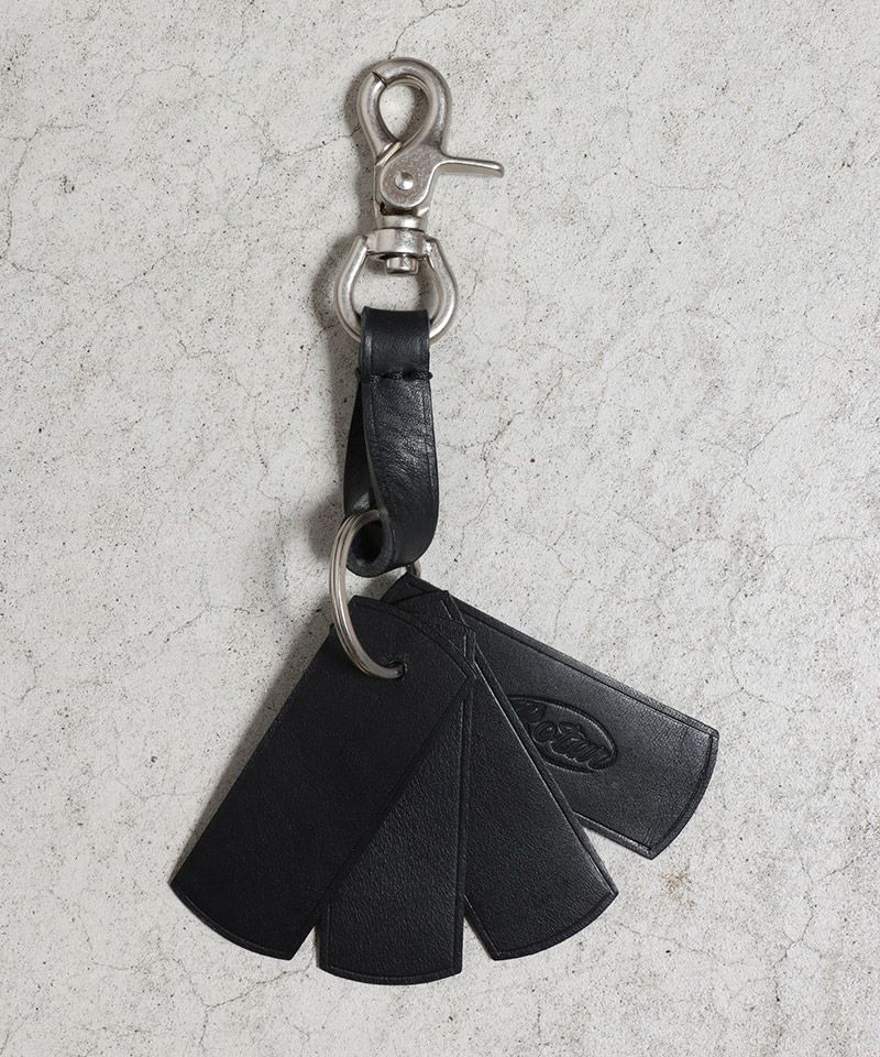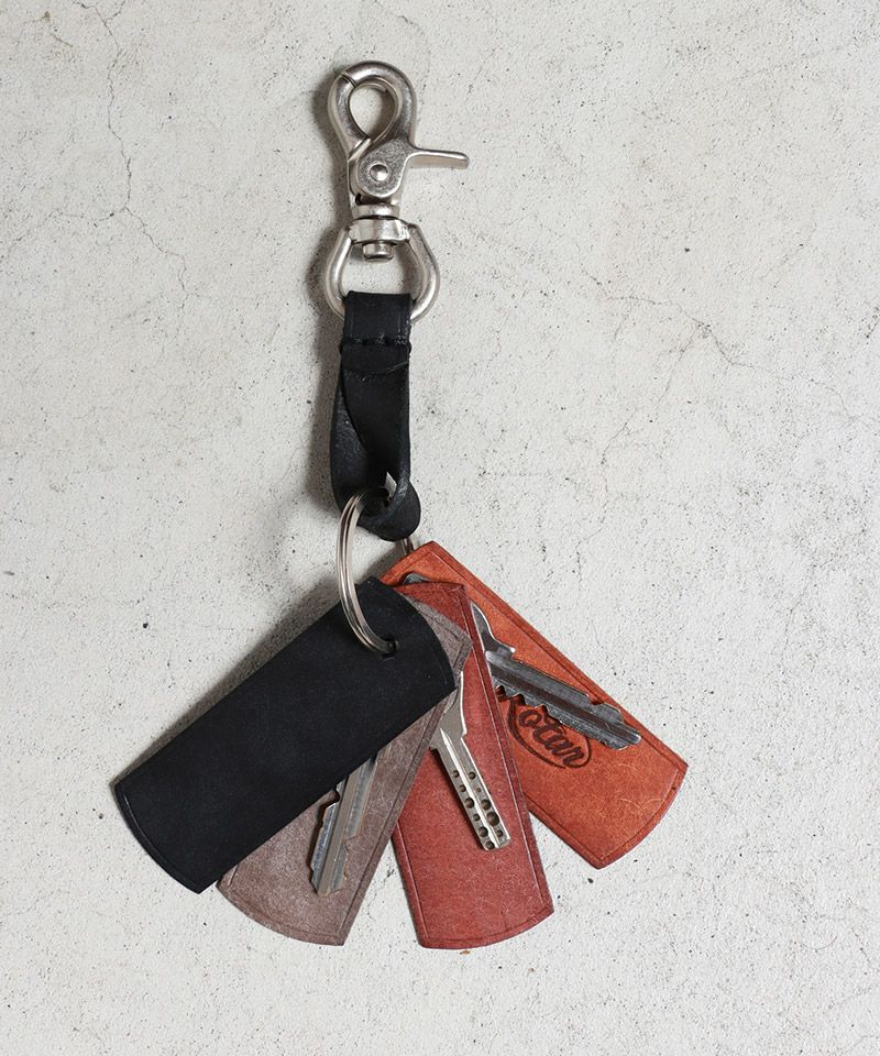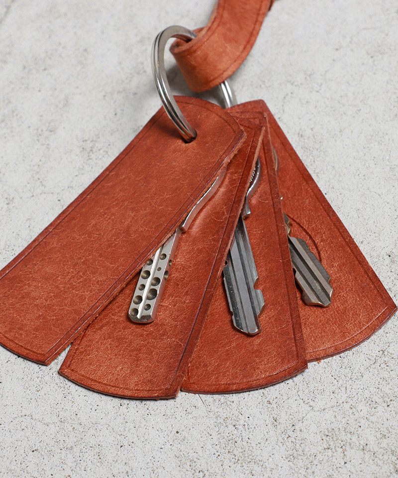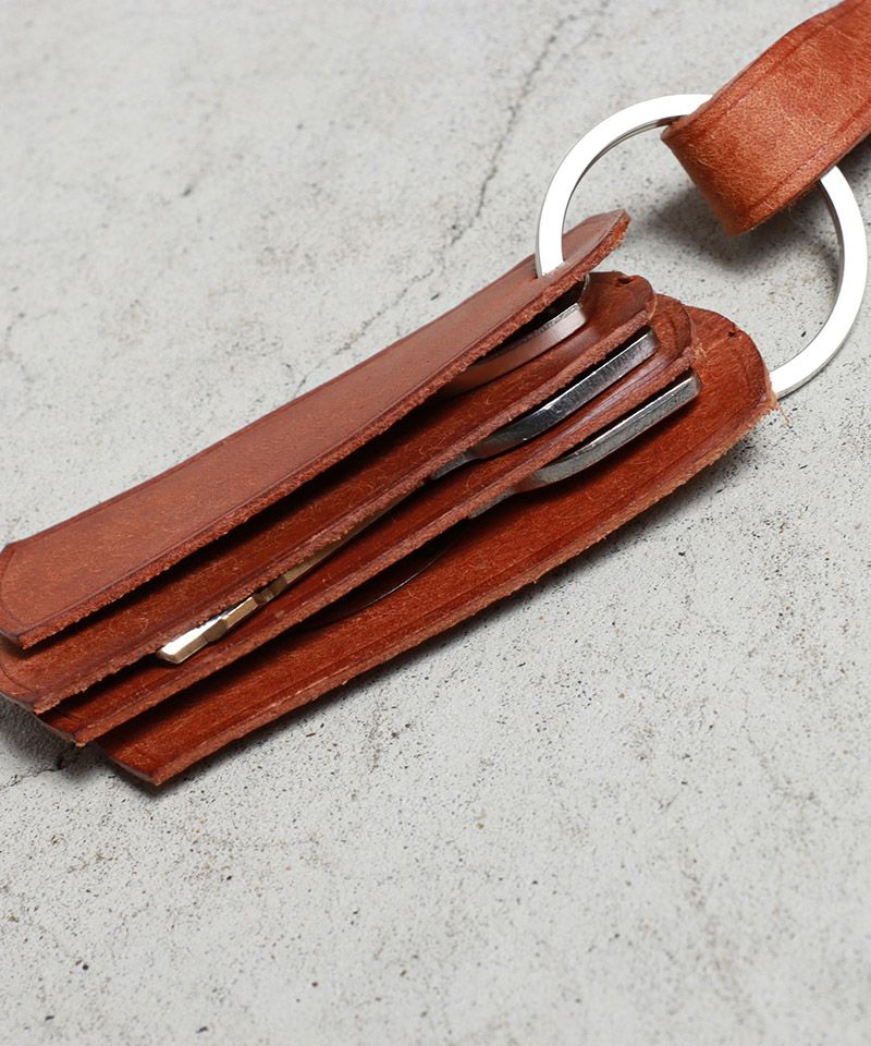 革製のタグが4枚付いており、革の間に鍵を入れることで動いたときに生ずるジャラジャラ音を軽減してくれます。