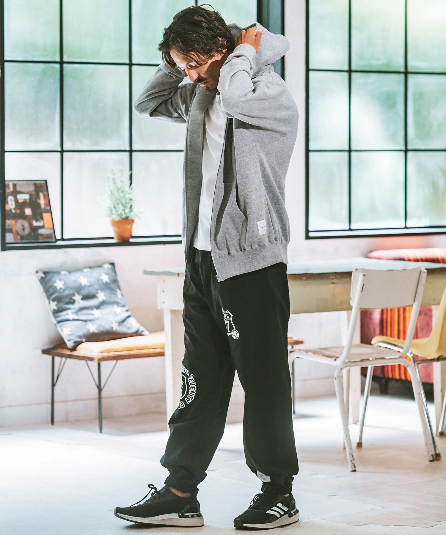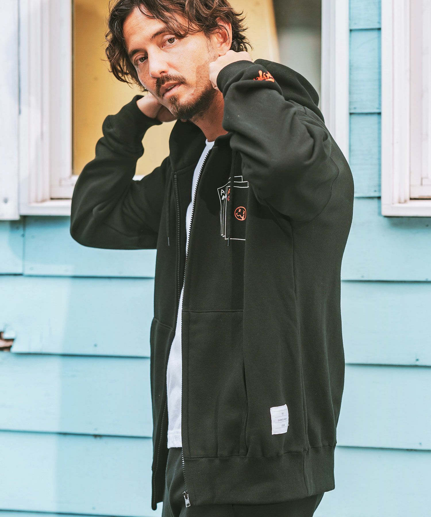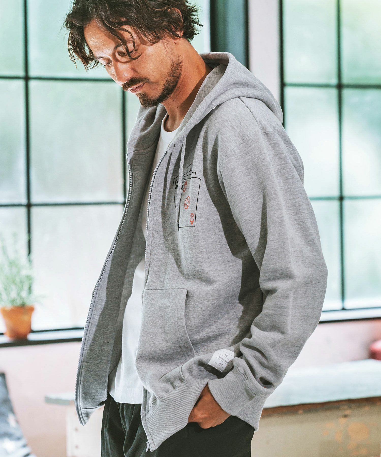 10オンスの裏毛の生地を使用し、スタイリングも合わせやすいベーシックなシルエットを採用したジップアップフーディー。