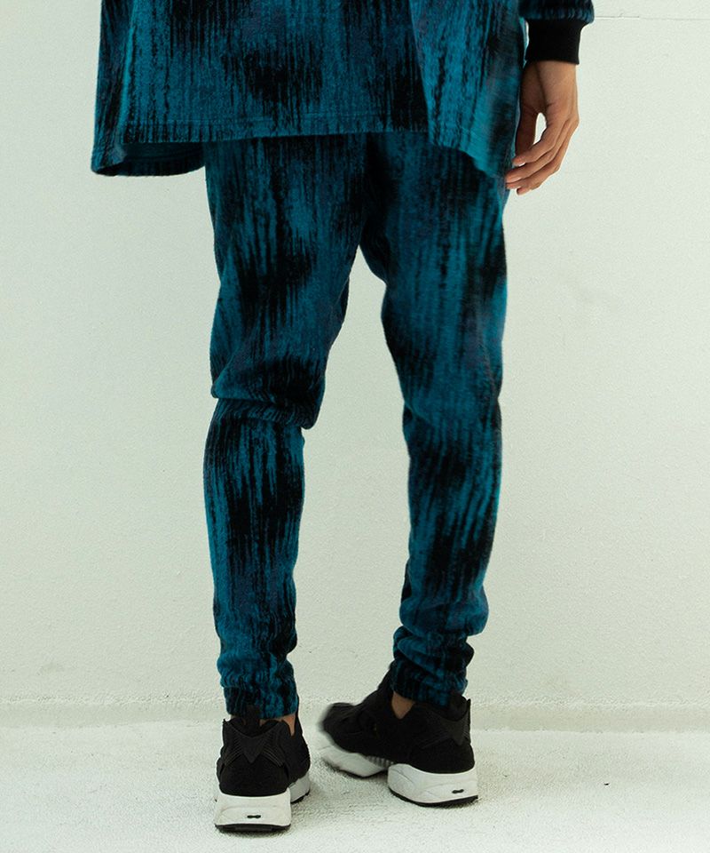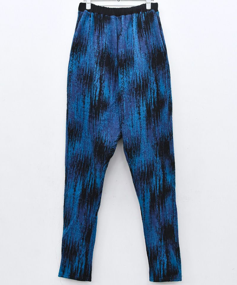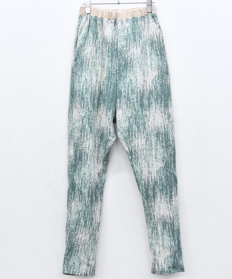 迷彩のような緩やかにうつりかわるような柄に起毛をかけて、さらにぼんやりさせたオリジナルのウールジャカードニット素材で仕立てたシンプルなイージースラックスです。