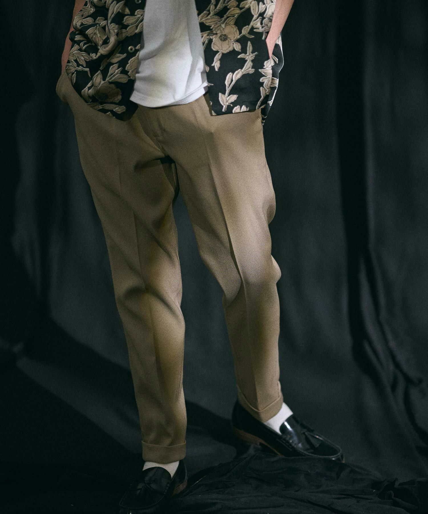 1タックの入ったジャストフィットめな腰回りから裾に向かってしっかりテーパードさせたキレイな細めのシルエット。