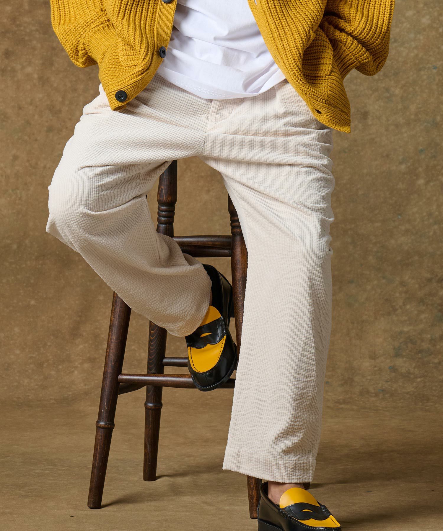 コーデュロイ×サッカーのワイドシルエットパンツ。