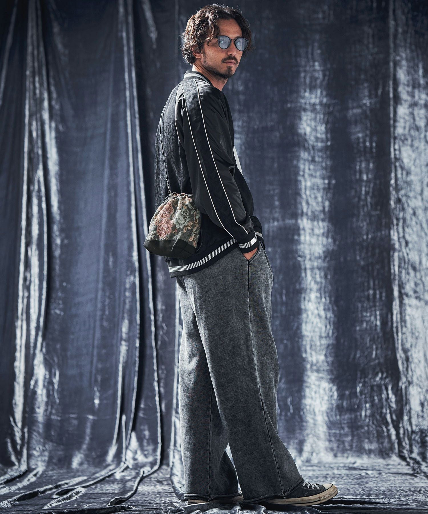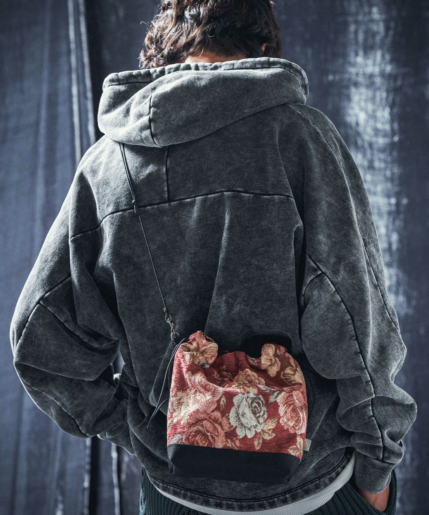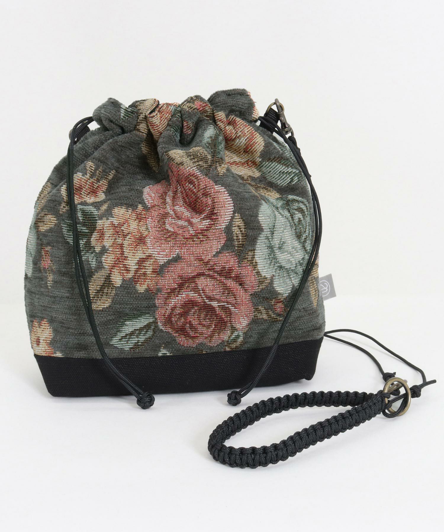 巾着をモチーフにしたデザイン性とボタニカルテキスタイルがマッチしたレトロな雰囲気が特徴。
