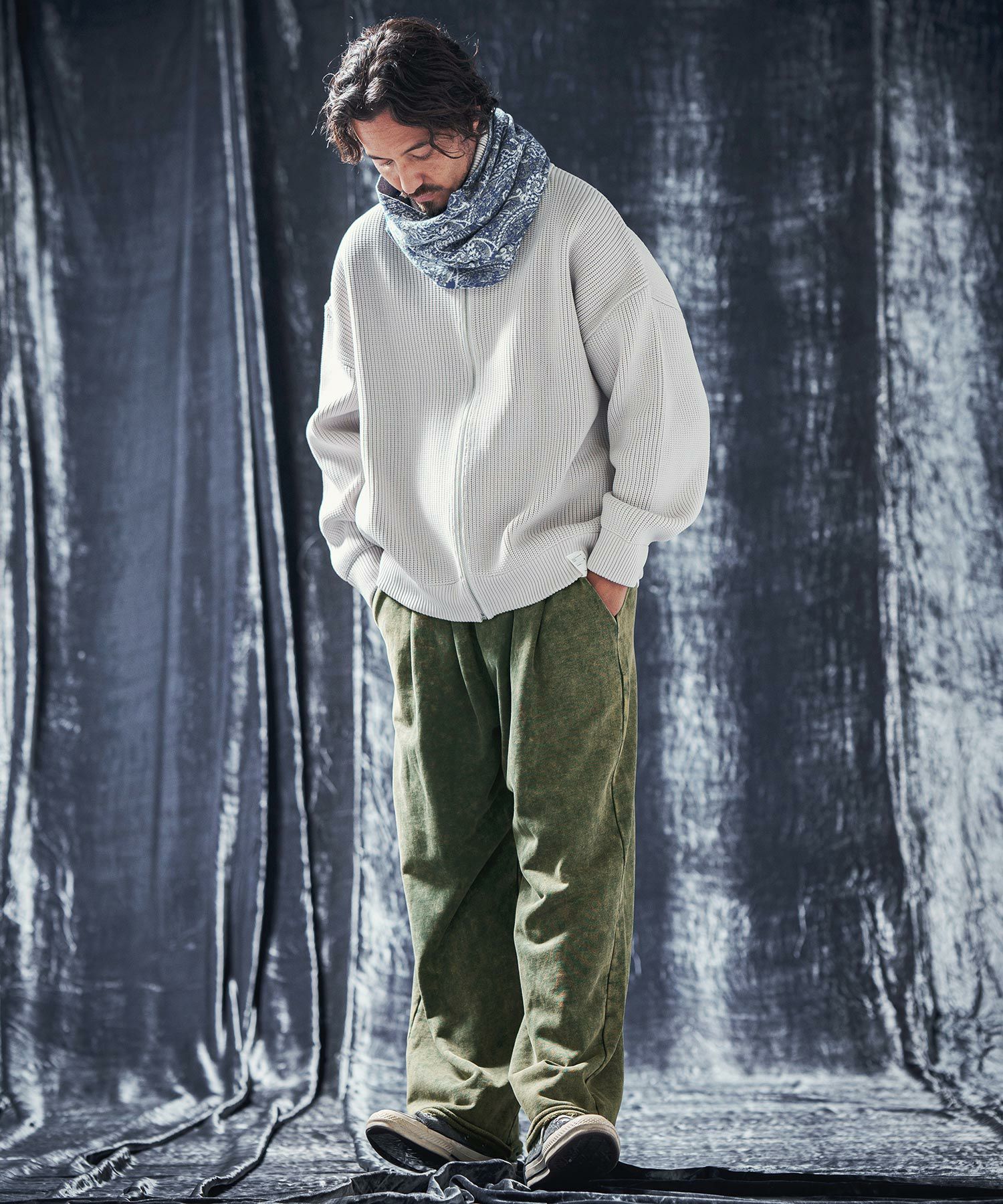 カジュアルなスタイリングは勿論のこと、キレイなトップスの外し要素での着合わせも面白い1着です。