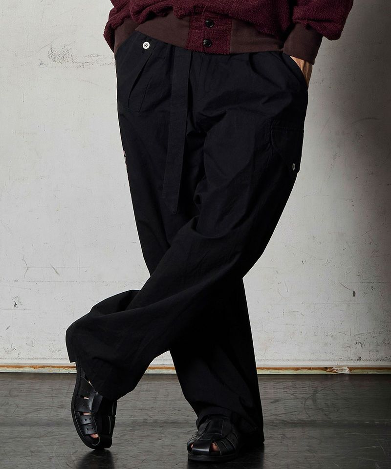 私の大好きなアイテムを融合させたこのパンツは、共生地で長めに作ったベルトもアクセントになっています。