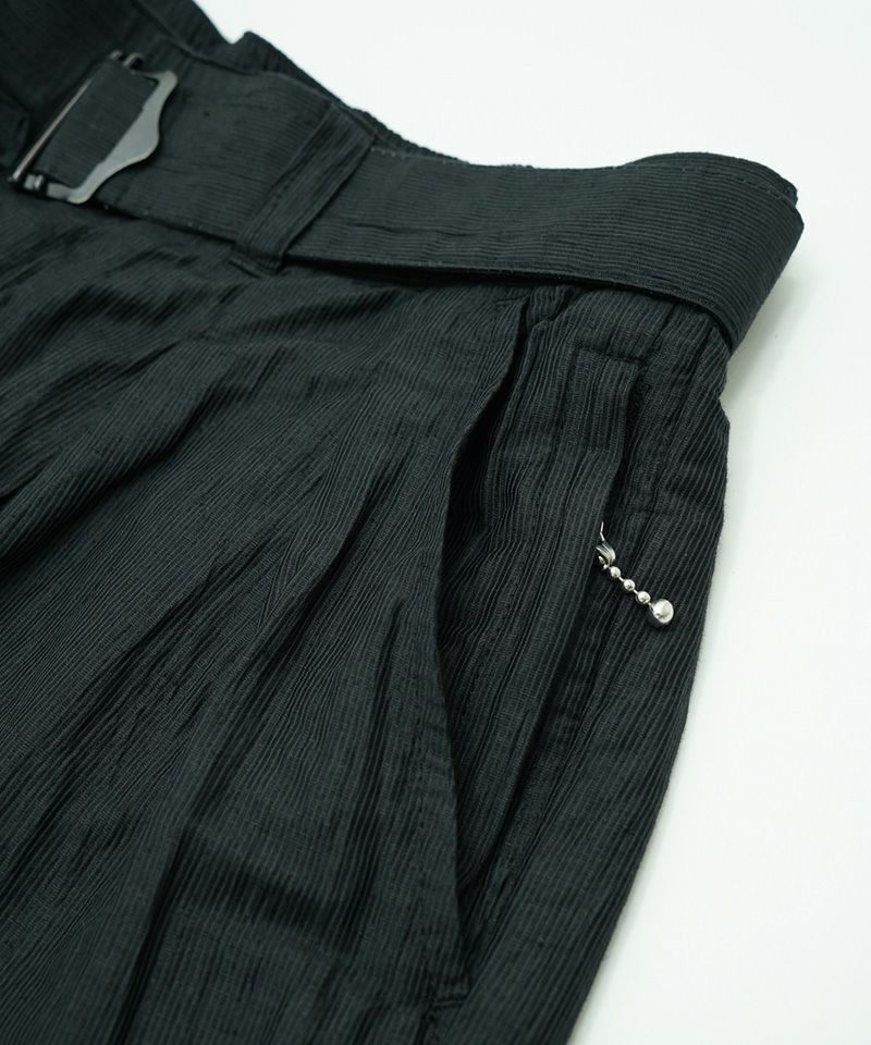 ゆったりとしたリラックス感のある穿き心地ながら、タックとベルト使いでフォーマル感もプラス。