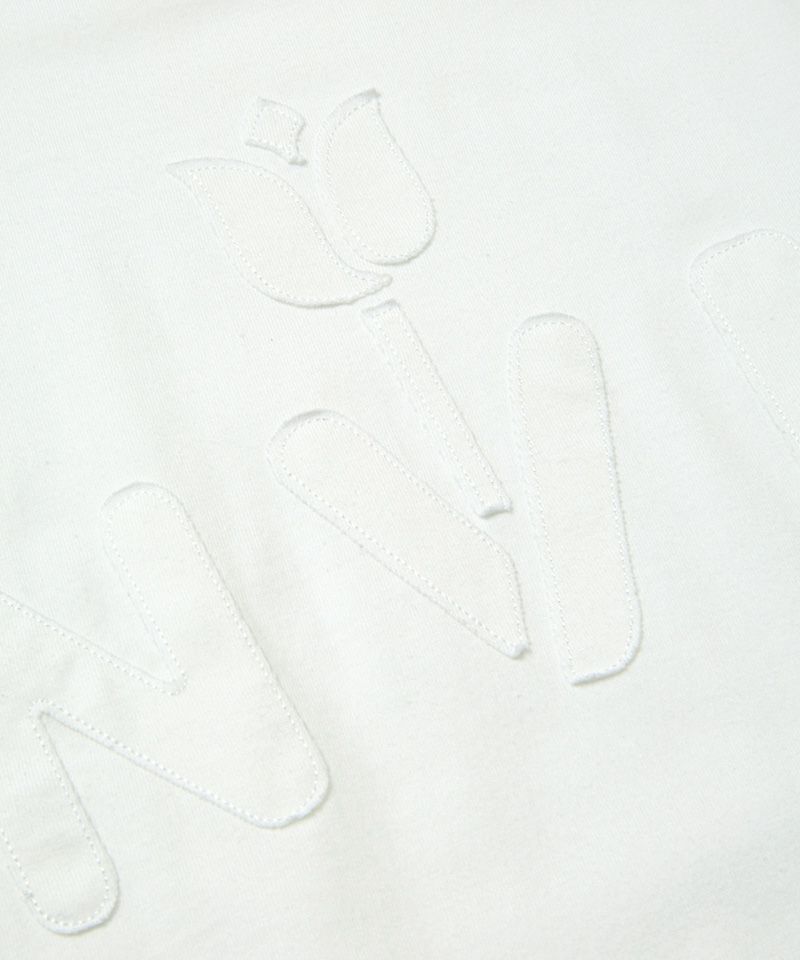 立体感のあるロゴを同色の生地の縫い付け刺繍で表現したTシャツ。
