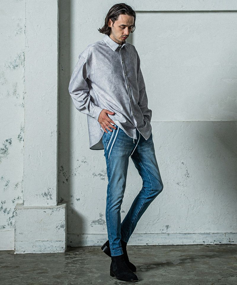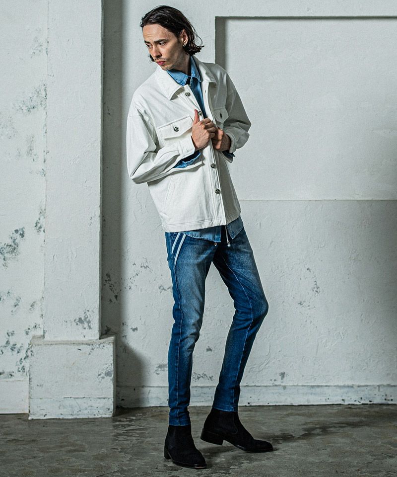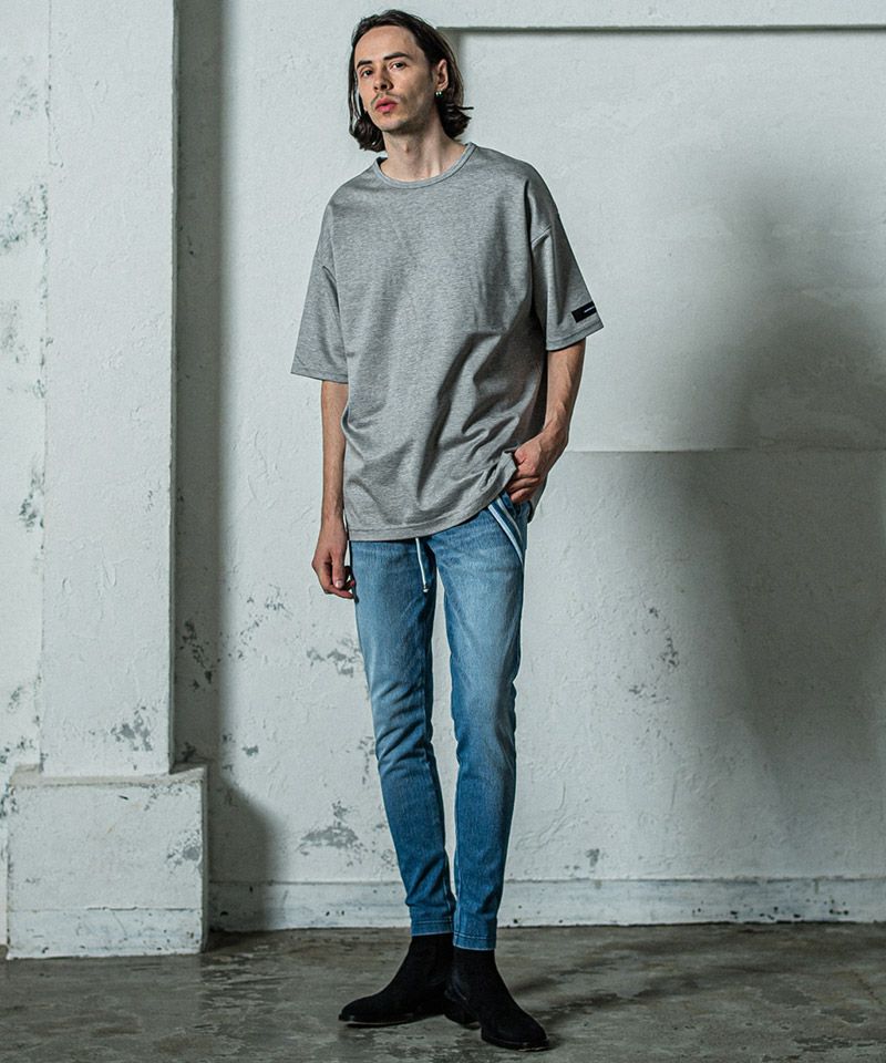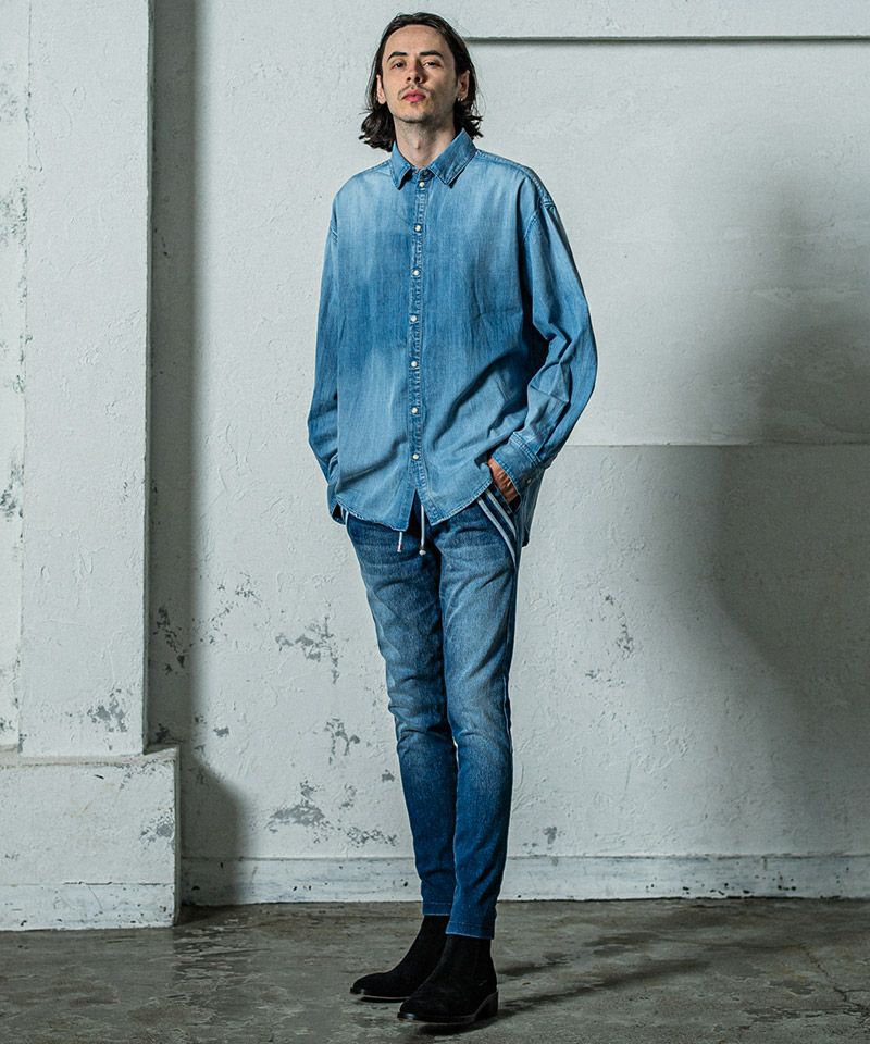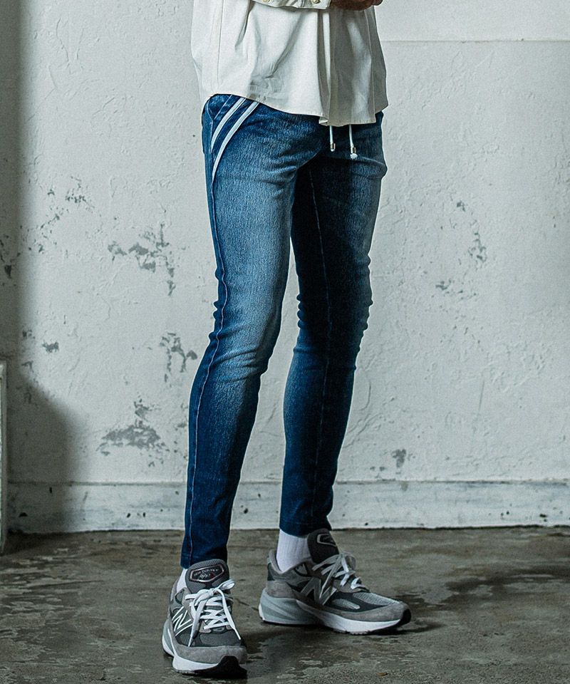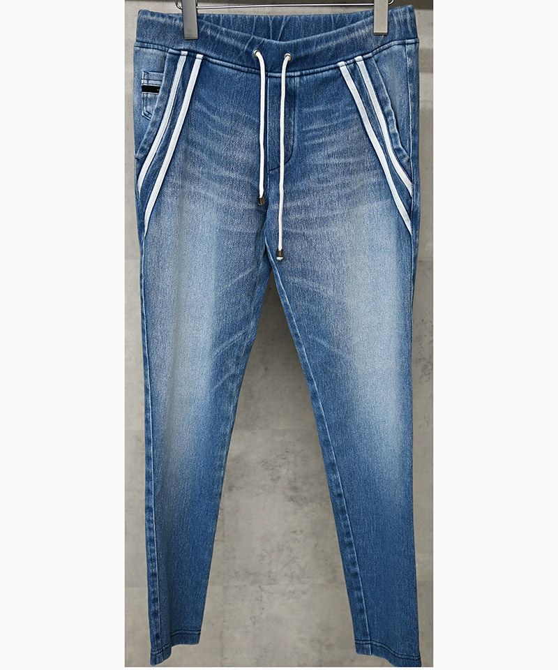 エッジの効いたスラッシュポケットに合わせダブルラインを入れた、エッジラインパンツのデニムジャージバージョン。