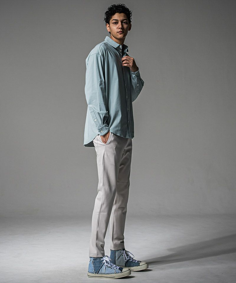 素材はJohnsonラインパンツ に使用しているハリがありながら驚くほど伸縮し、復元力も強くしなやかな手触りの360°ストレッチ素材コットンより軽く、そして速乾性を兼ね備えた高機能ナイロンマイクロファイバー。