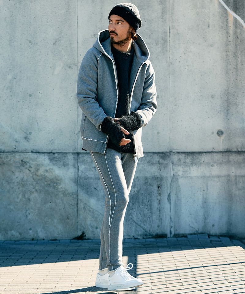 ・糸本来の持つ独特なヘアリー感に加えて、製品起毛を施すことで更に膨らみと起毛感が増し、ラグジュアリーな印象を与える仕上がりになっている。