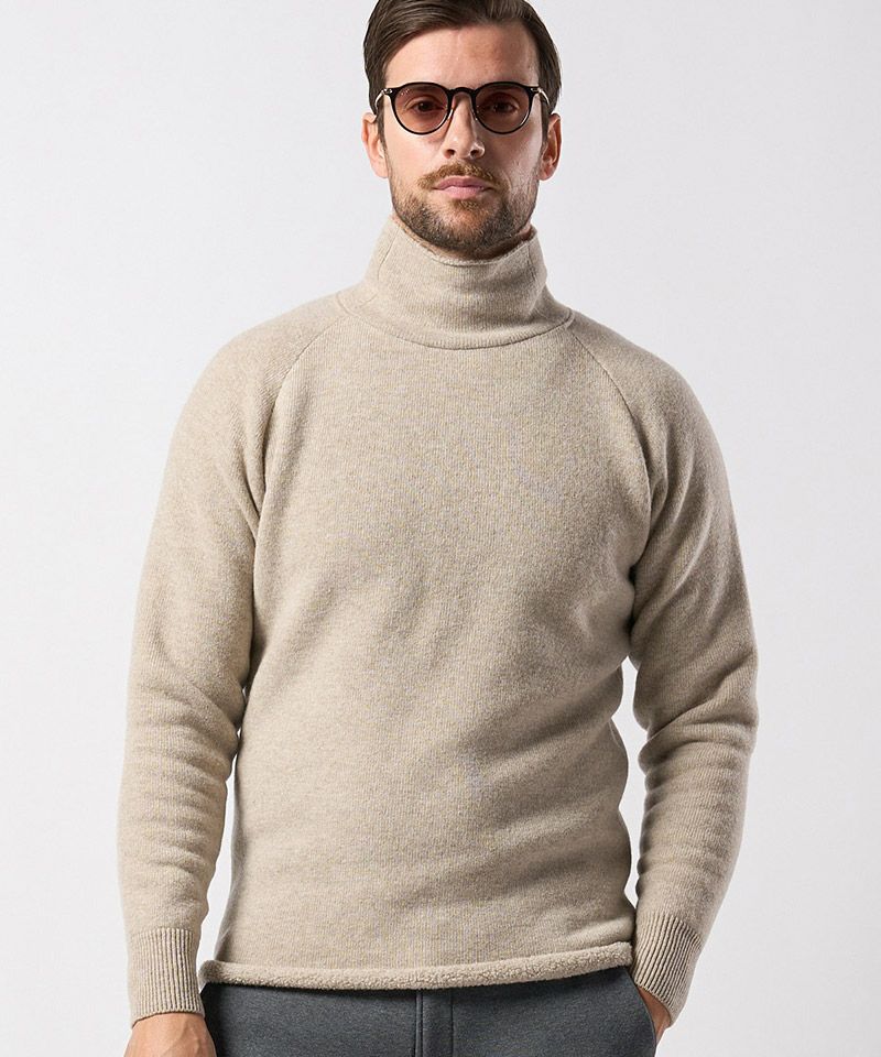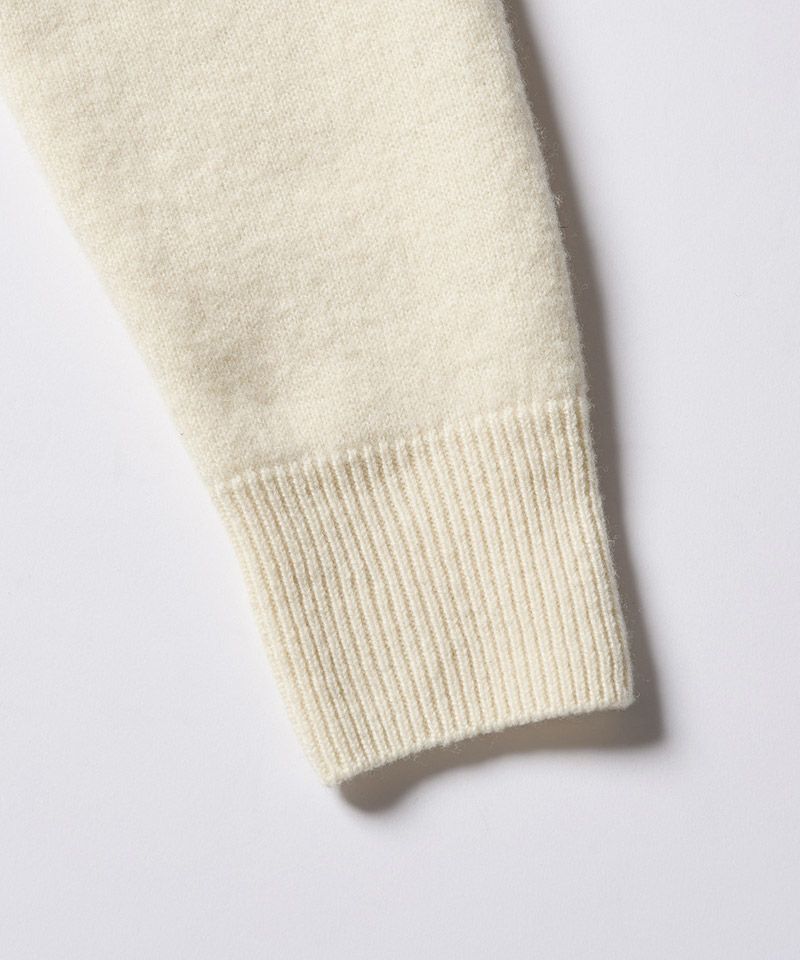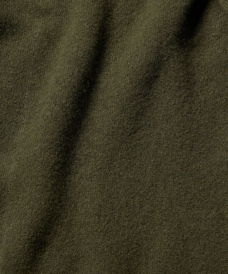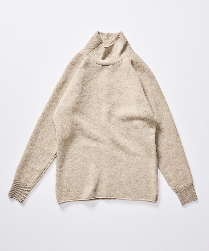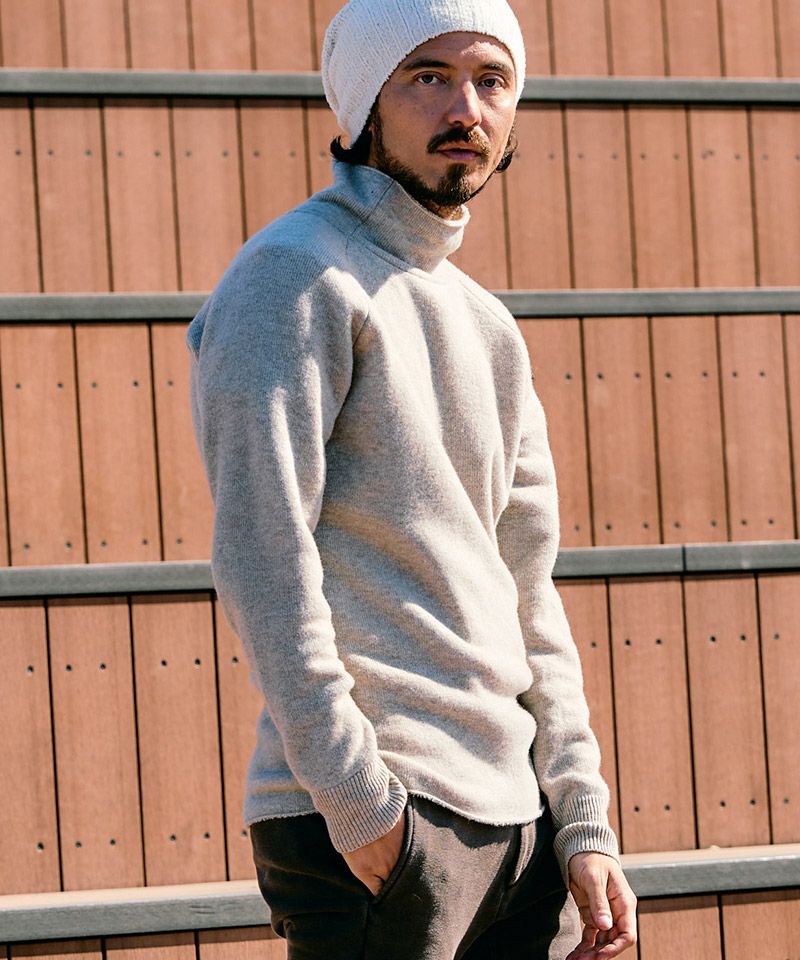 スポンジのように空気をふんだんに含んだふくらみのある軽い肌触りが特徴のウールパイルニットで作製することで、冬のインナーとして重宝する一着に仕上げた。