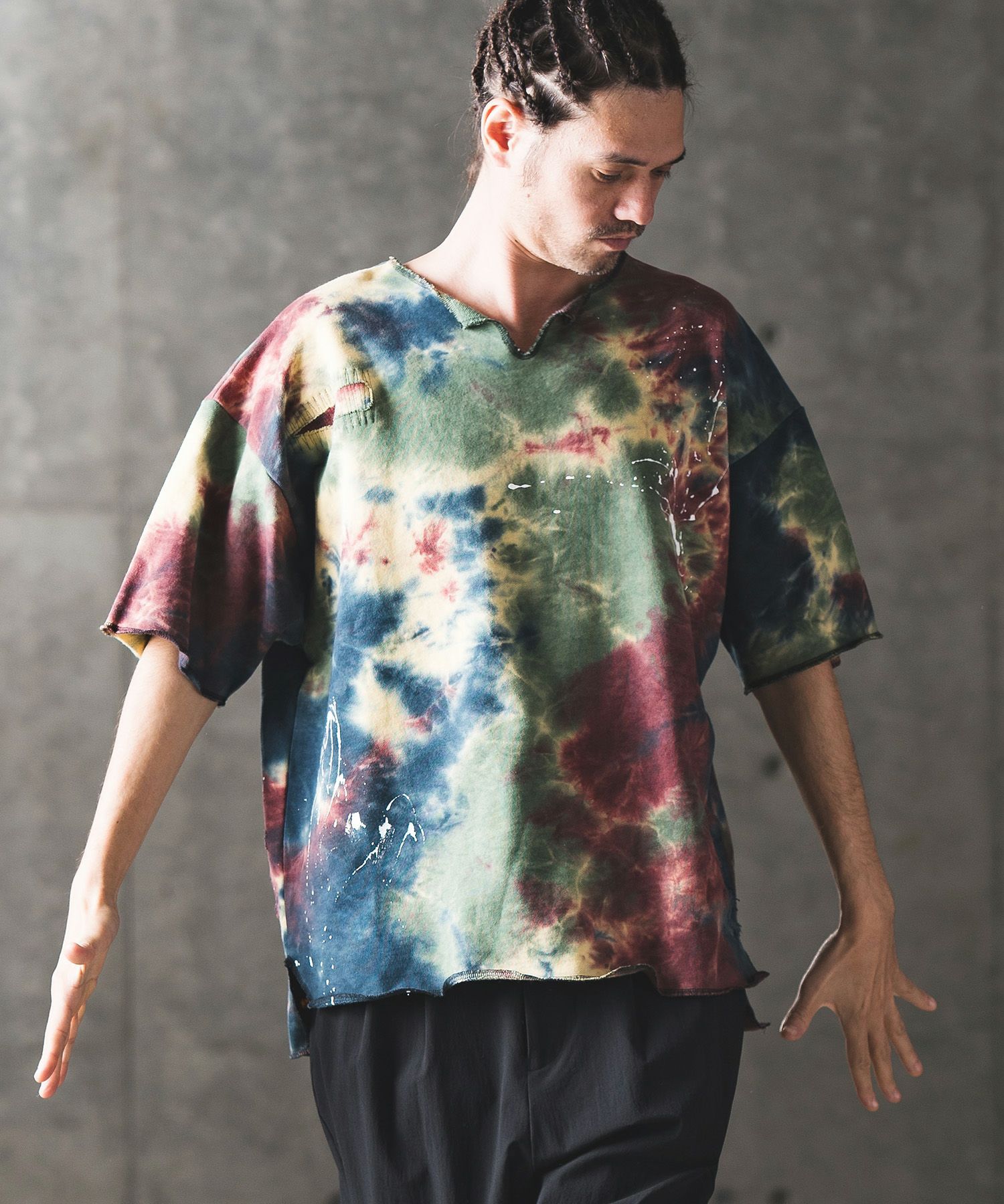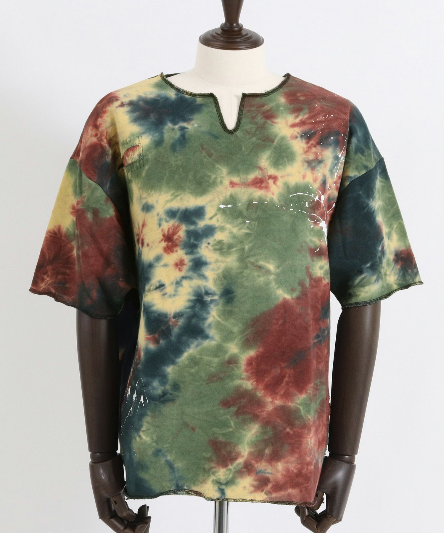 ■タイダイ染めスウェット生地を使用した半袖カットソー、首周りはキーネックデザインに、身頃にはダメージ・リペア加工とペンキ散らし風ペイントを施しユーズドライクな表現もミックス、リメイク古着をオマージュした1着、個性的な仕上がりです。
