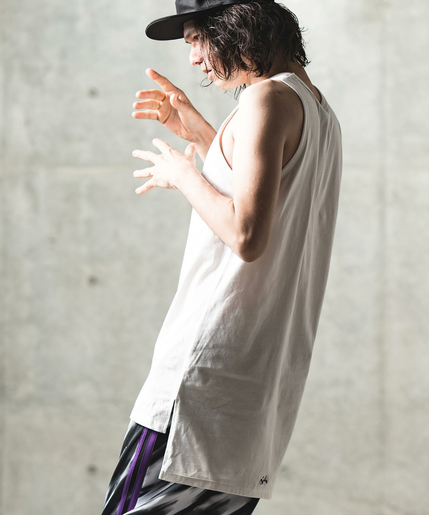 ■ロングレングス仕上げのタンクトップ、T-shirtや羽織りアイテムのインナー合わせのアクセントアイテムとしてデイリーユースな着合わせやすさが魅力的です。