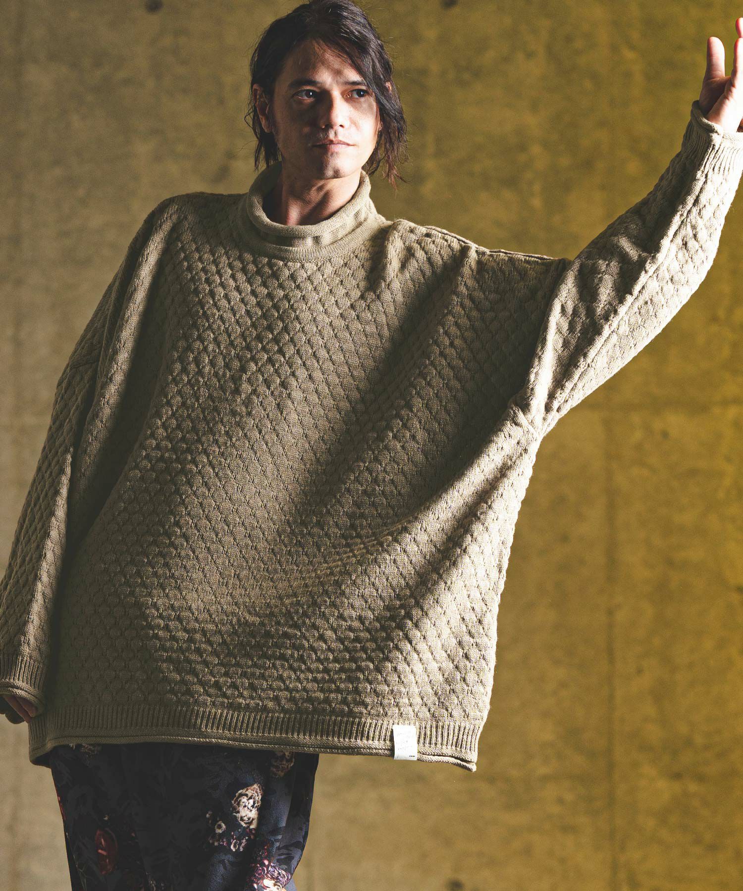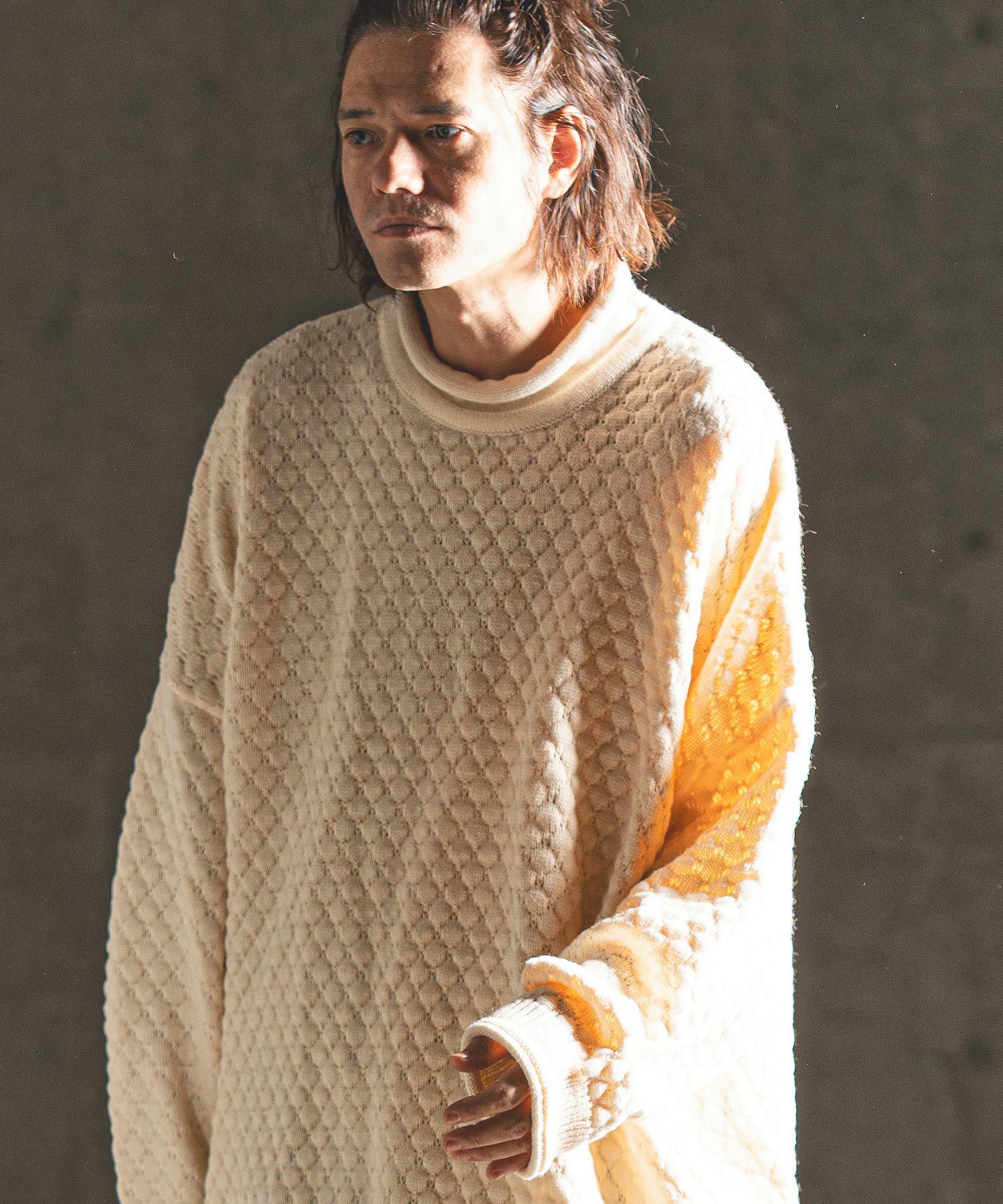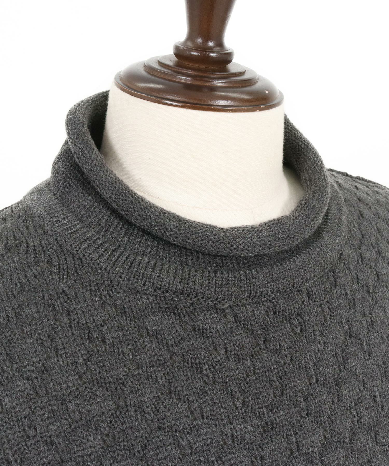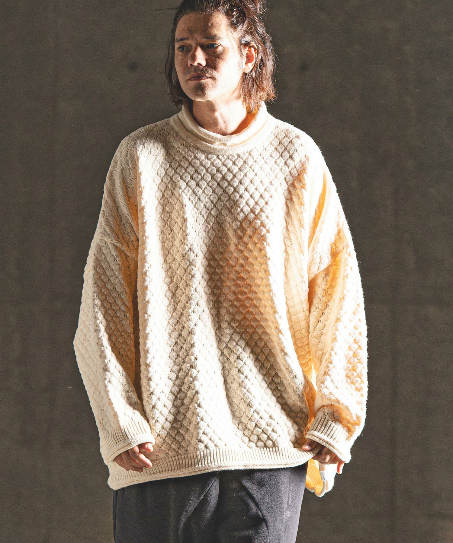 タートルネックとハイネックの中間的な襟高設定のルーズネックがクシュっとしたラフな首周りを演出。
