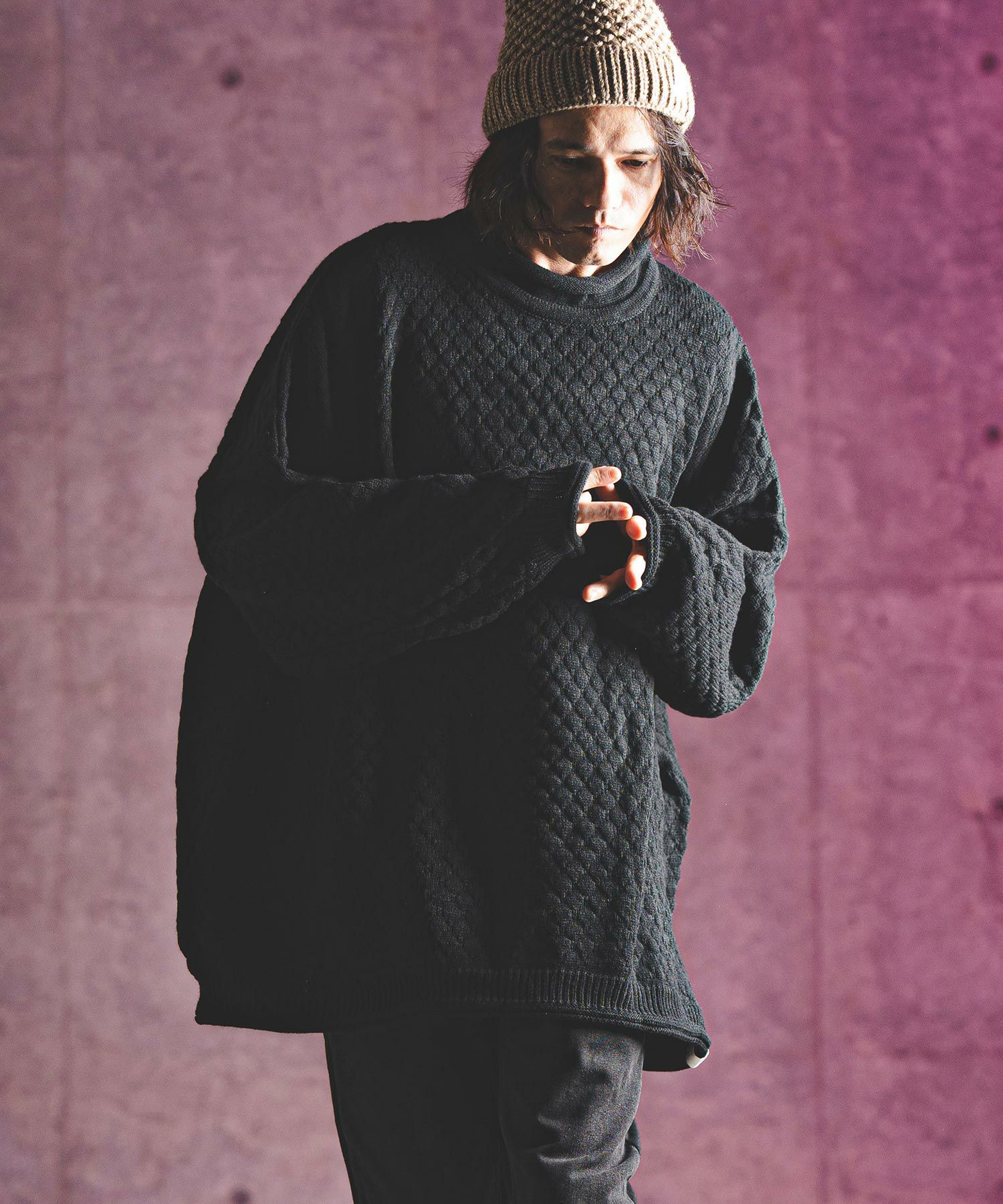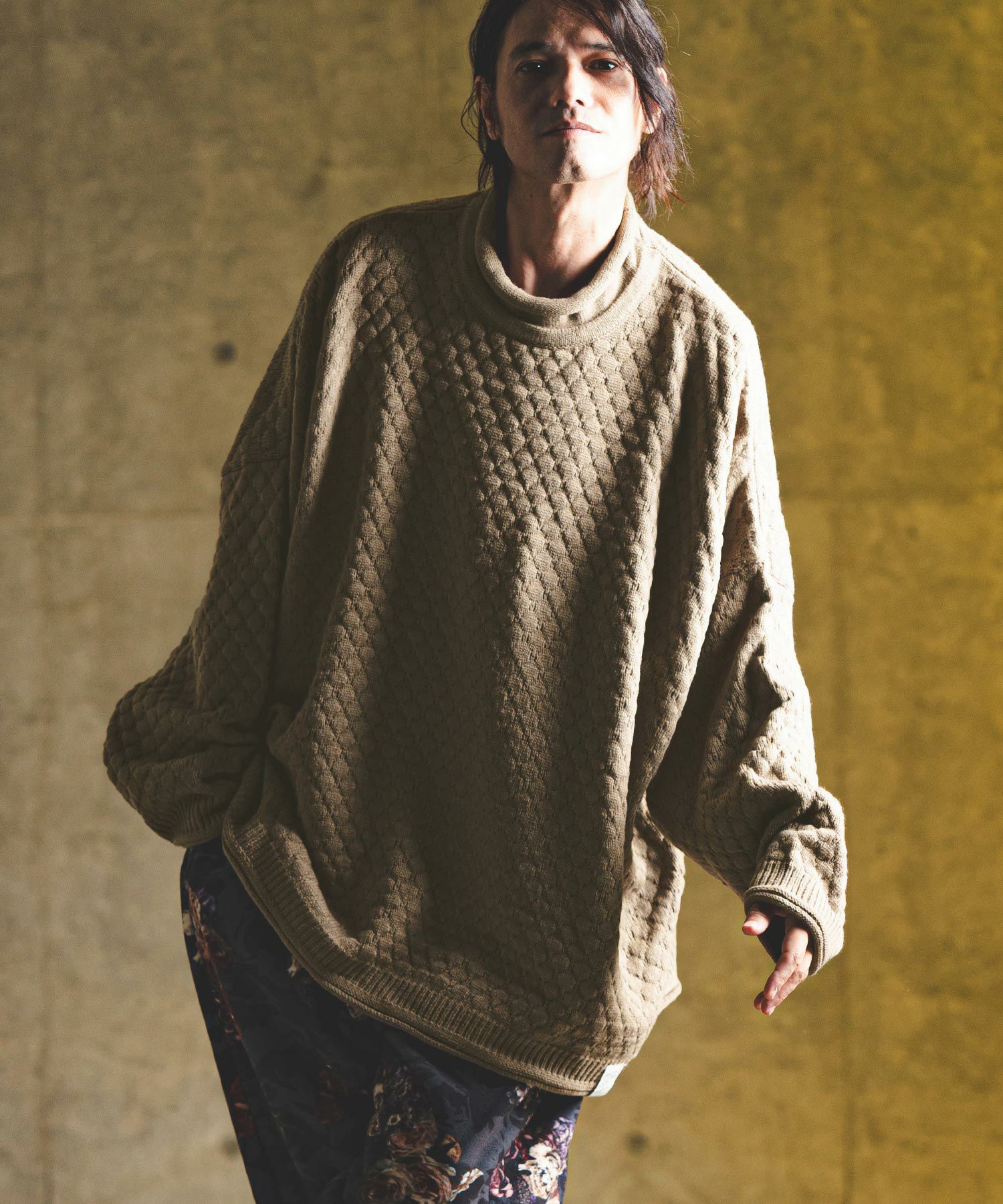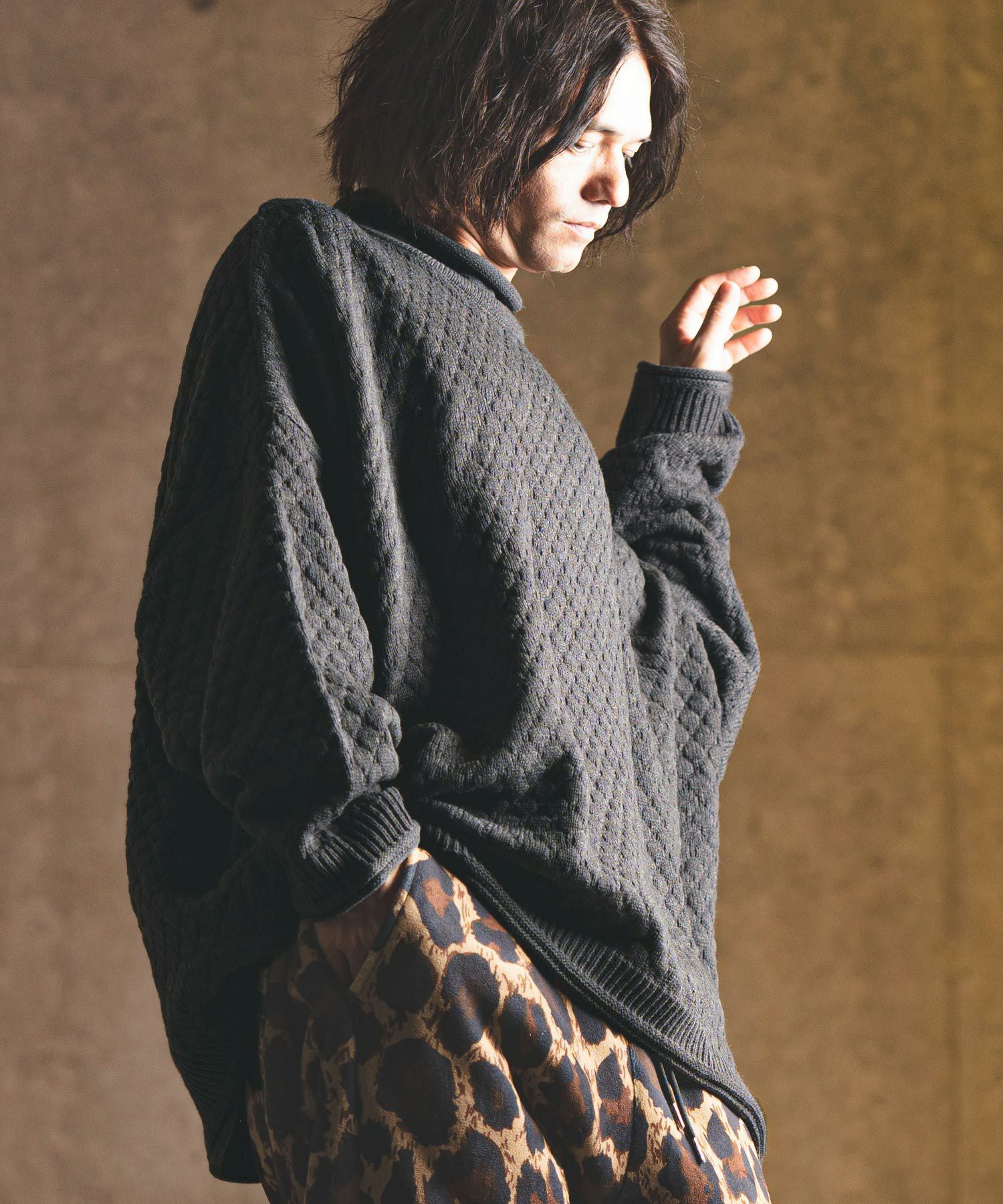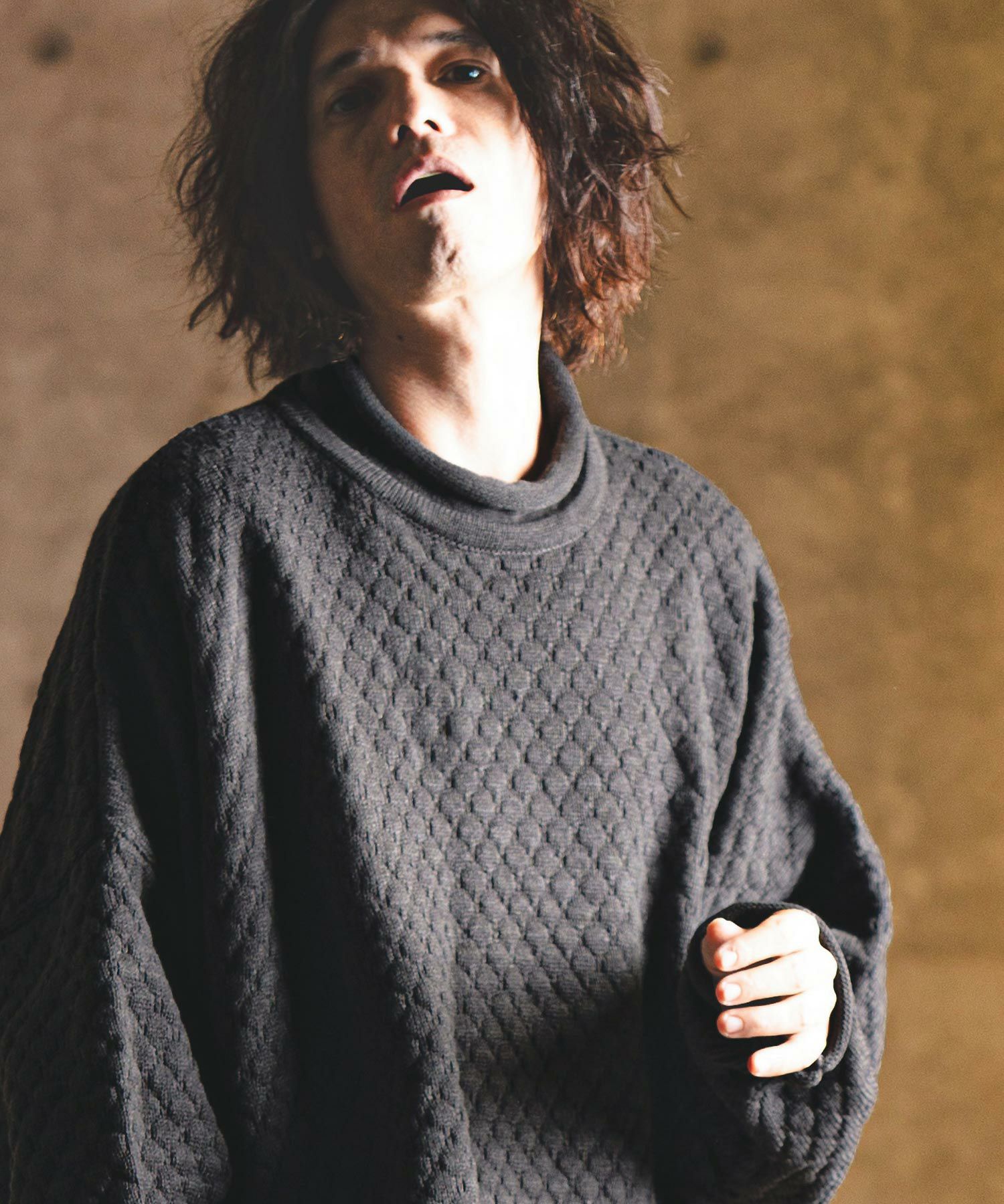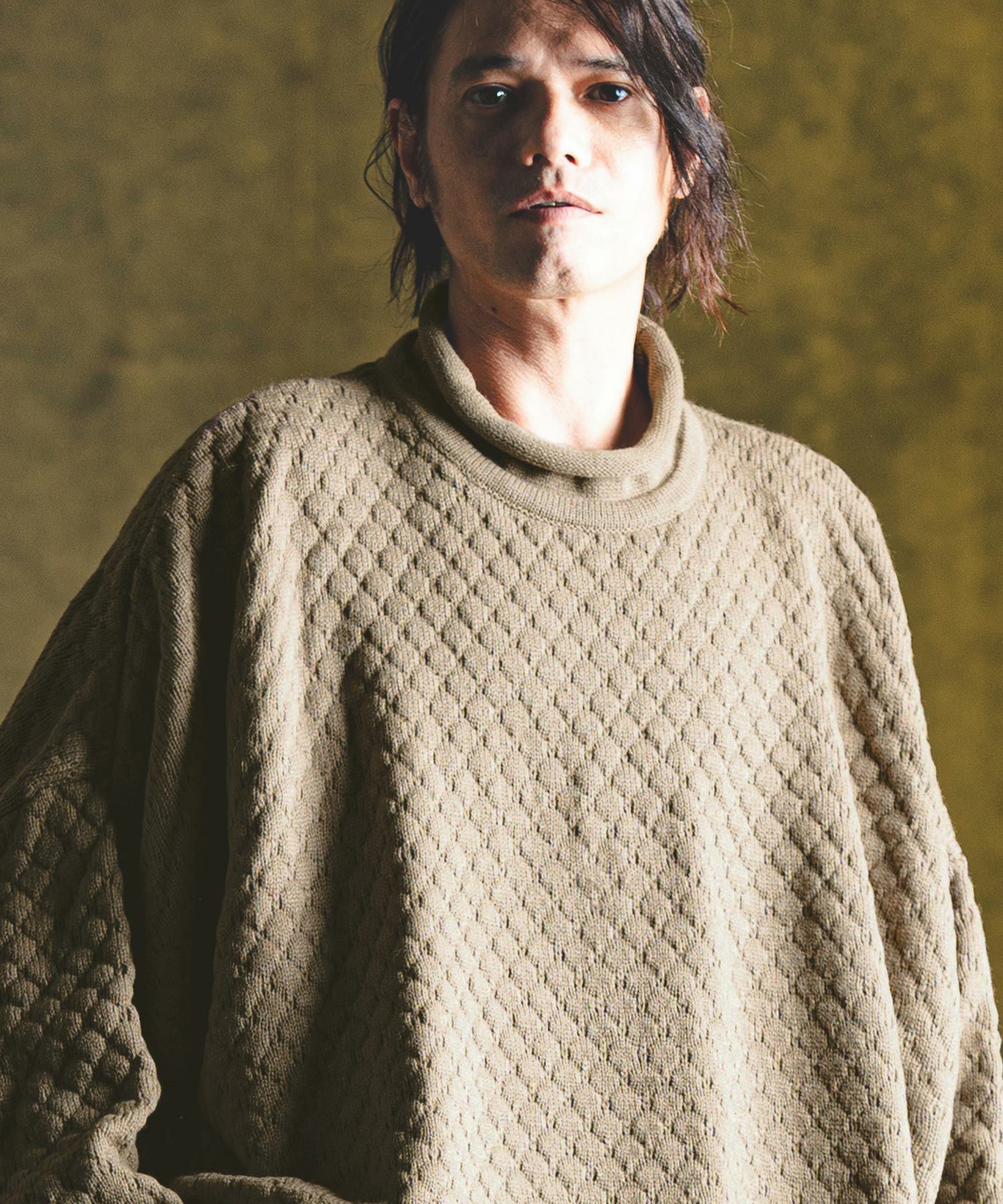 タートルネックとハイネックの中間的な襟高設定のルーズネックがクシュっとしたラフな首周りを演出。