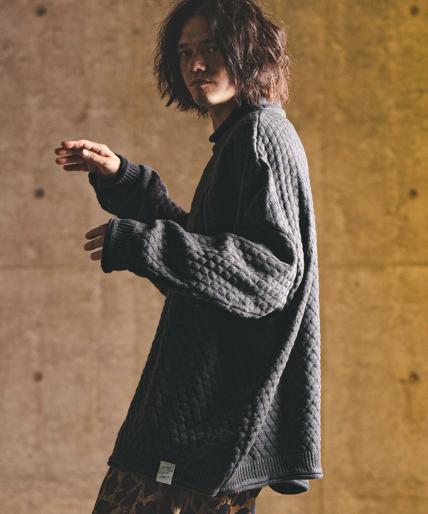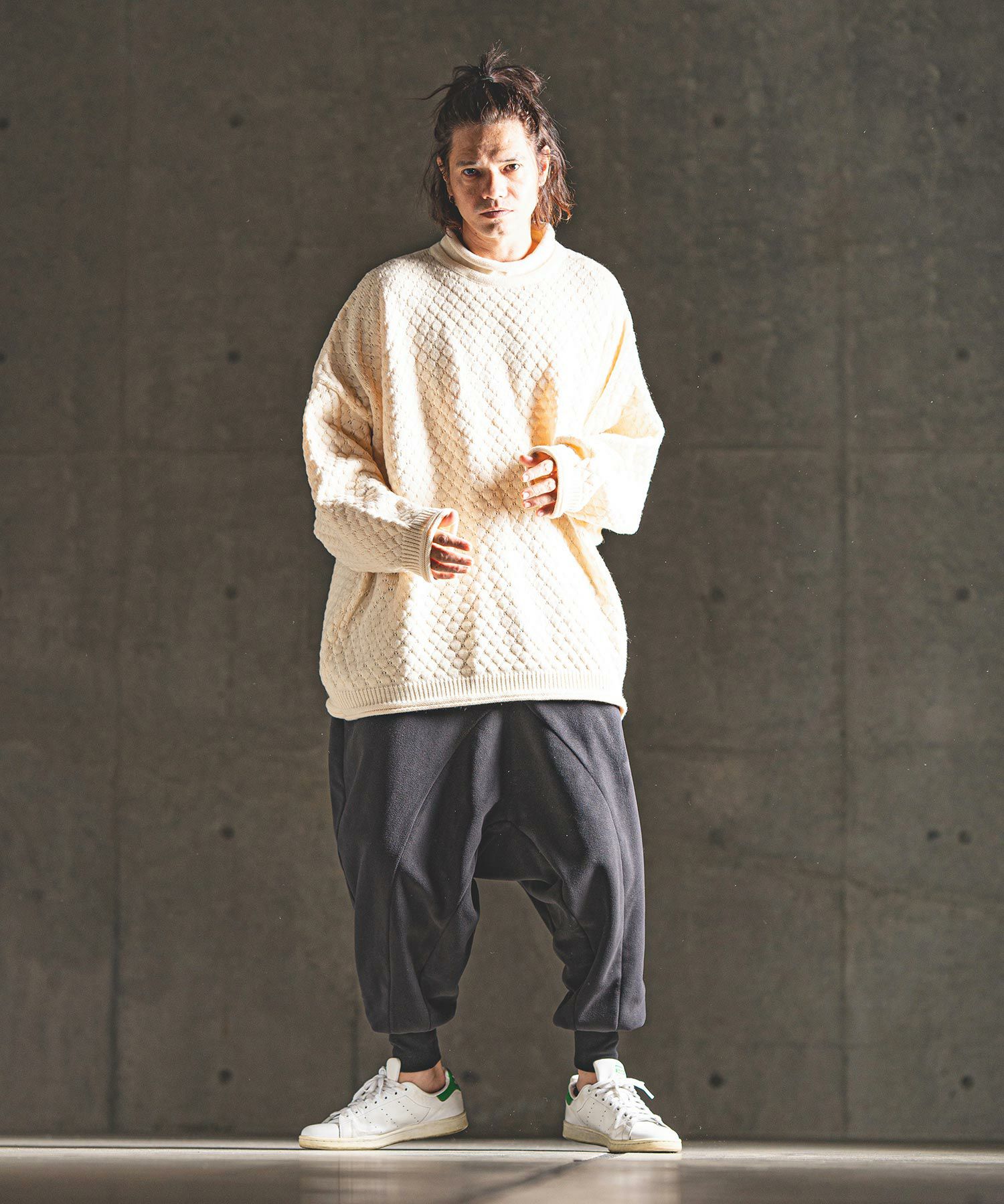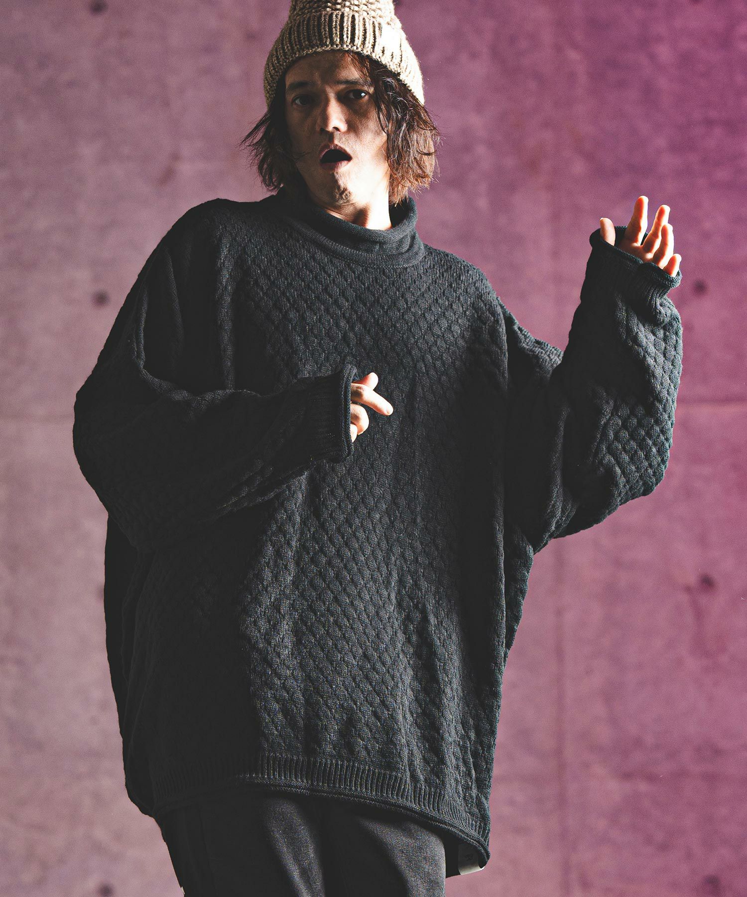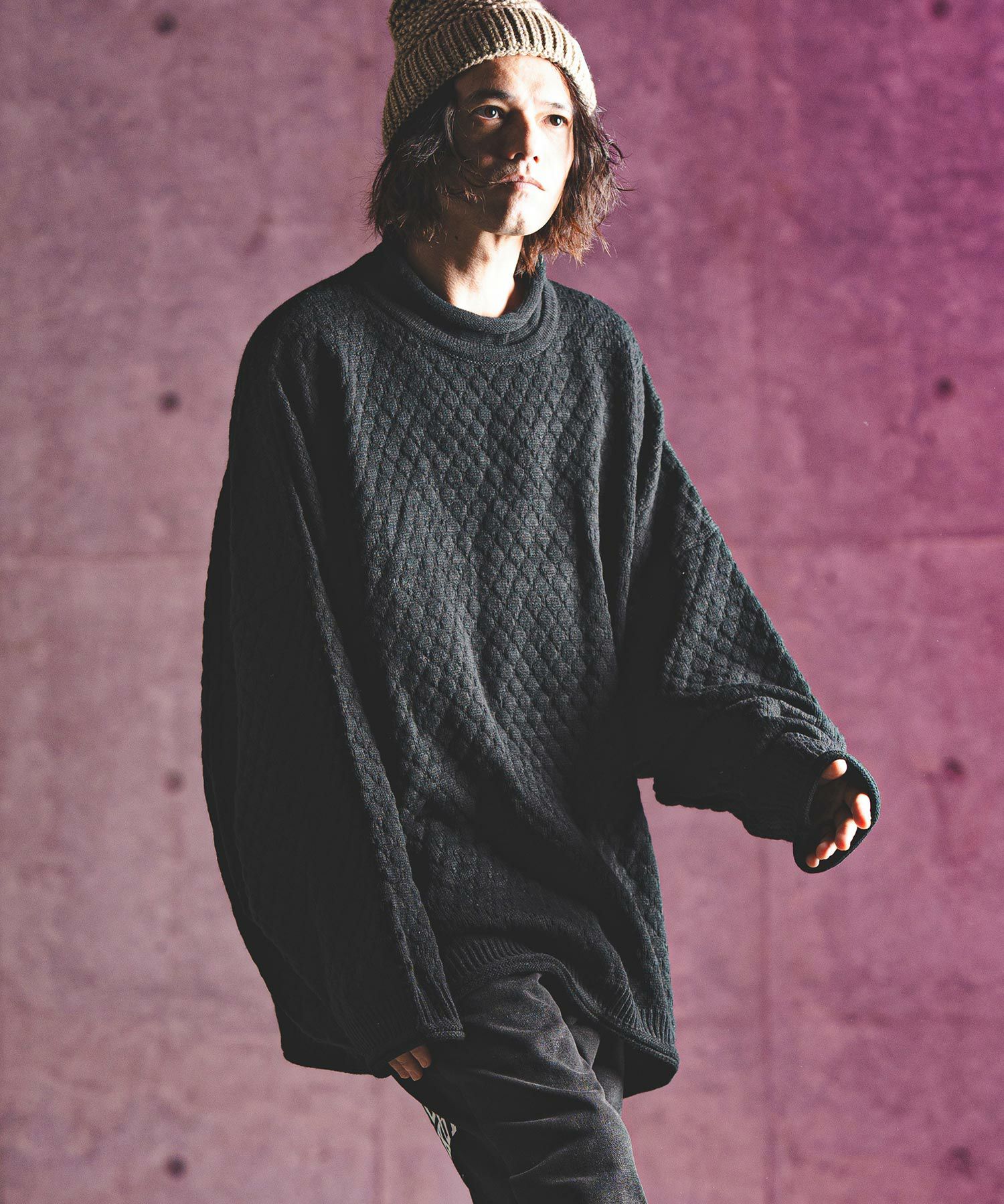 タートルネックとハイネックの中間的な襟高設定のルーズネックがクシュっとしたラフな首周りを演出。