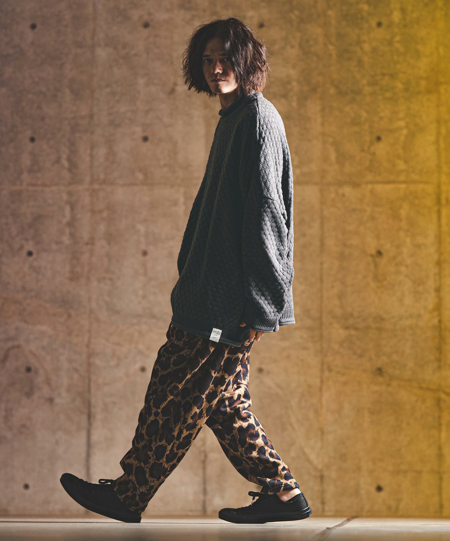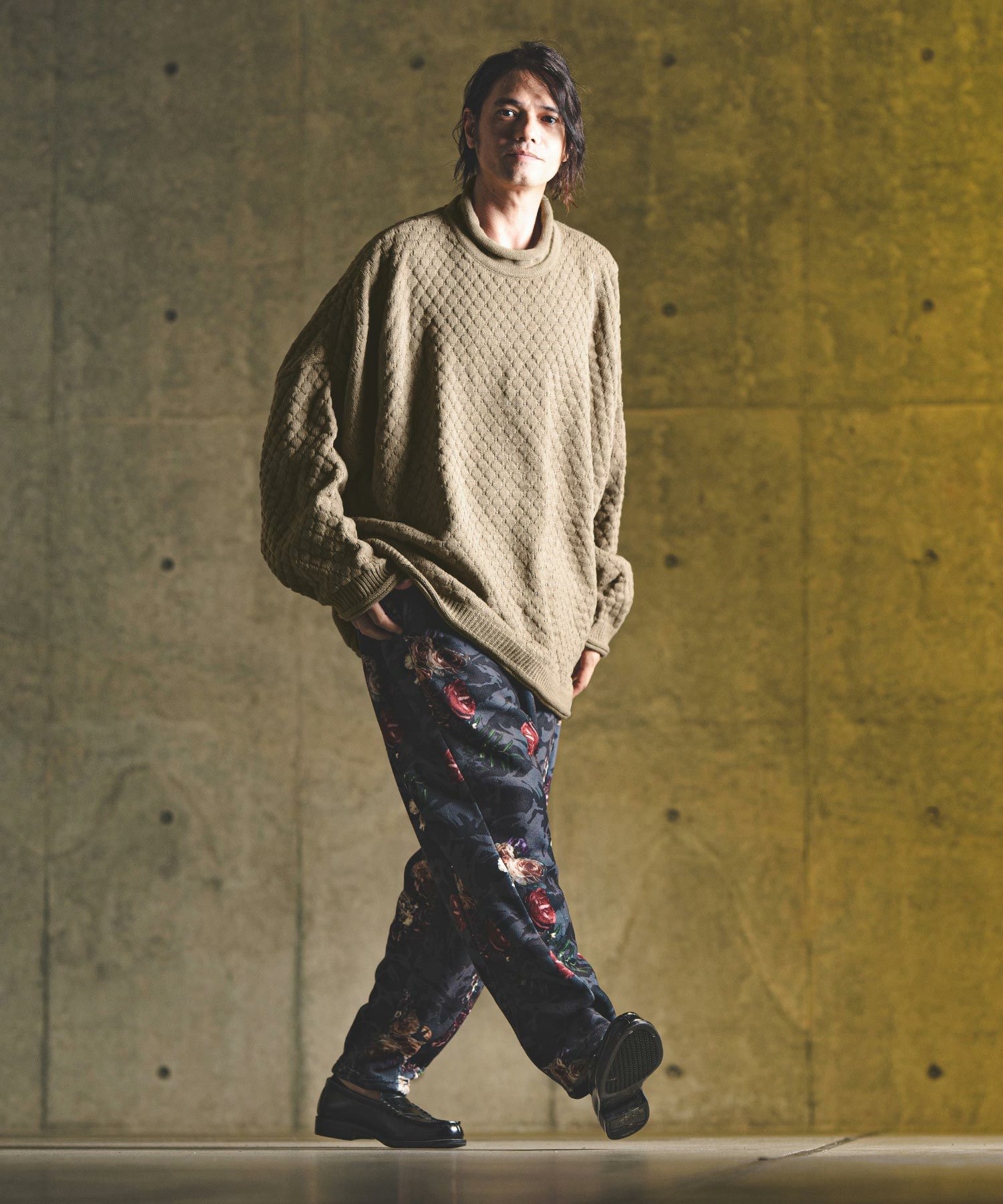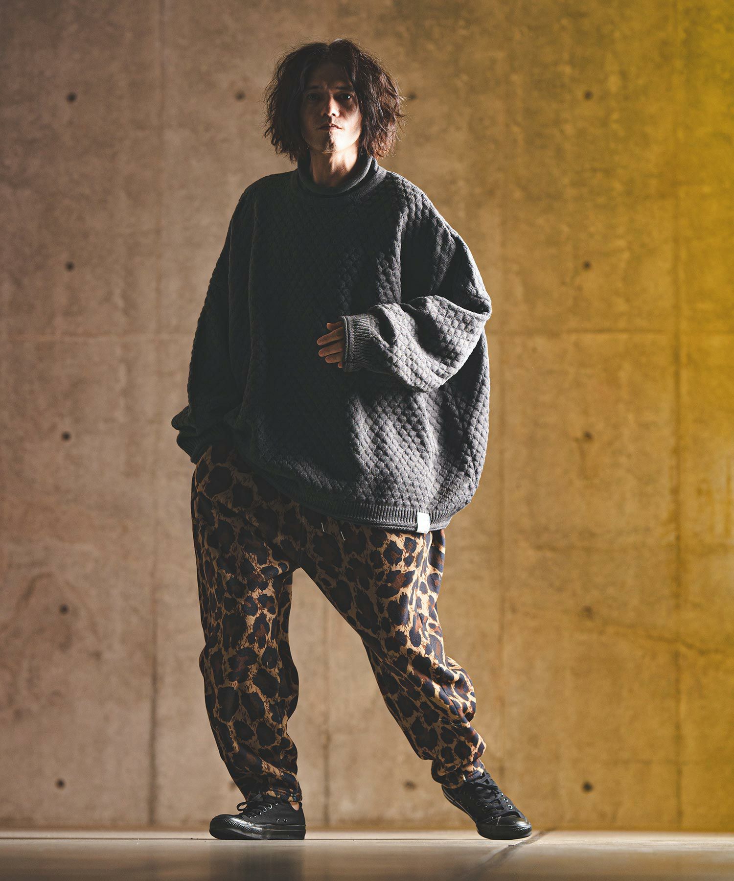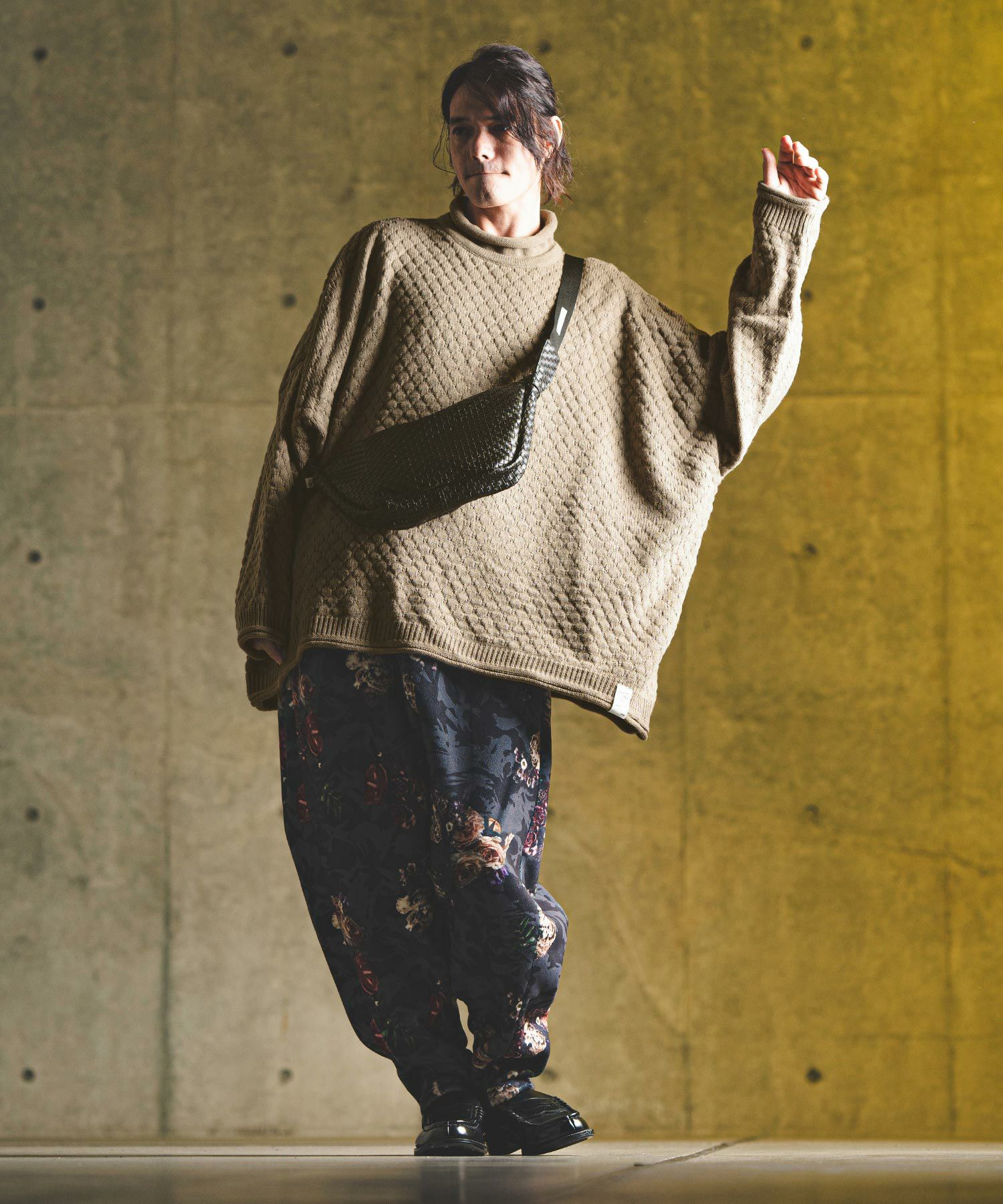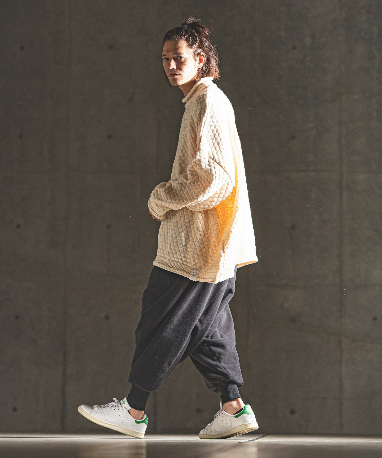 タートルネックとハイネックの中間的な襟高設定のルーズネックがクシュっとしたラフな首周りを演出。