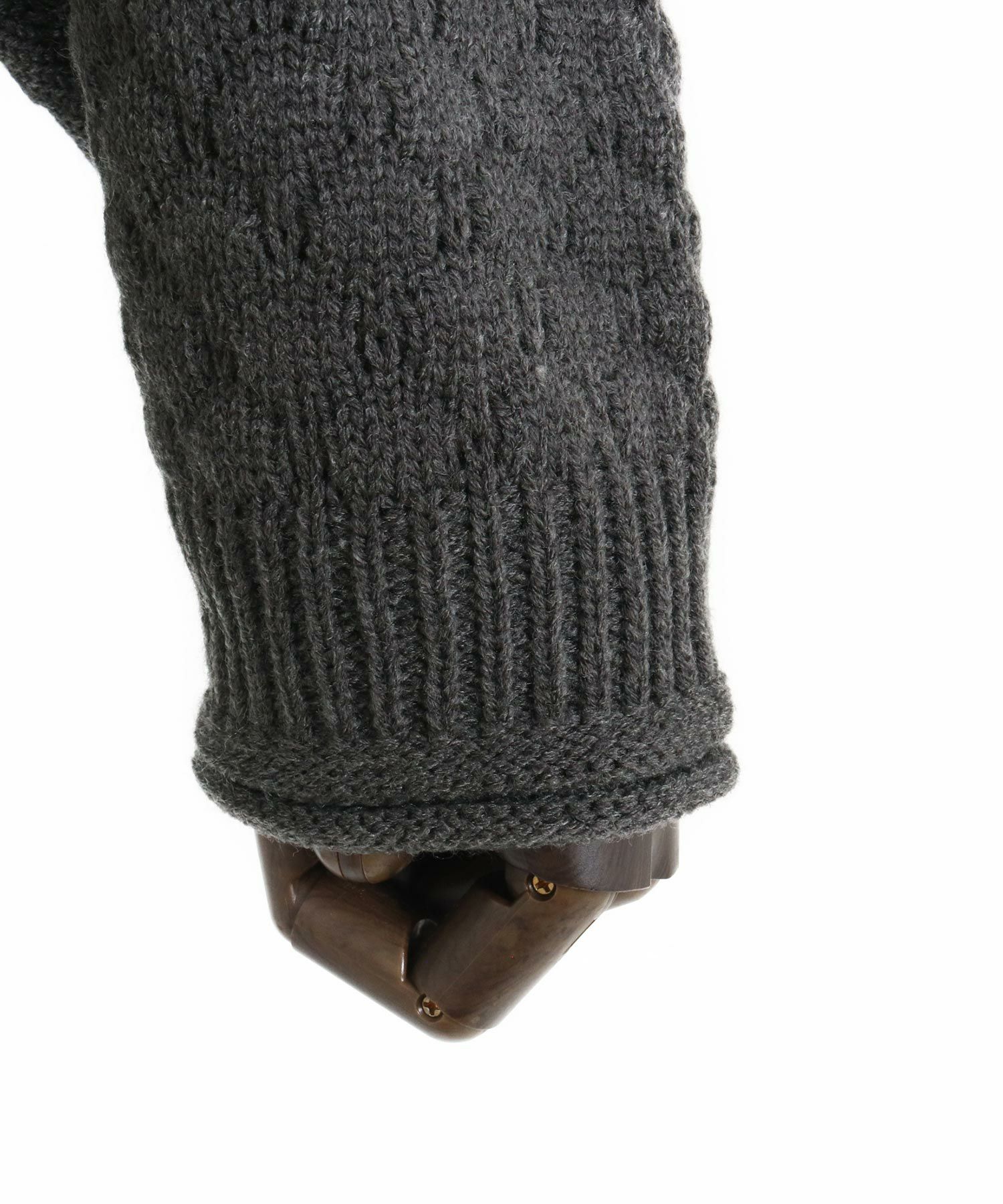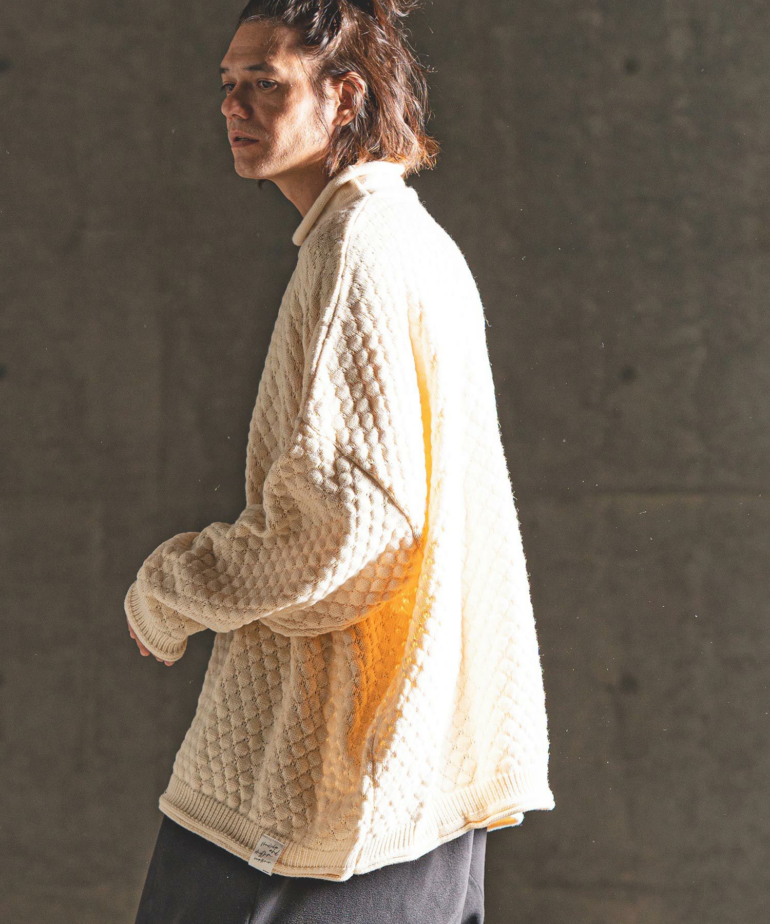 襟先・袖口・裾口を編み出しにしてロールさせてラフな感覚を更に強調した仕上げにしています。