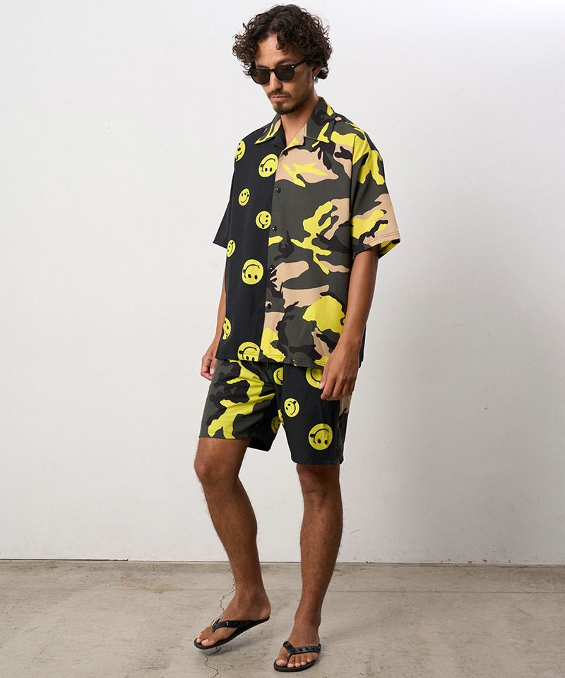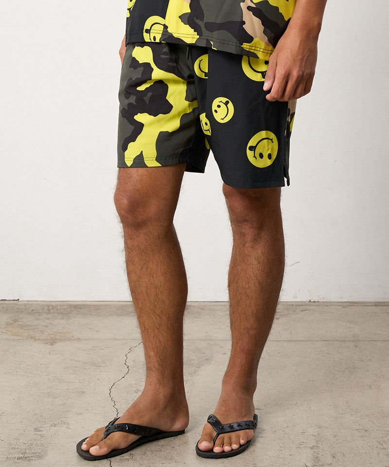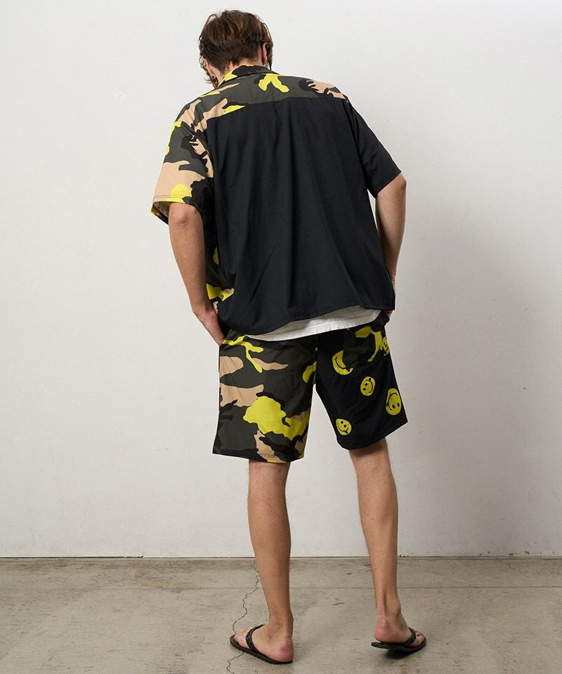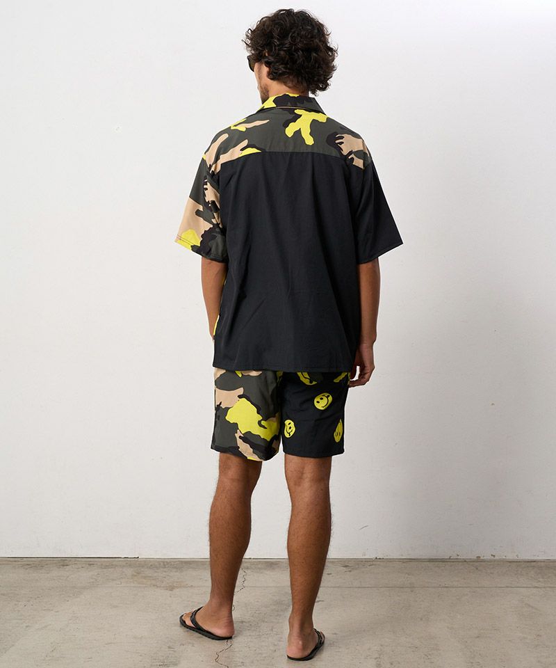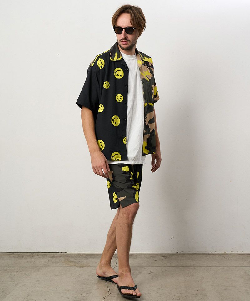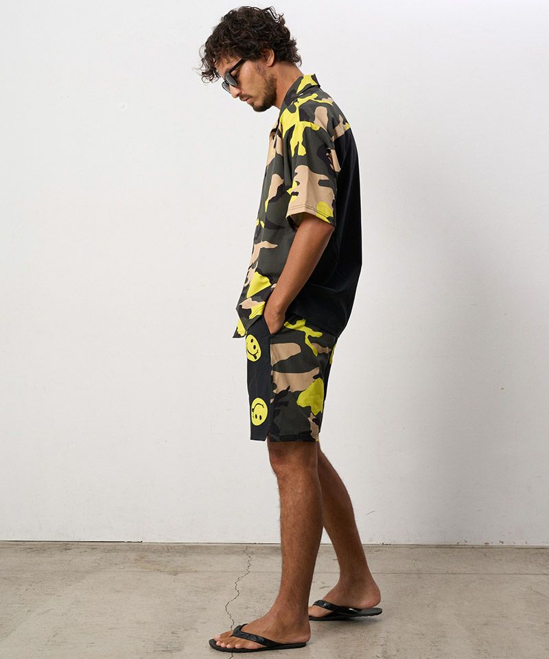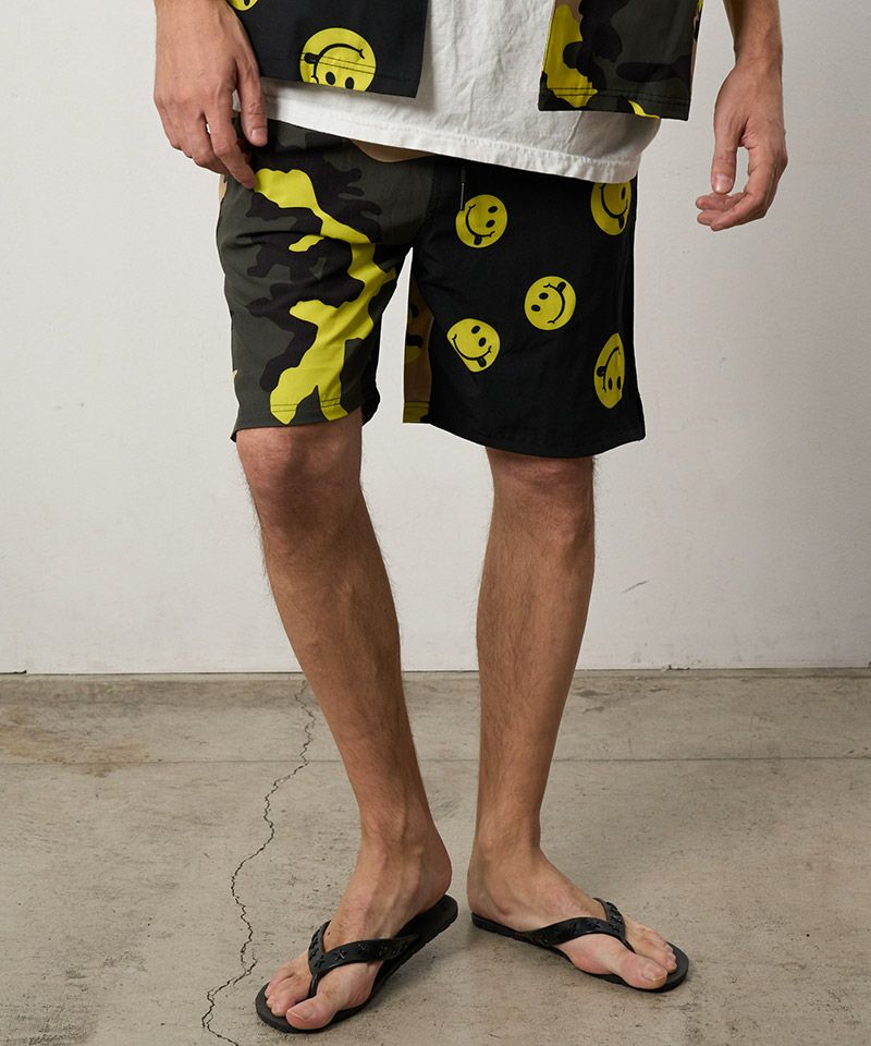 カモフラージュとドットスマイル柄でクレイジーパターンのオリジナルテキスタイルを使用したリラックス感のあるボードショーツ。