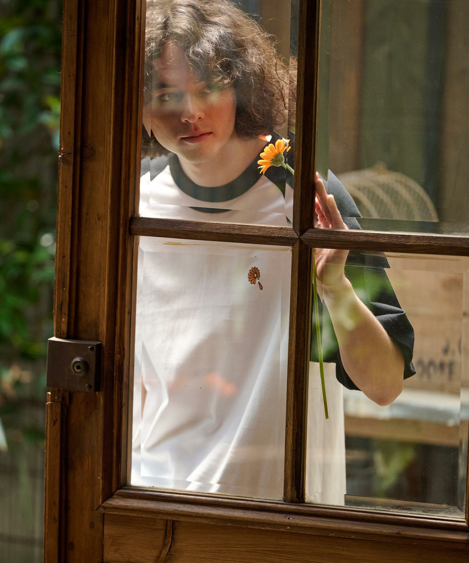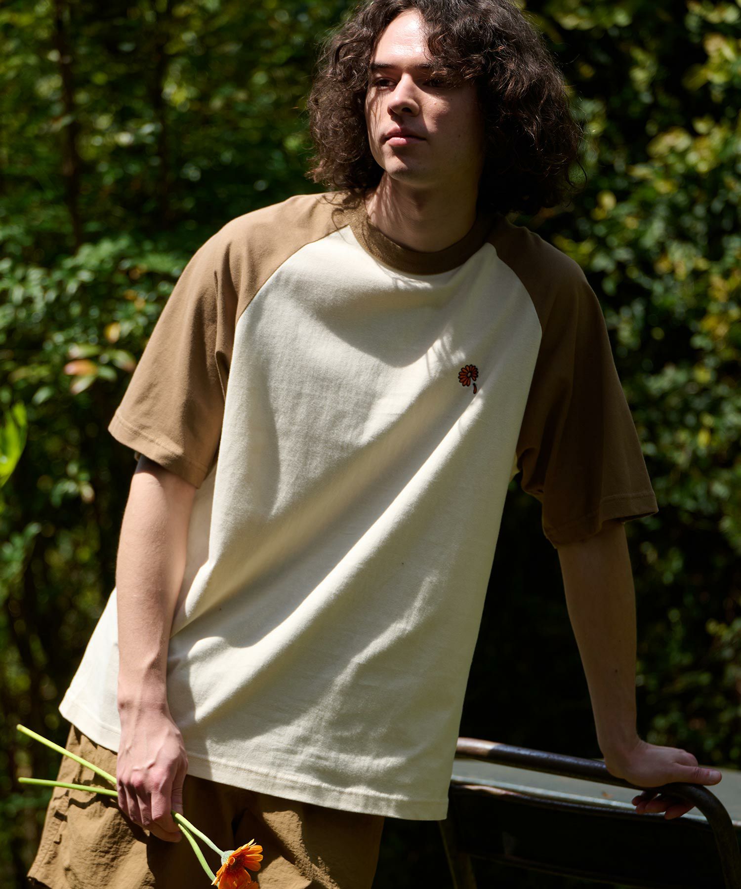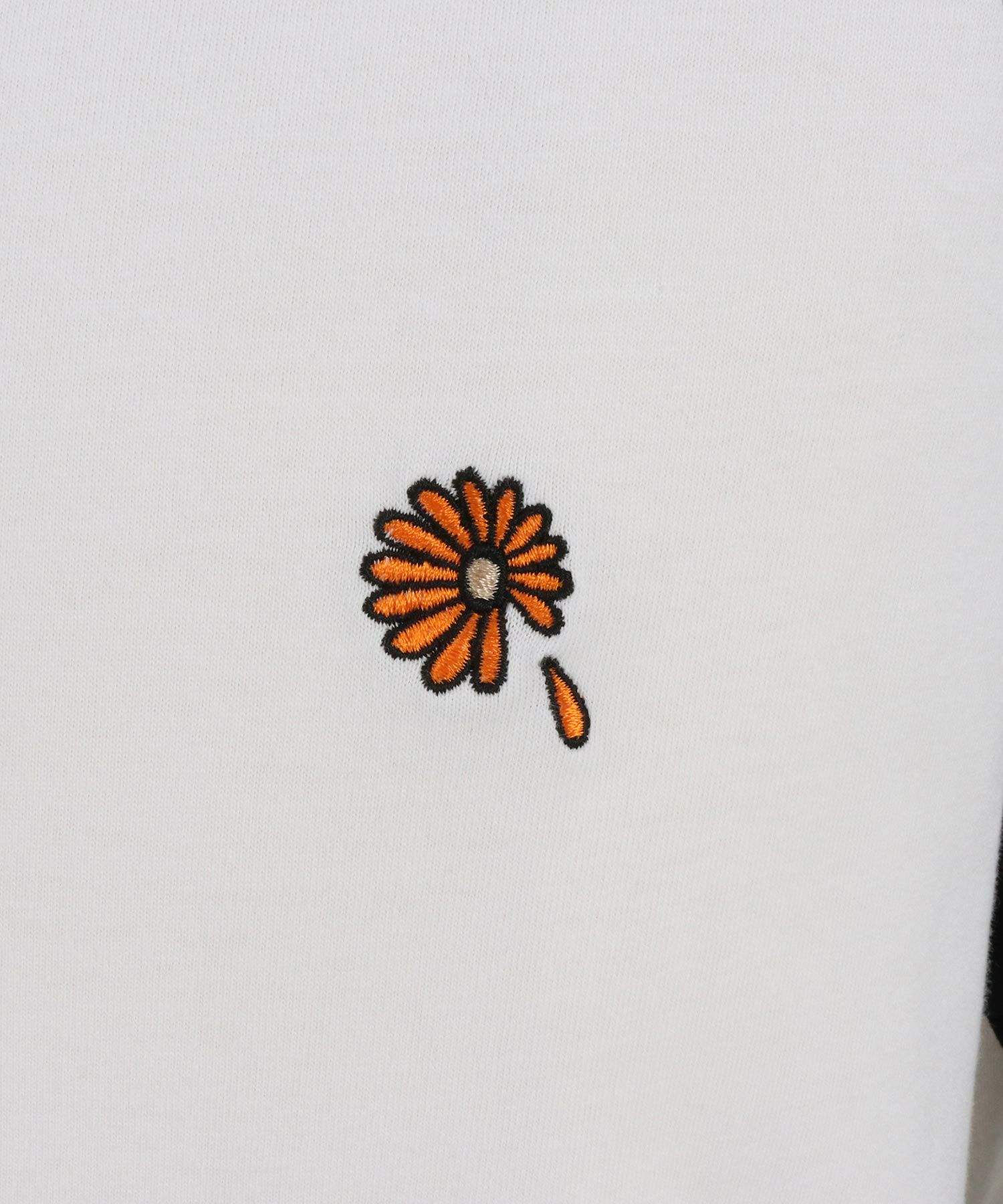 ガーベラのワンポイント刺繍を施したラグランスリーブTシャツ。