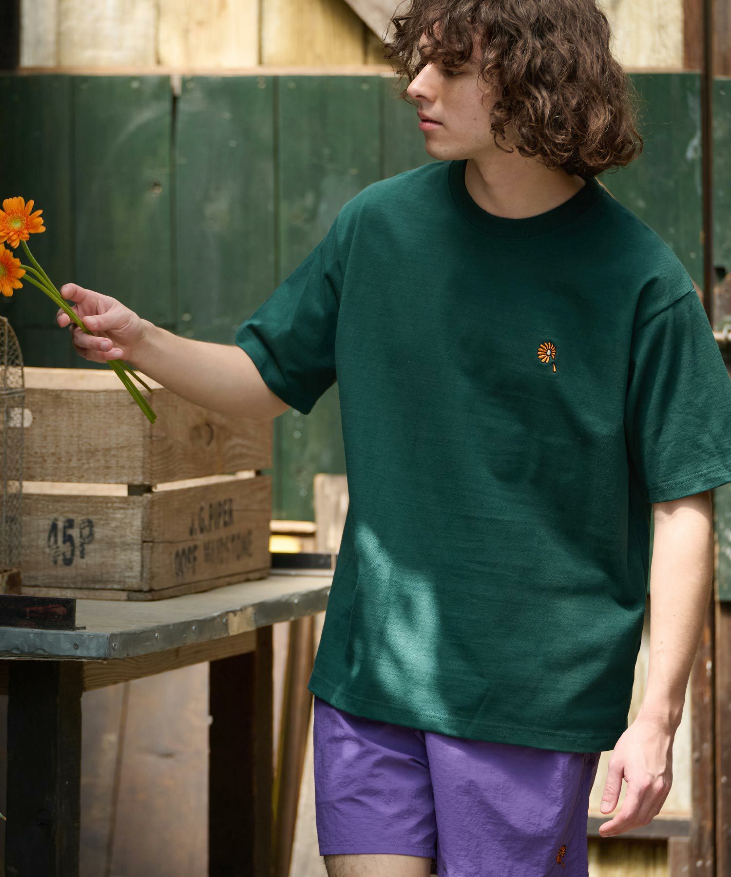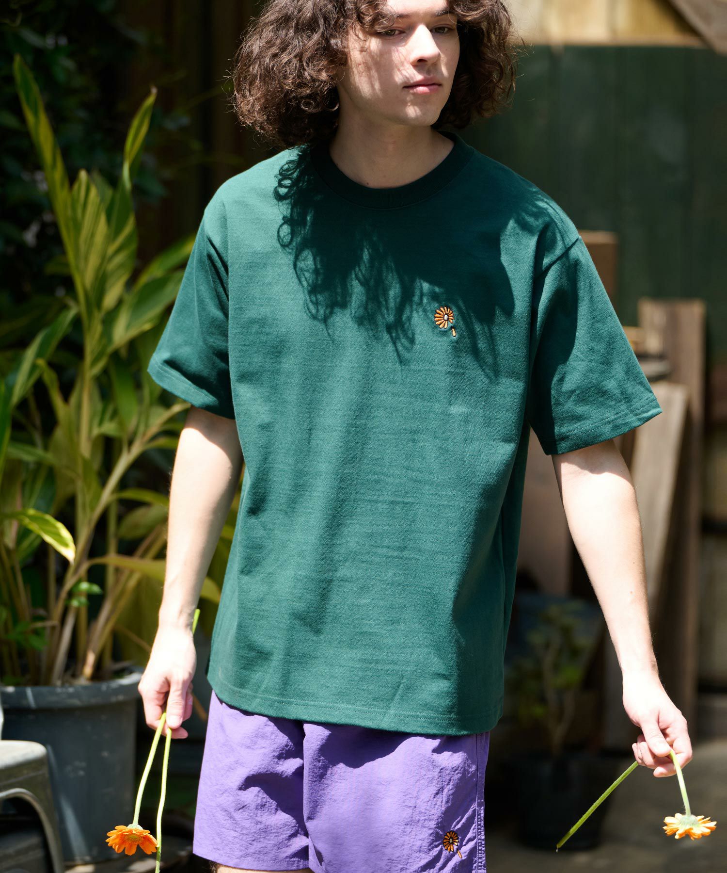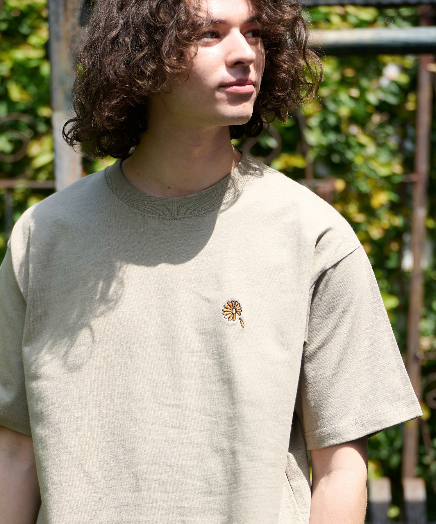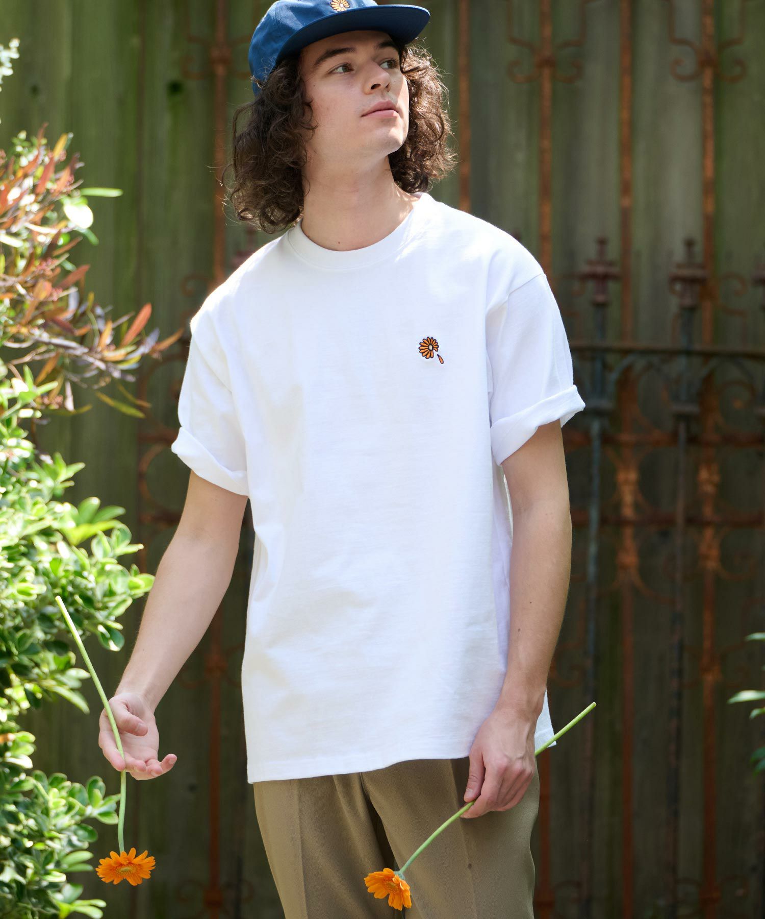 ガーベラのワンポイント刺繍を施したヘビーウエイトTシャツ。