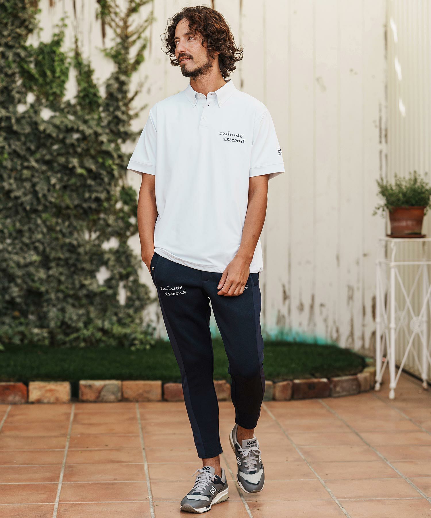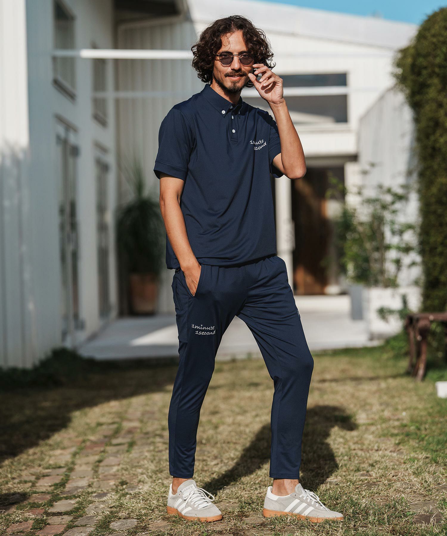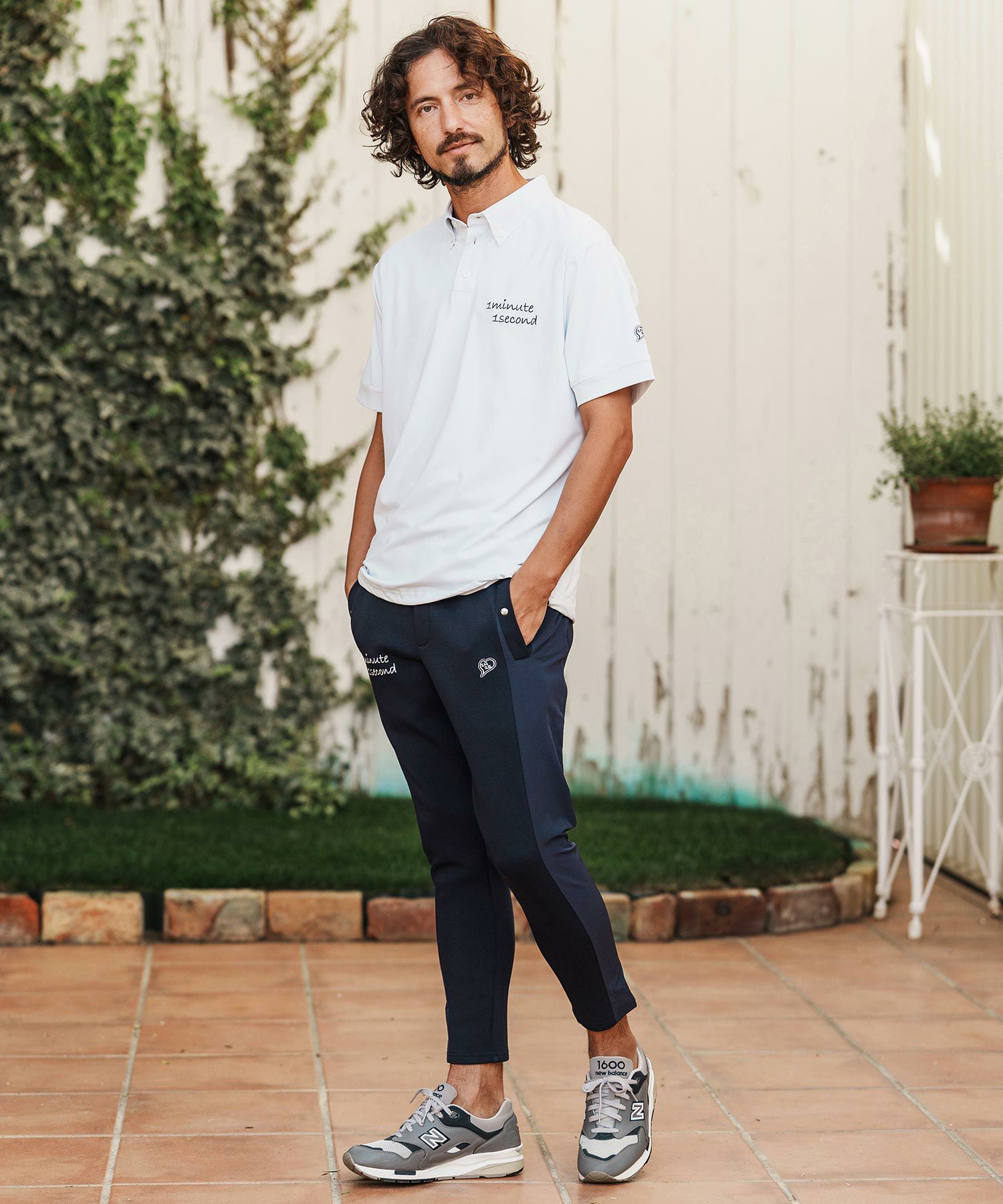 1minute 1second 【1minute 1second(ワンミニットワンセカンド)】cursive embroidery high stretch fabric polo shirt ポロシャツ(1M26H060)