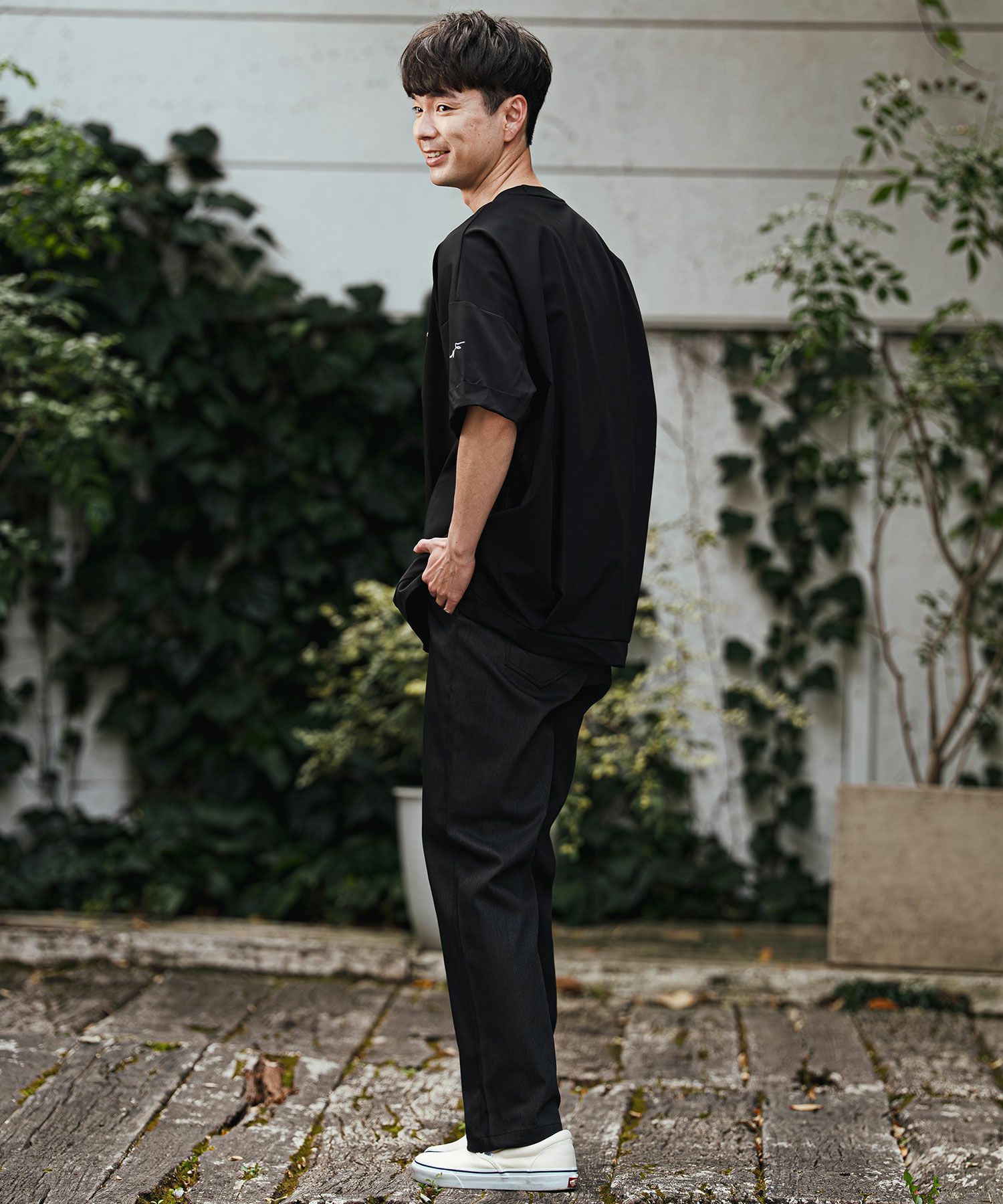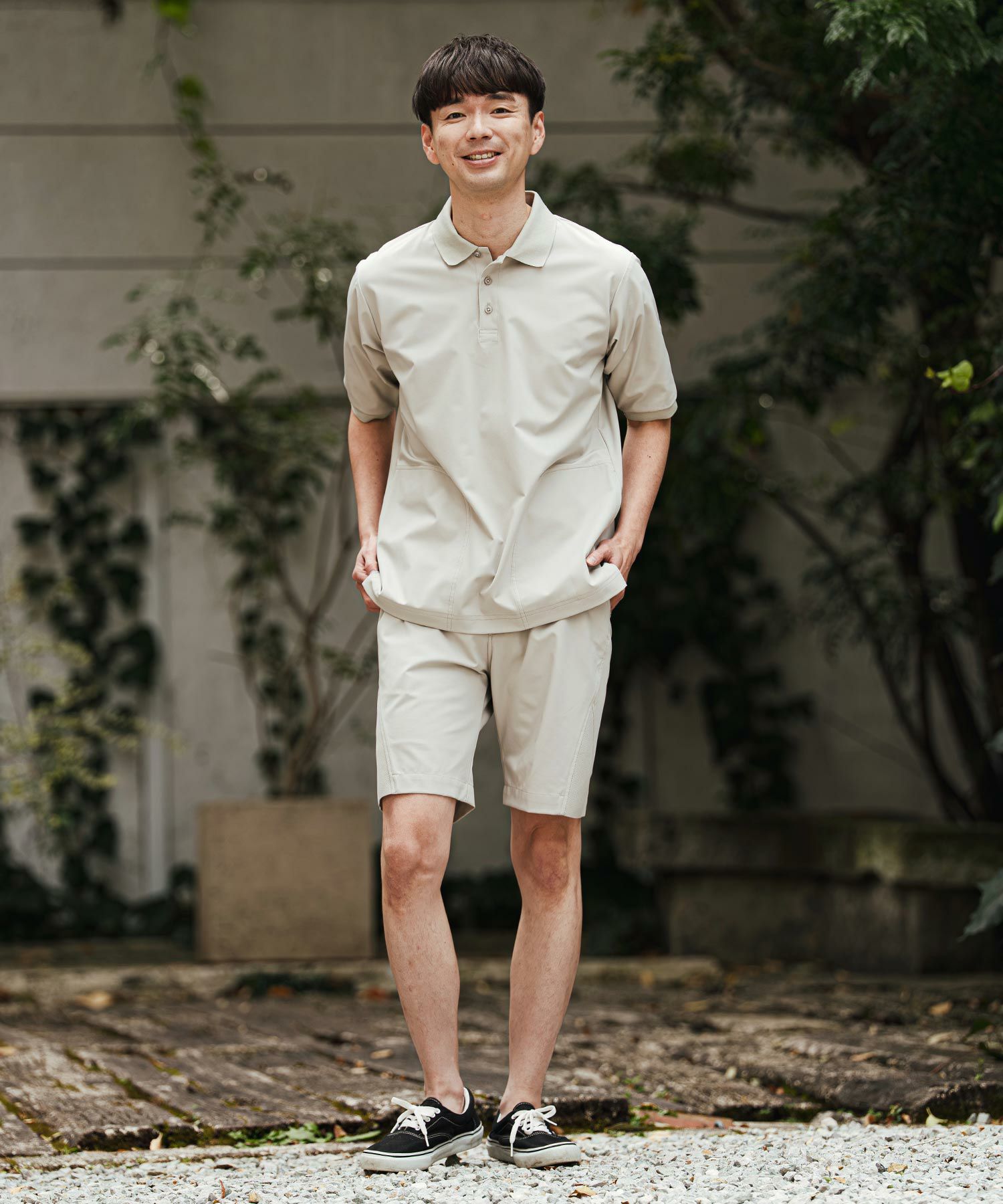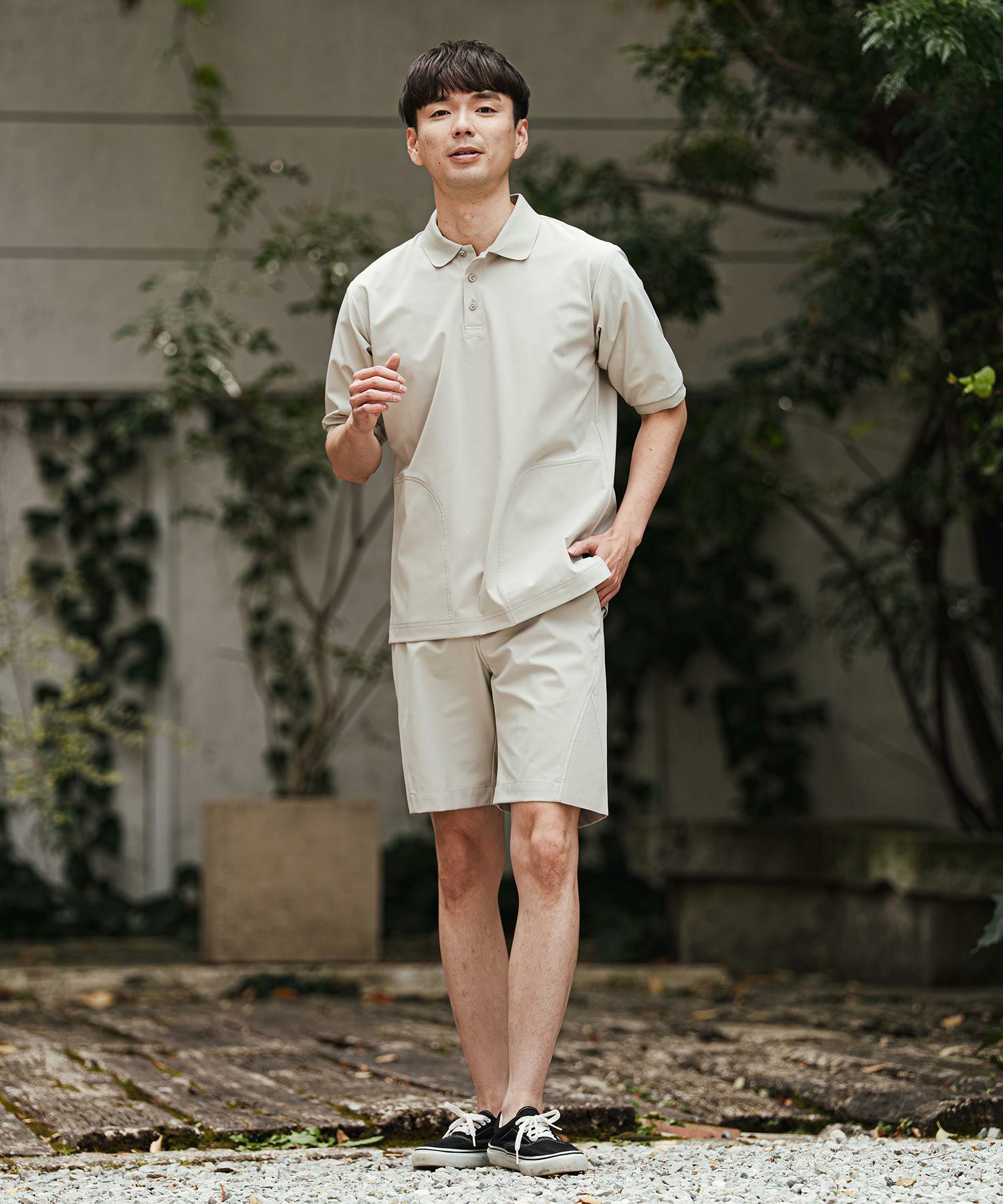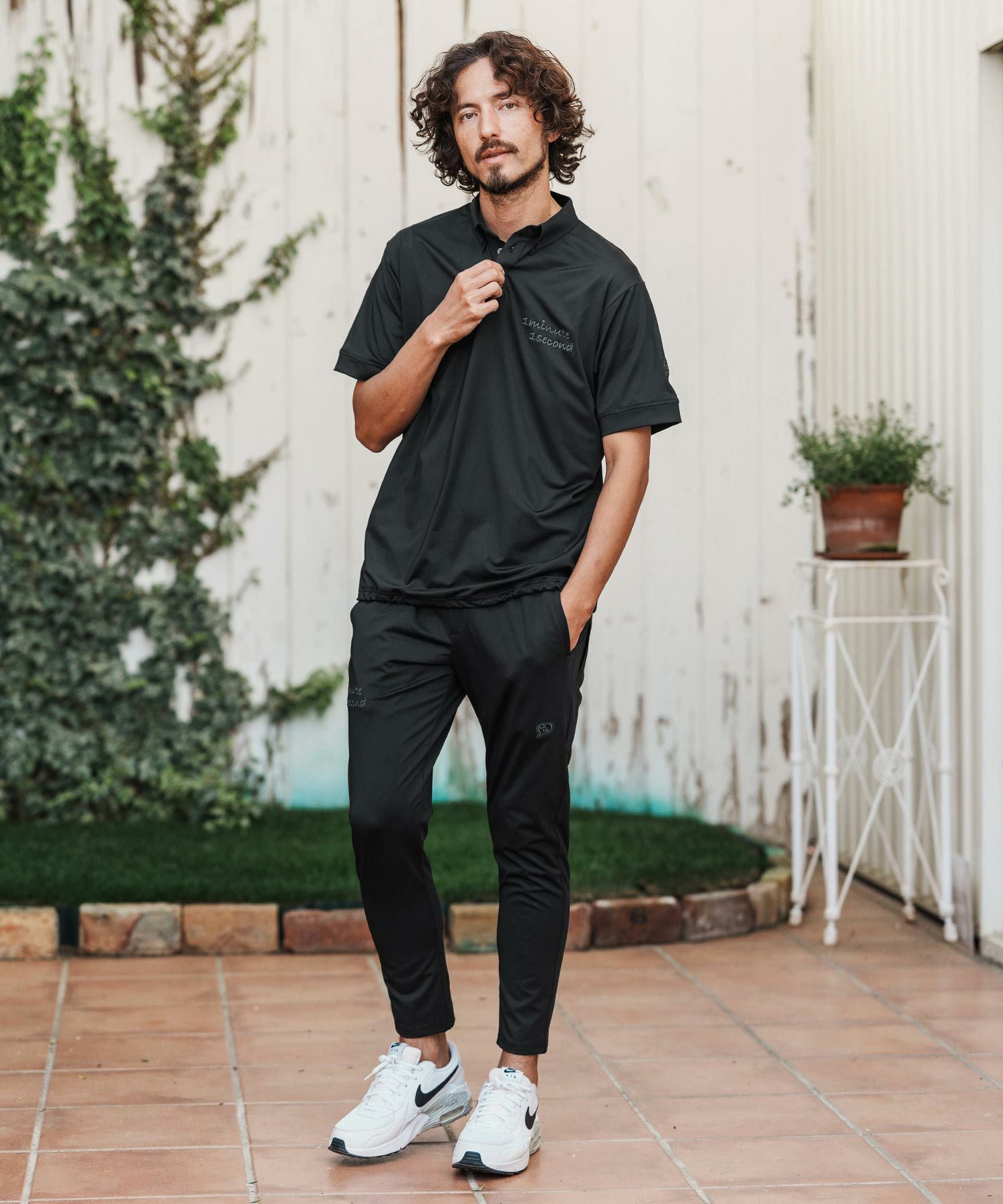 1minute 1second 【1minute 1second(ワンミニットワンセカンド)】cursive embroidery high stretch fabric polo shirt ポロシャツ(1M26H060)
