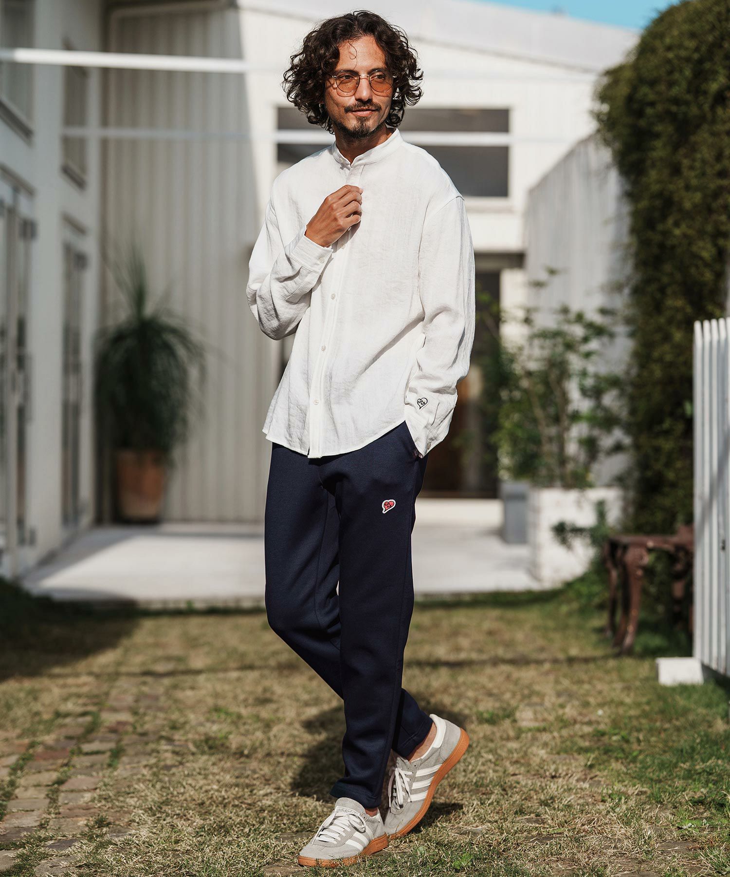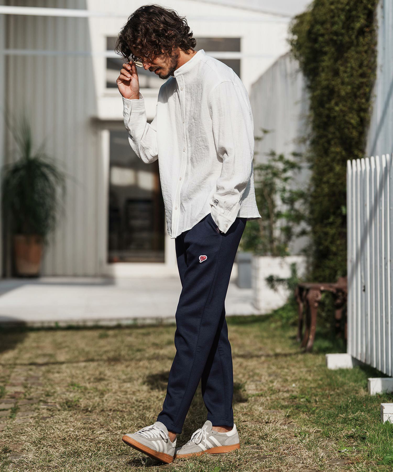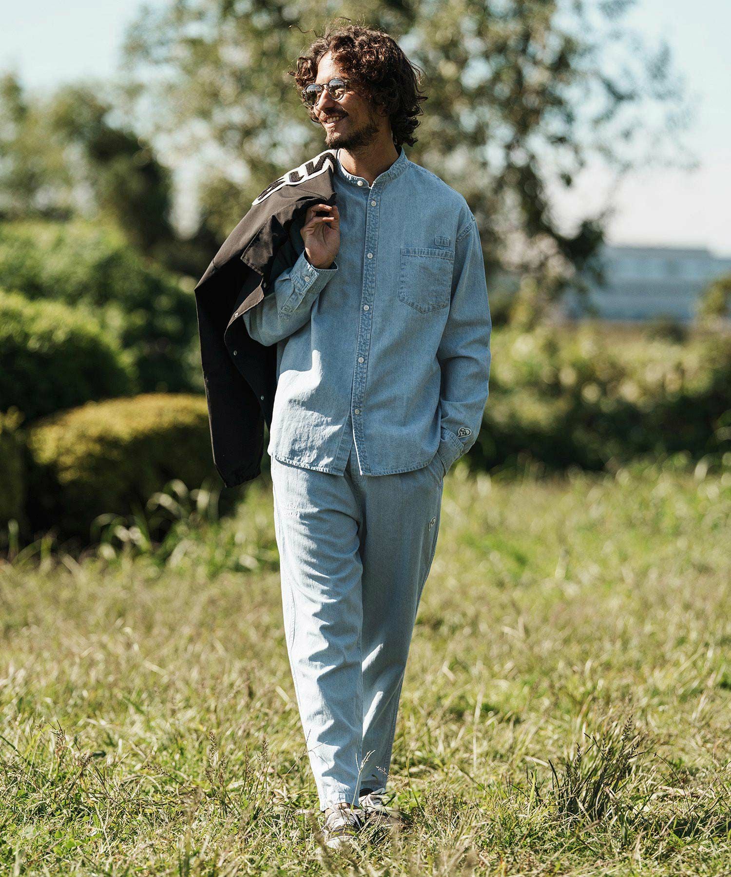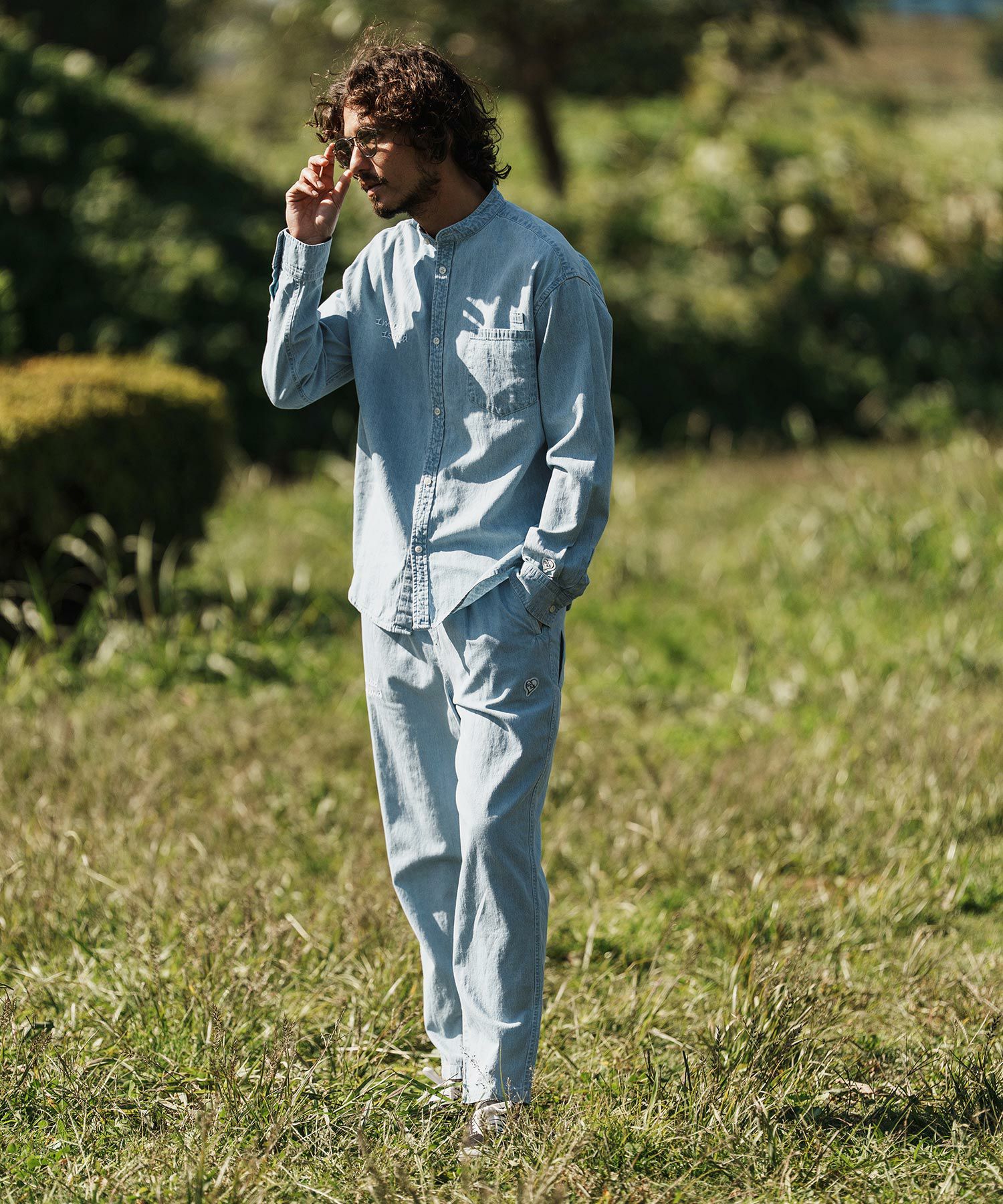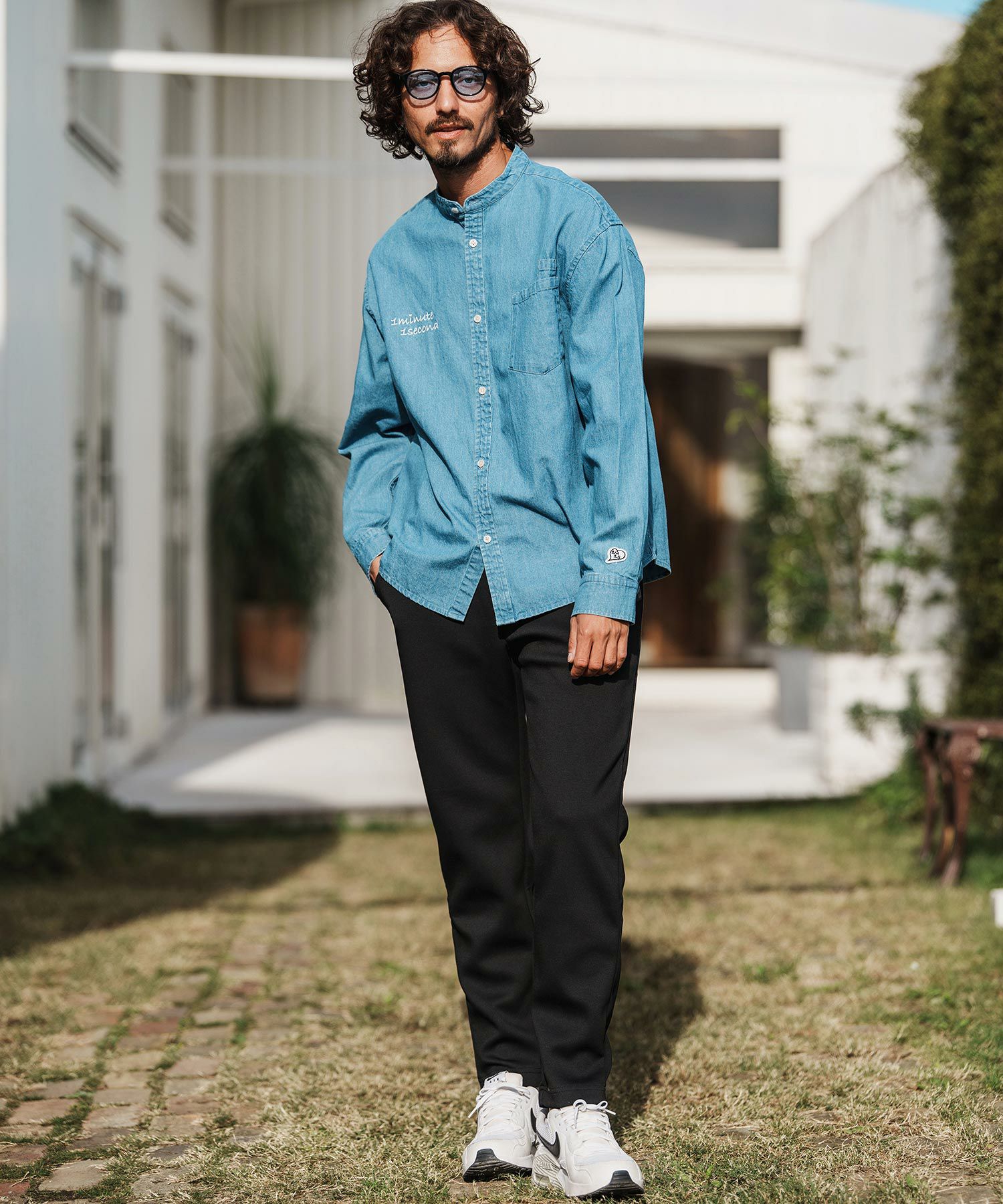 1minute 1second 【1minute 1second(ワンミニットワンセカンド)】cursive embroidery cotton-linen denim shirt スタンドカラーシャツ(1M26H110)