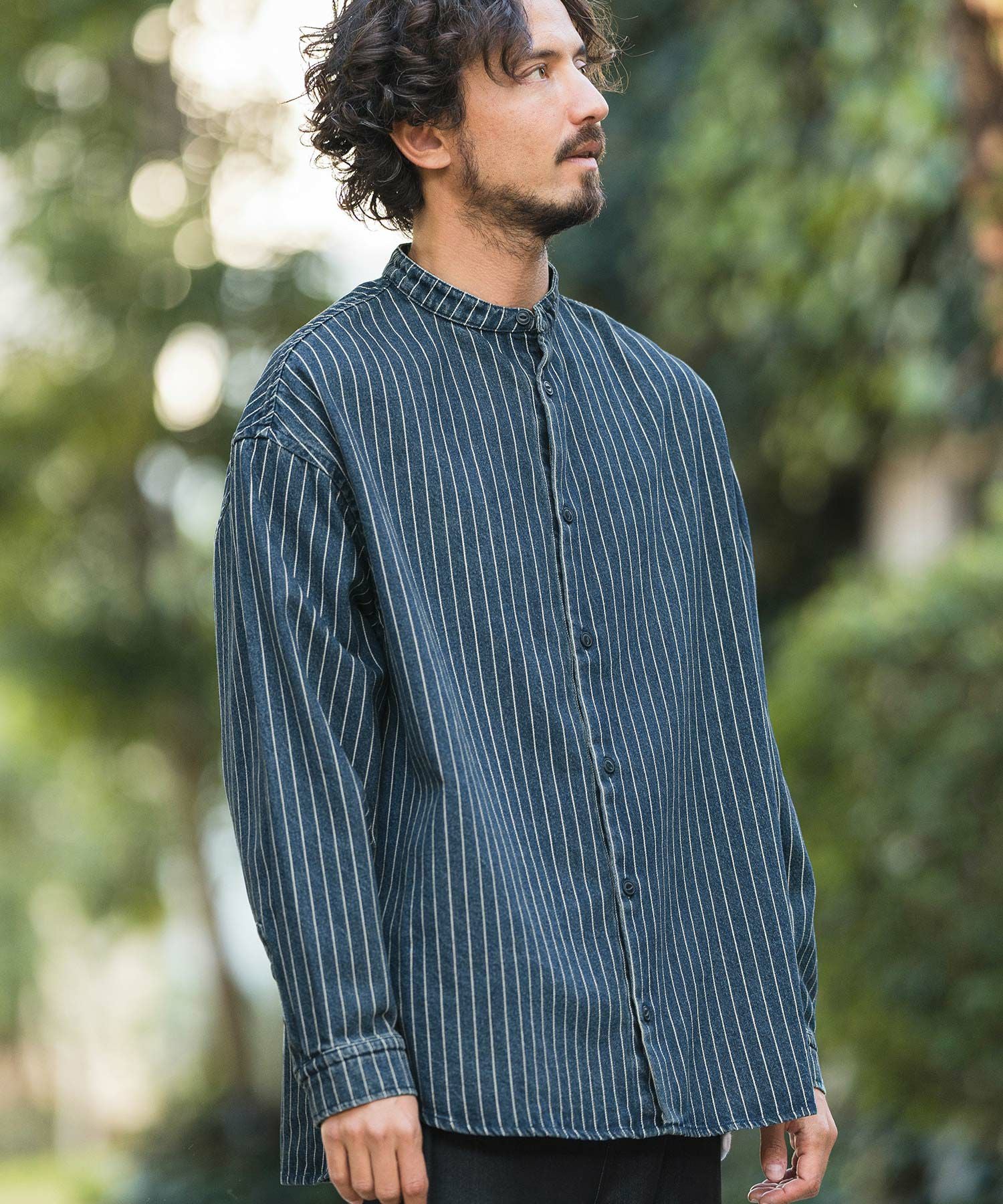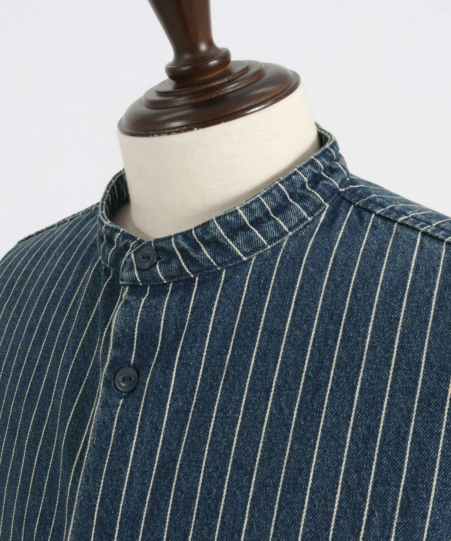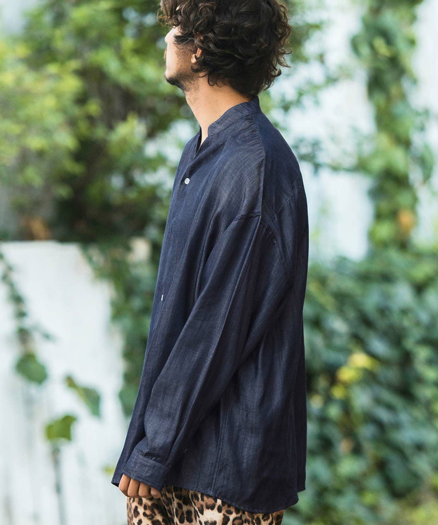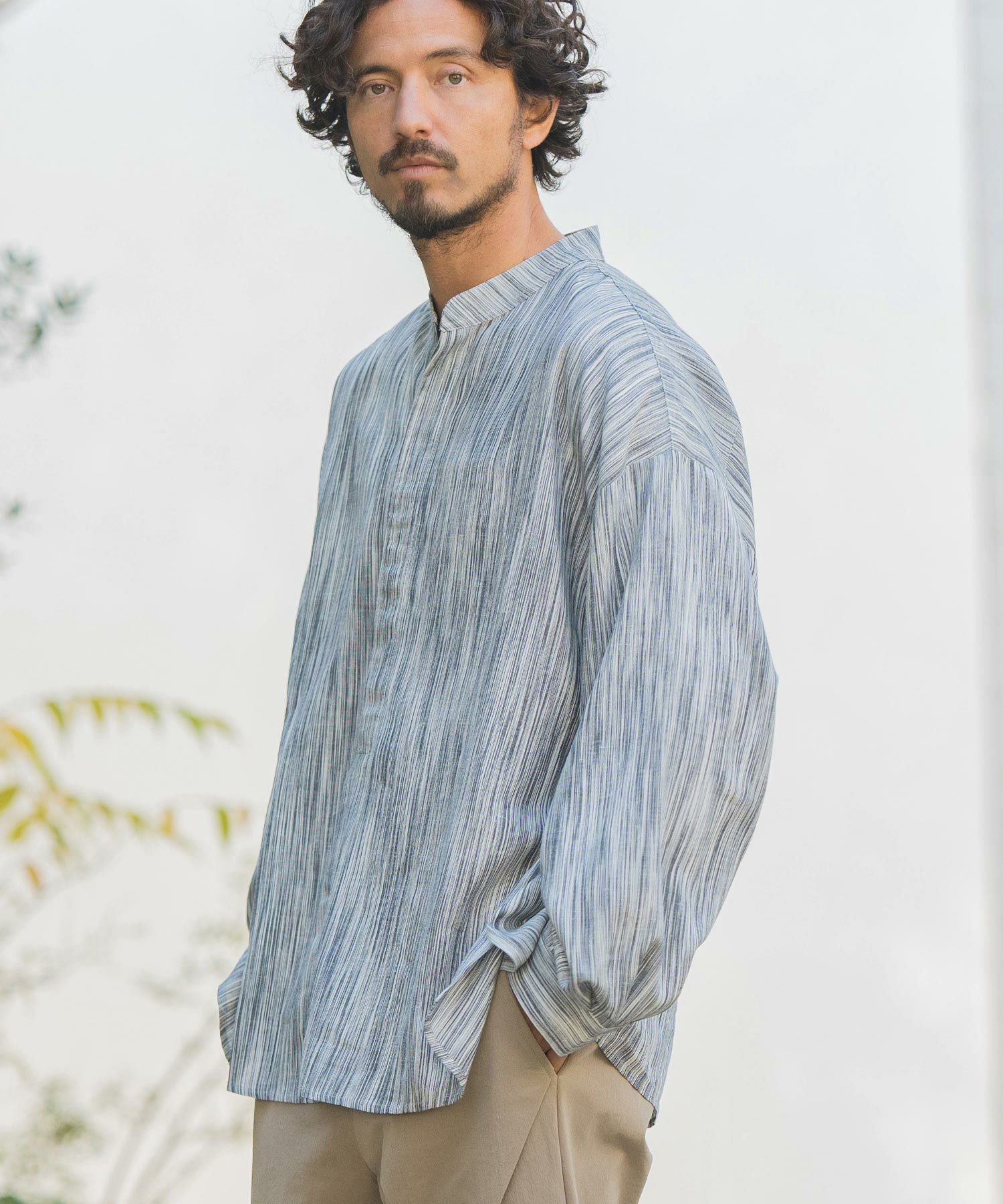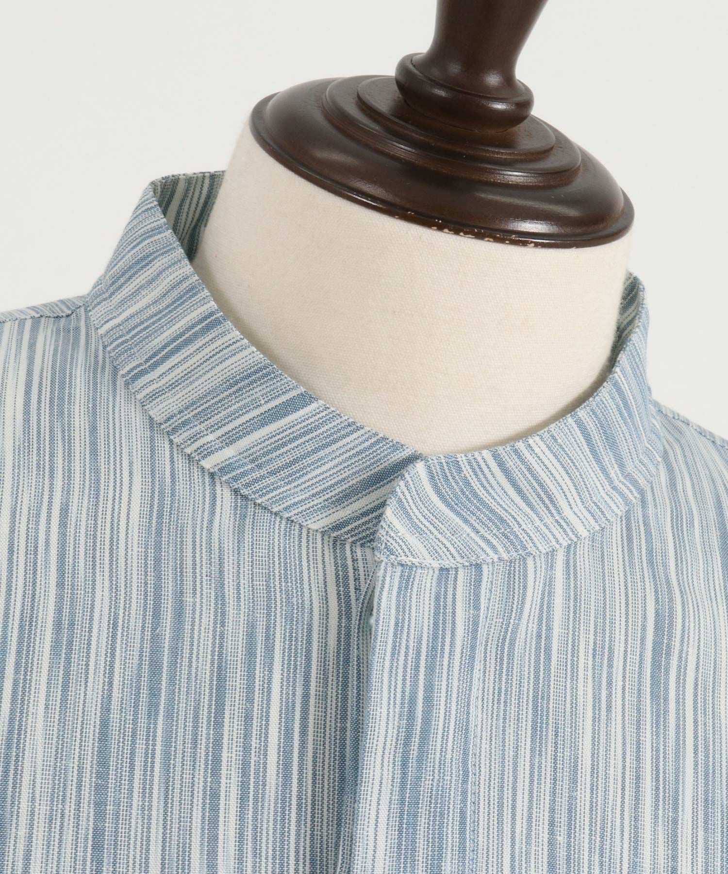 MROLIVE 50%OFF【MROLIVE(ミスターオリーブ)】CLASSIC PATTERN INDIGO LINEN - BAND COLLAR SHIRT バンドカラーシャツ(M241114)
