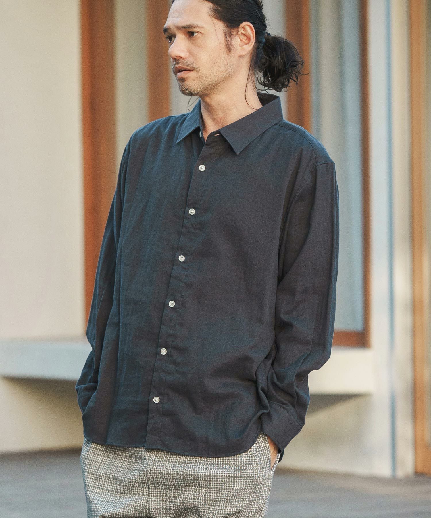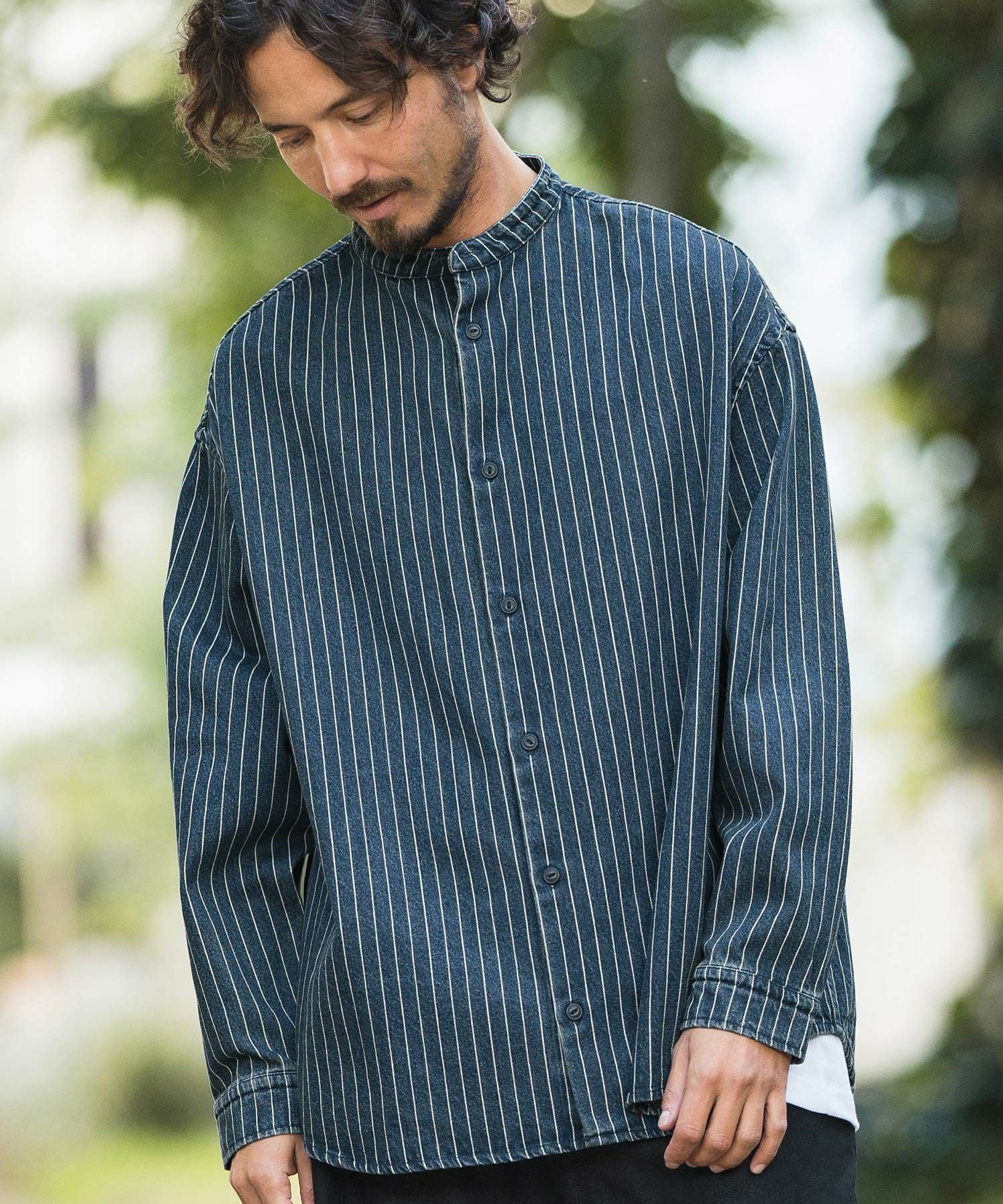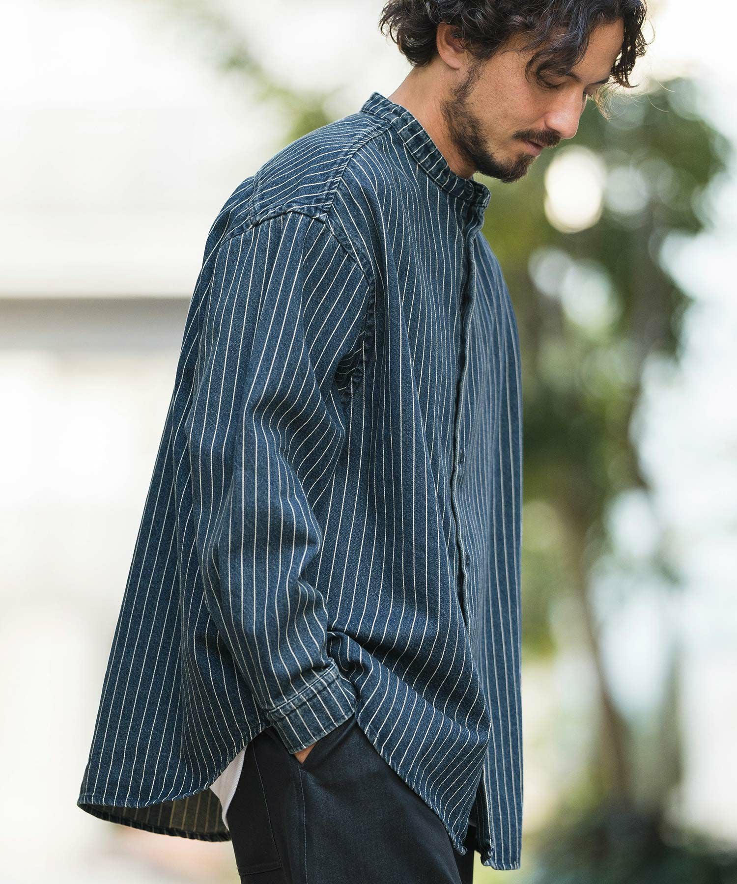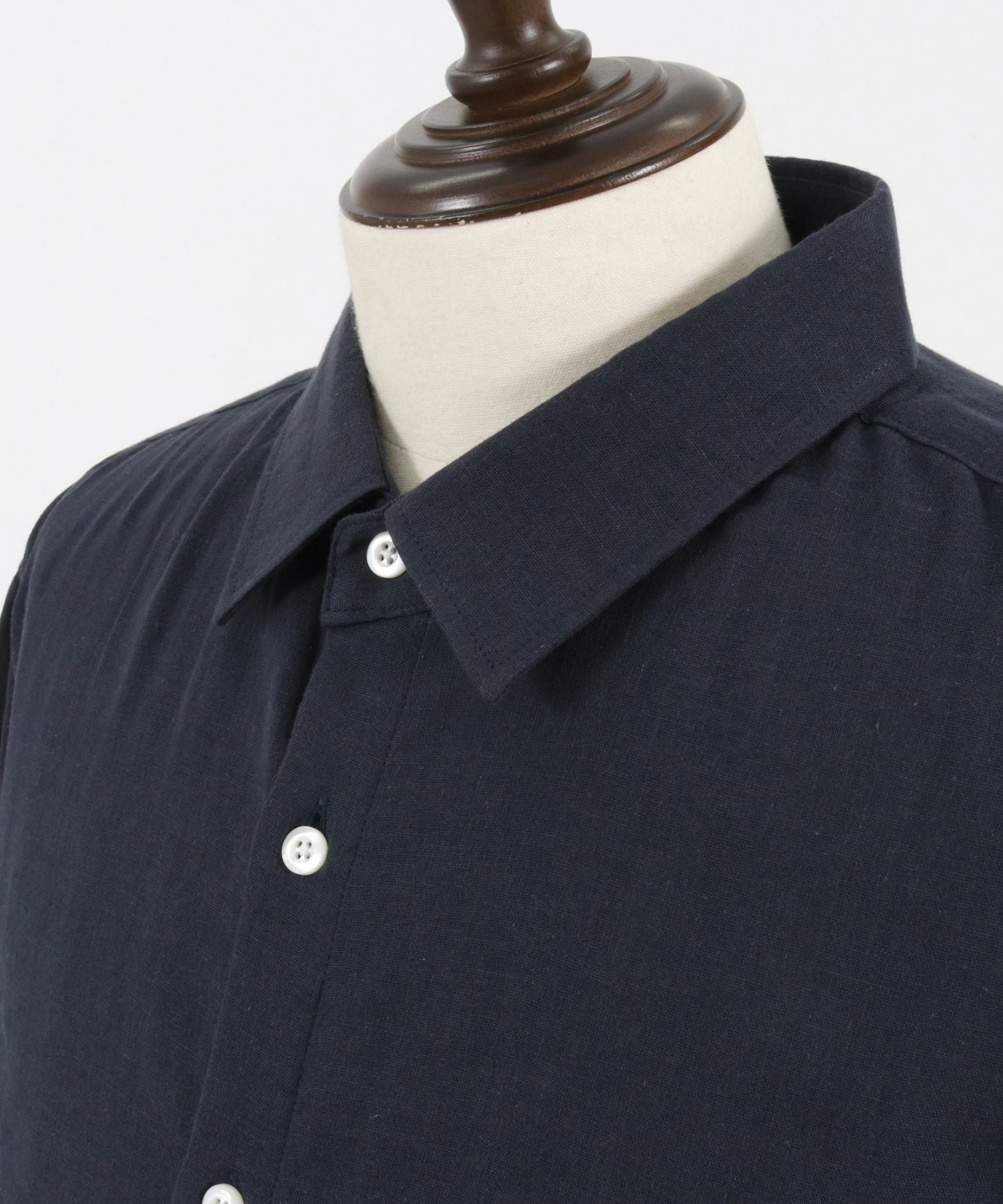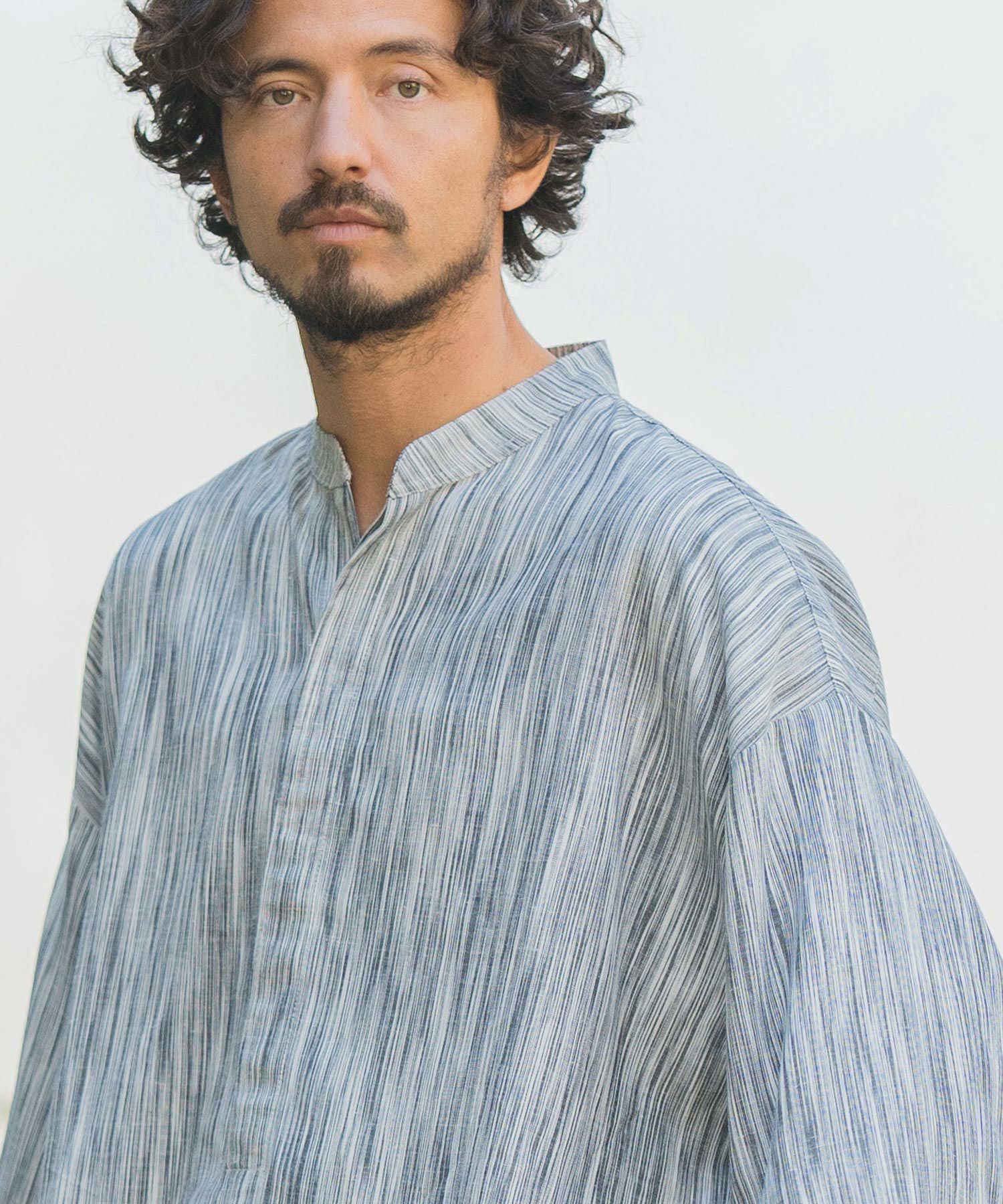 MROLIVE 50%OFF【MROLIVE(ミスターオリーブ)】CLASSIC PATTERN INDIGO LINEN - BAND COLLAR SHIRT バンドカラーシャツ(M241114)