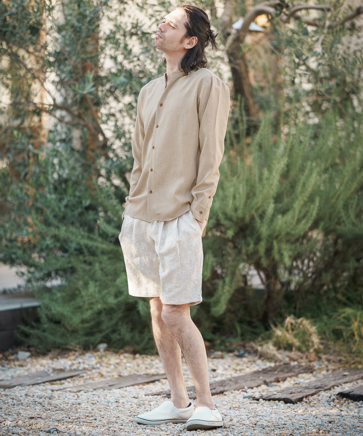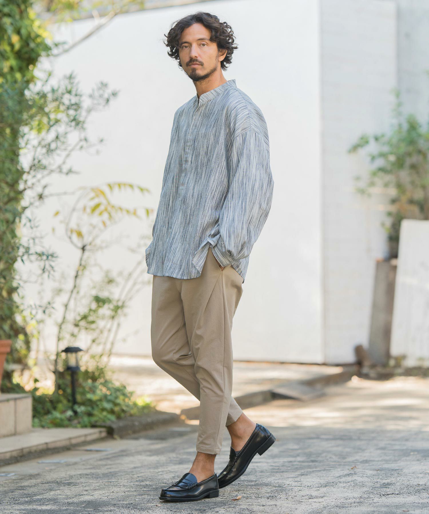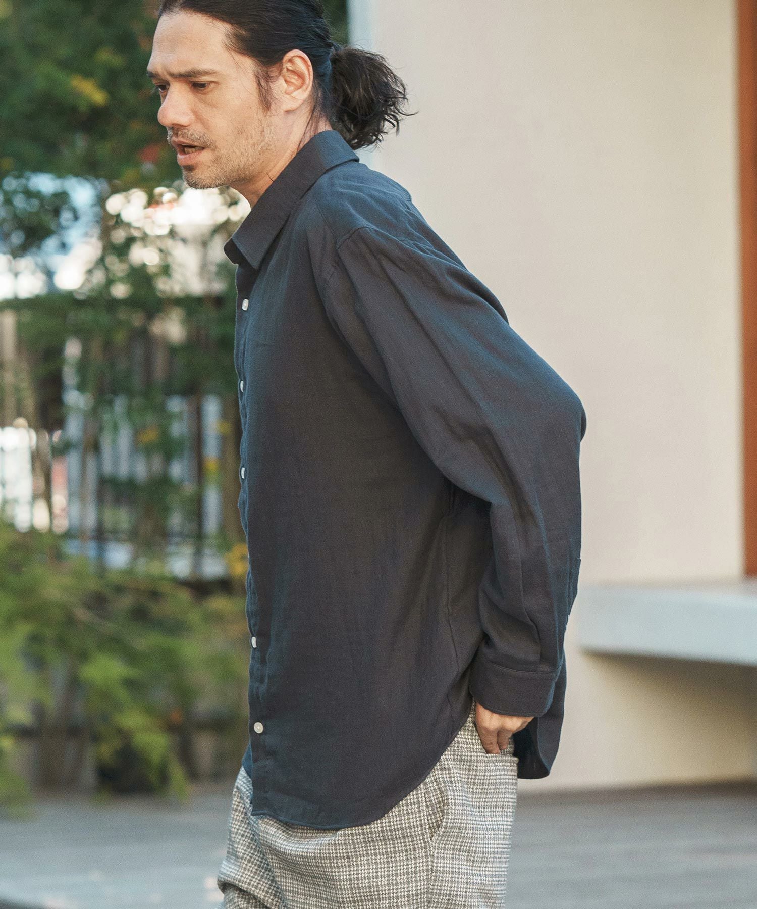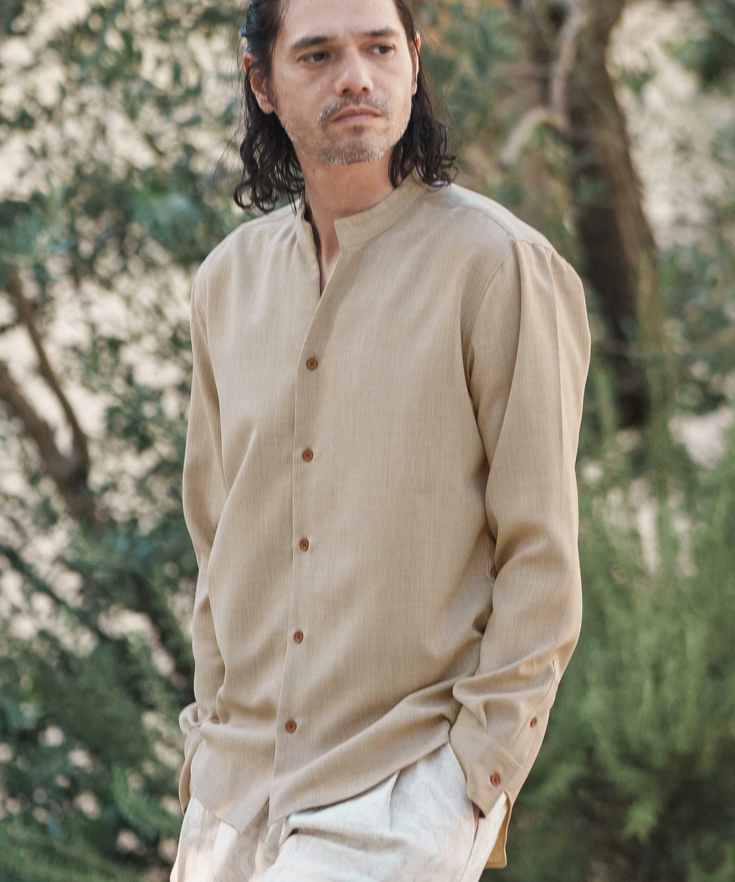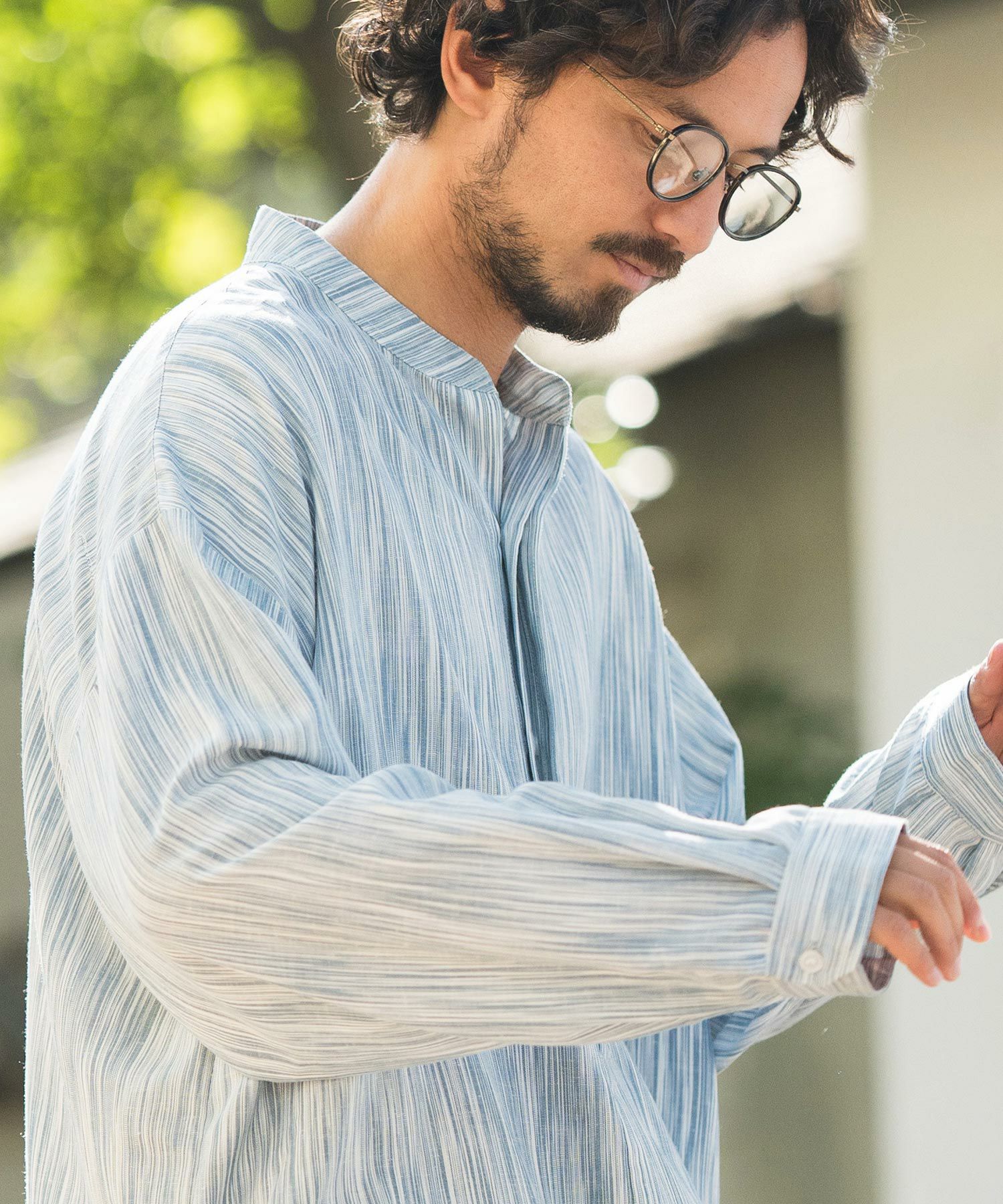 MROLIVE 50%OFF【MROLIVE(ミスターオリーブ)】CLASSIC PATTERN INDIGO LINEN - BAND COLLAR SHIRT バンドカラーシャツ(M241114)