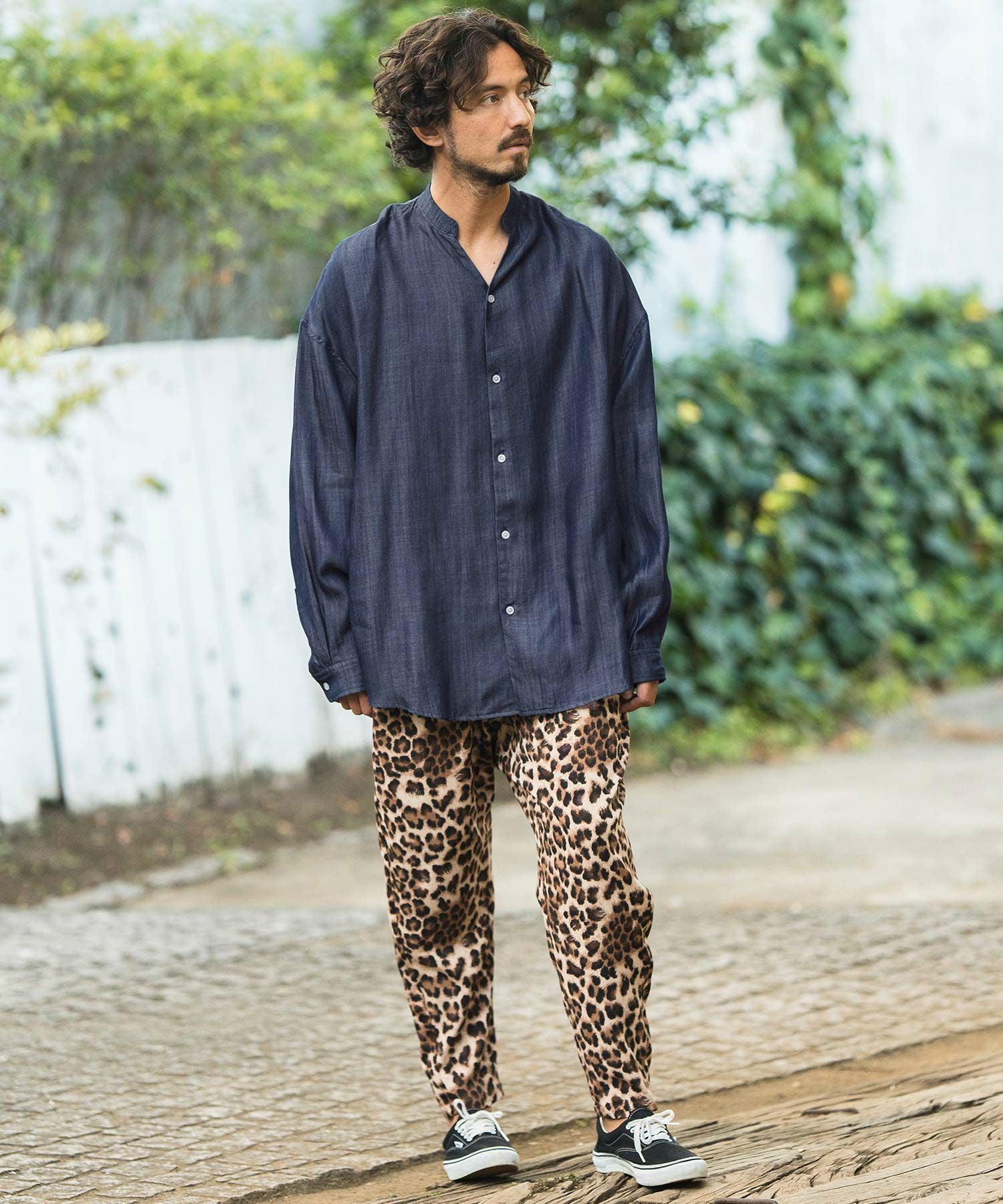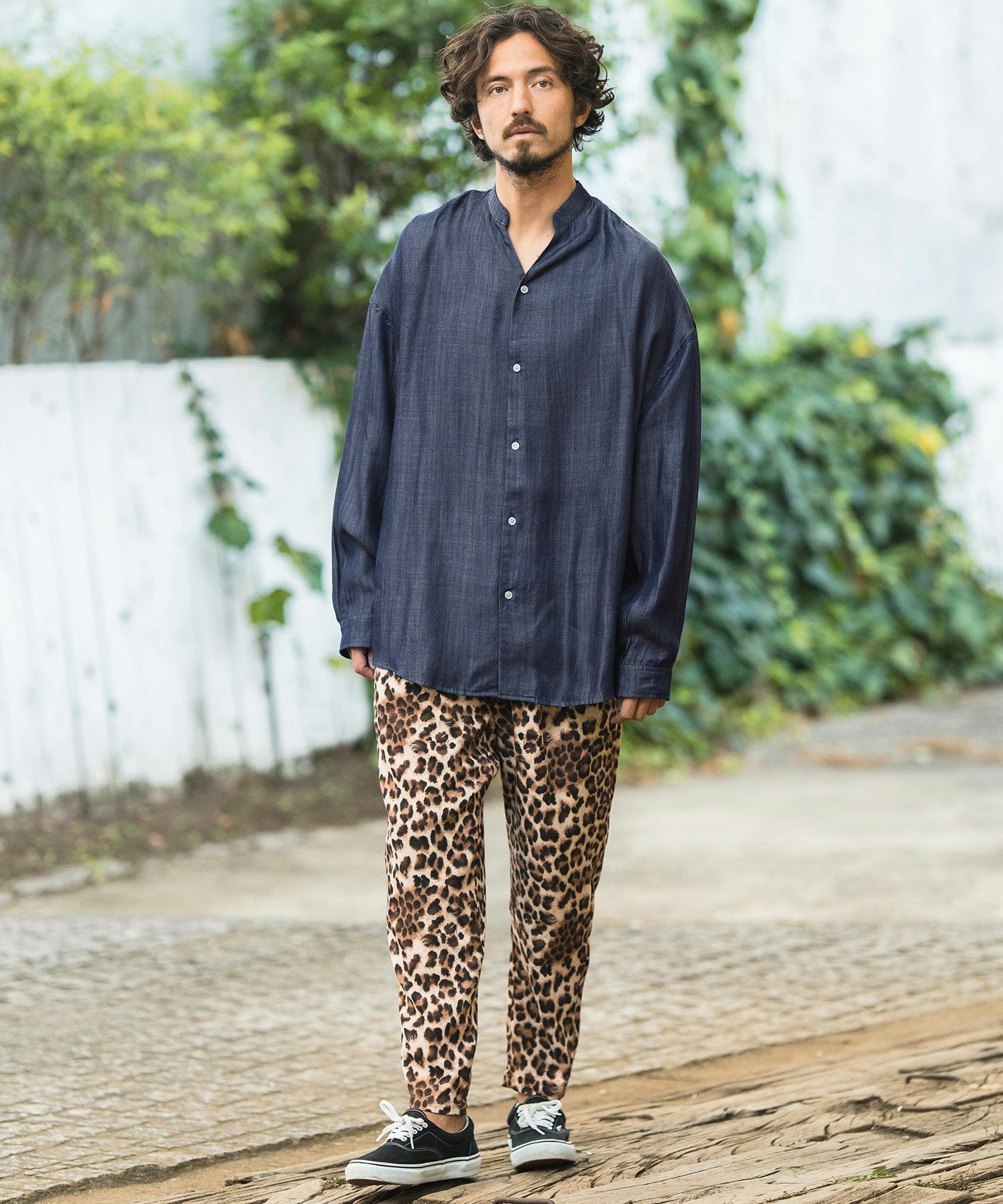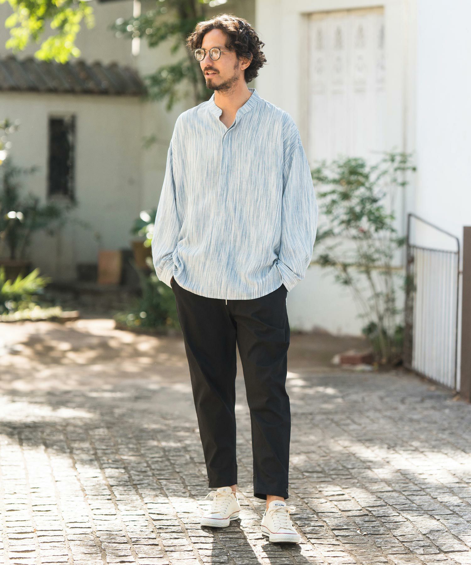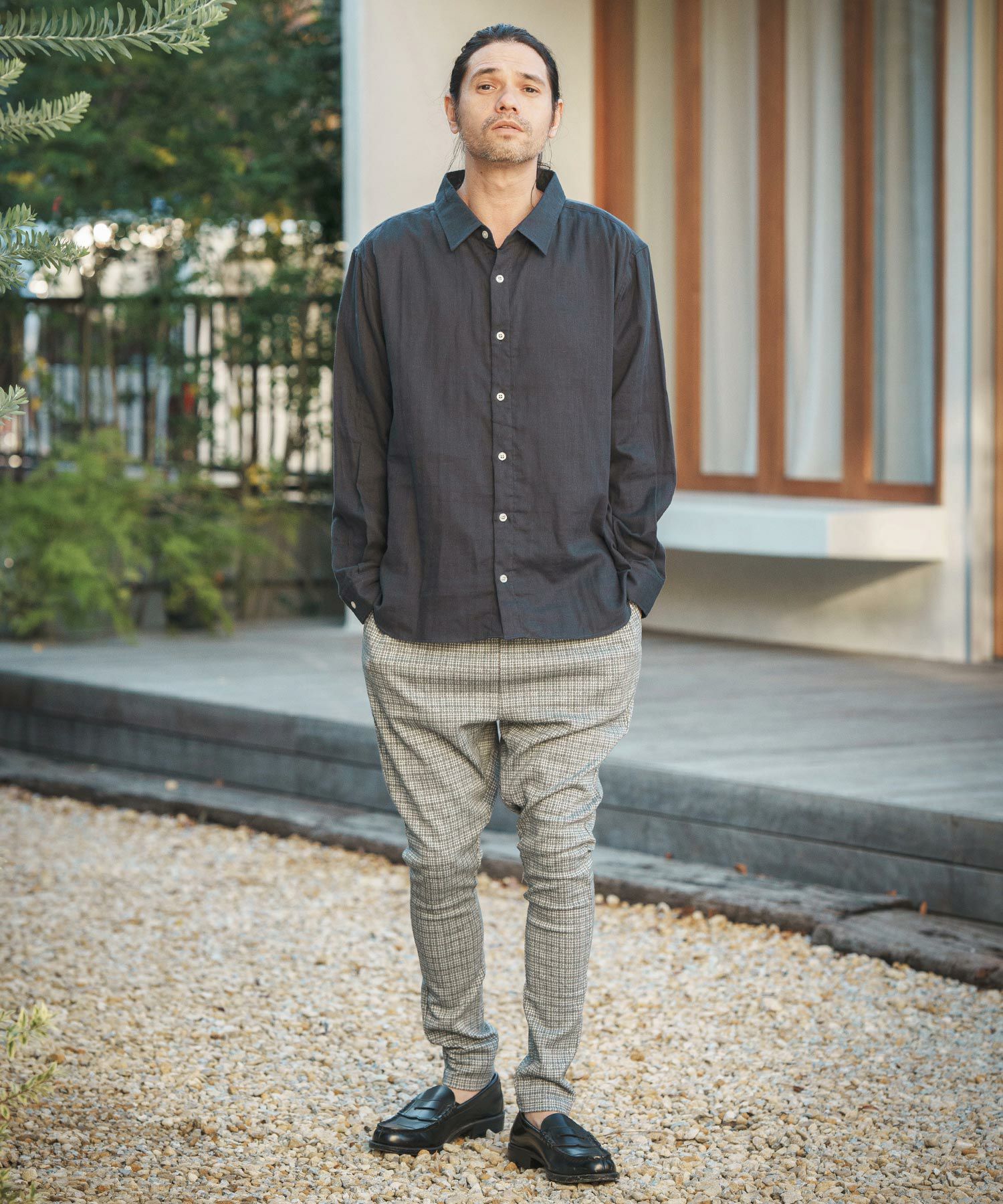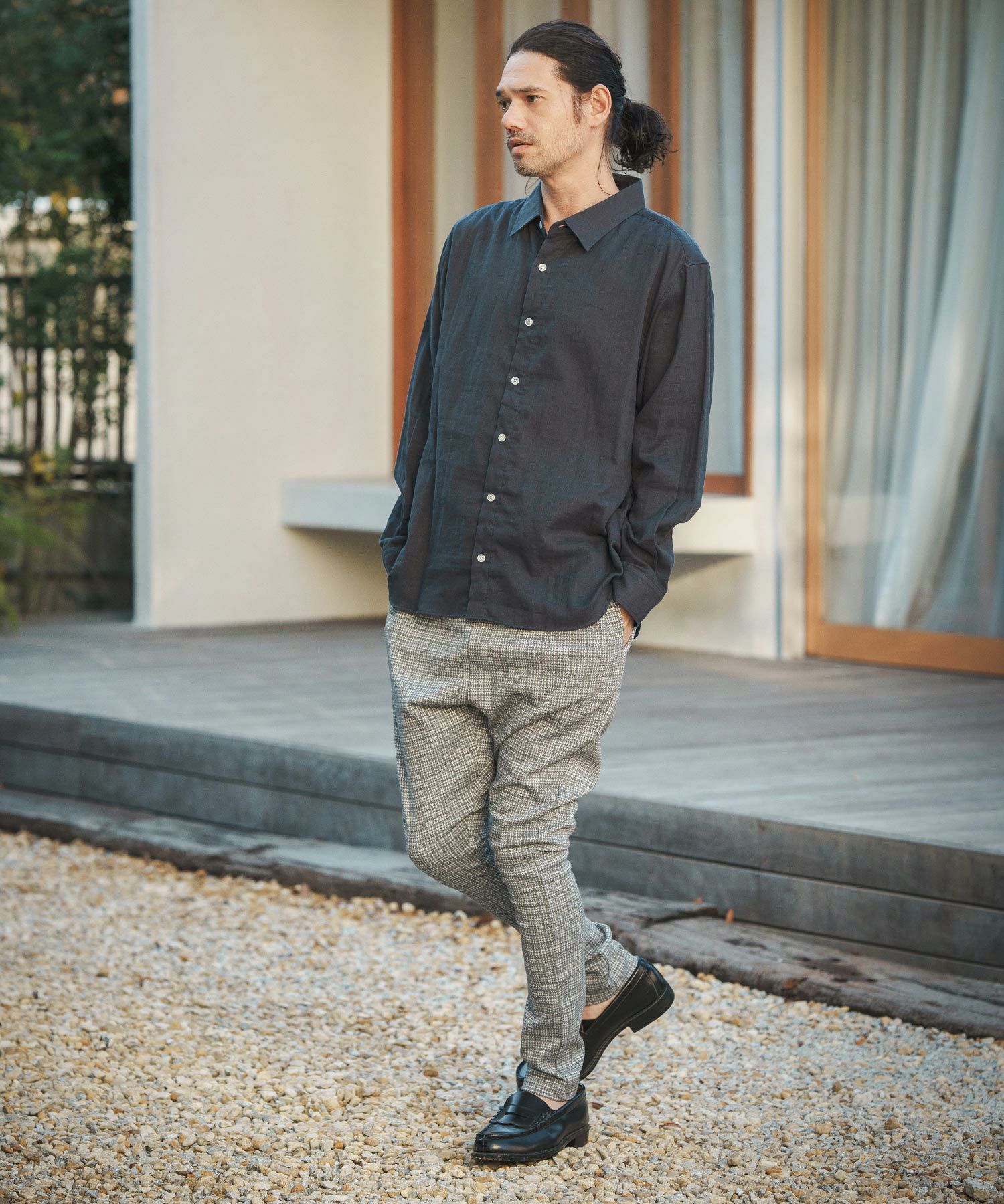 MROLIVE 50%OFF【MROLIVE(ミスターオリーブ)】CLASSIC PATTERN INDIGO LINEN - BAND COLLAR SHIRT バンドカラーシャツ(M241114)