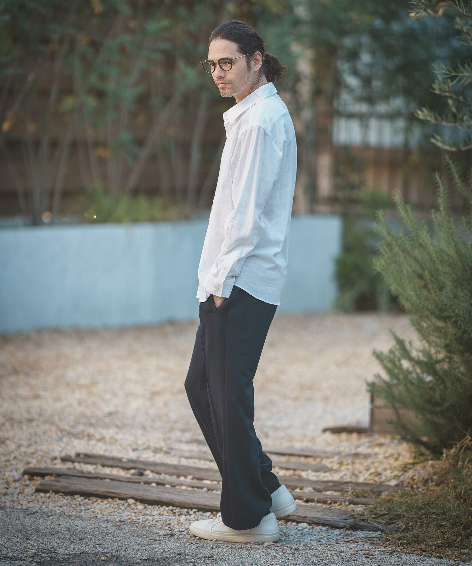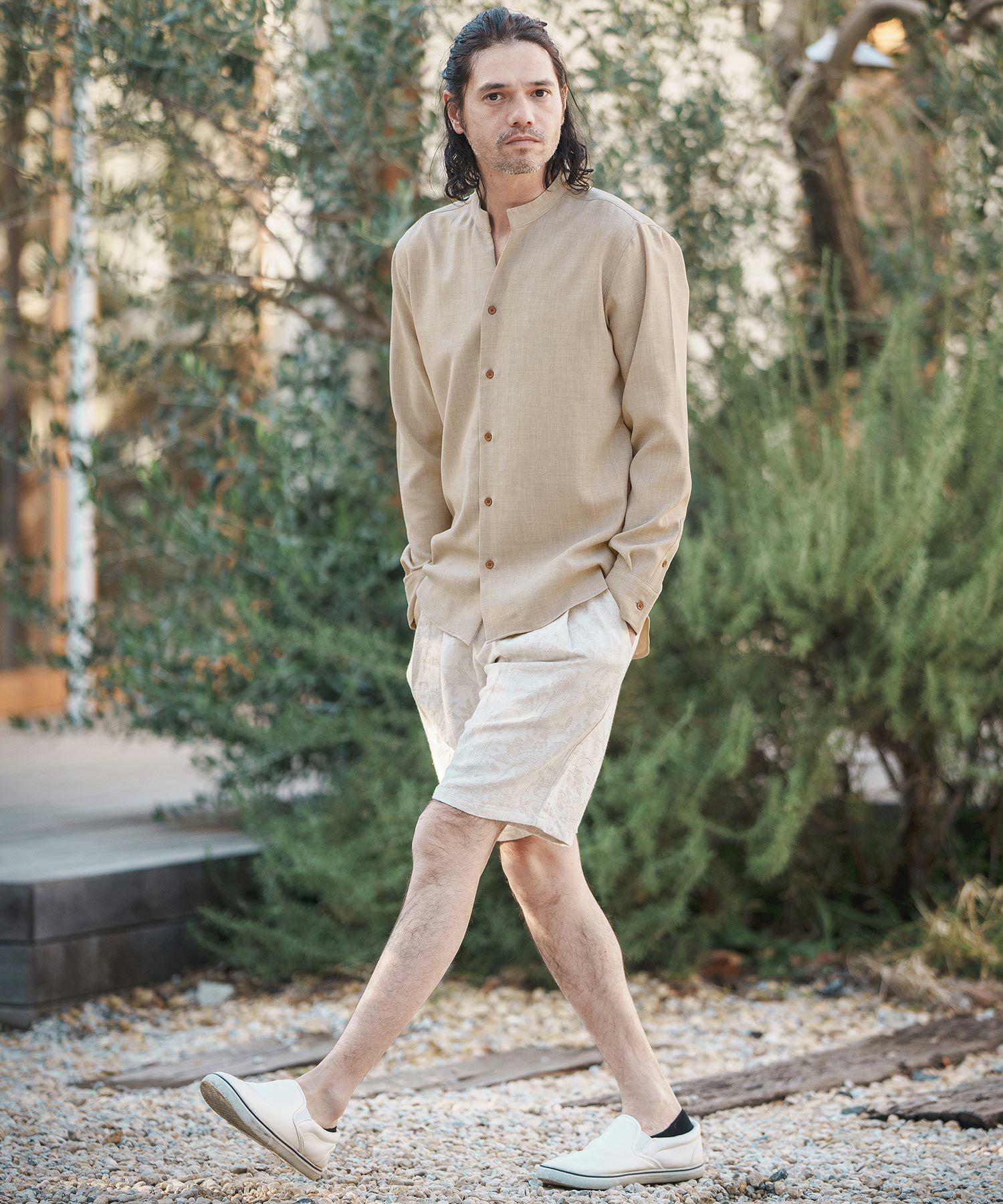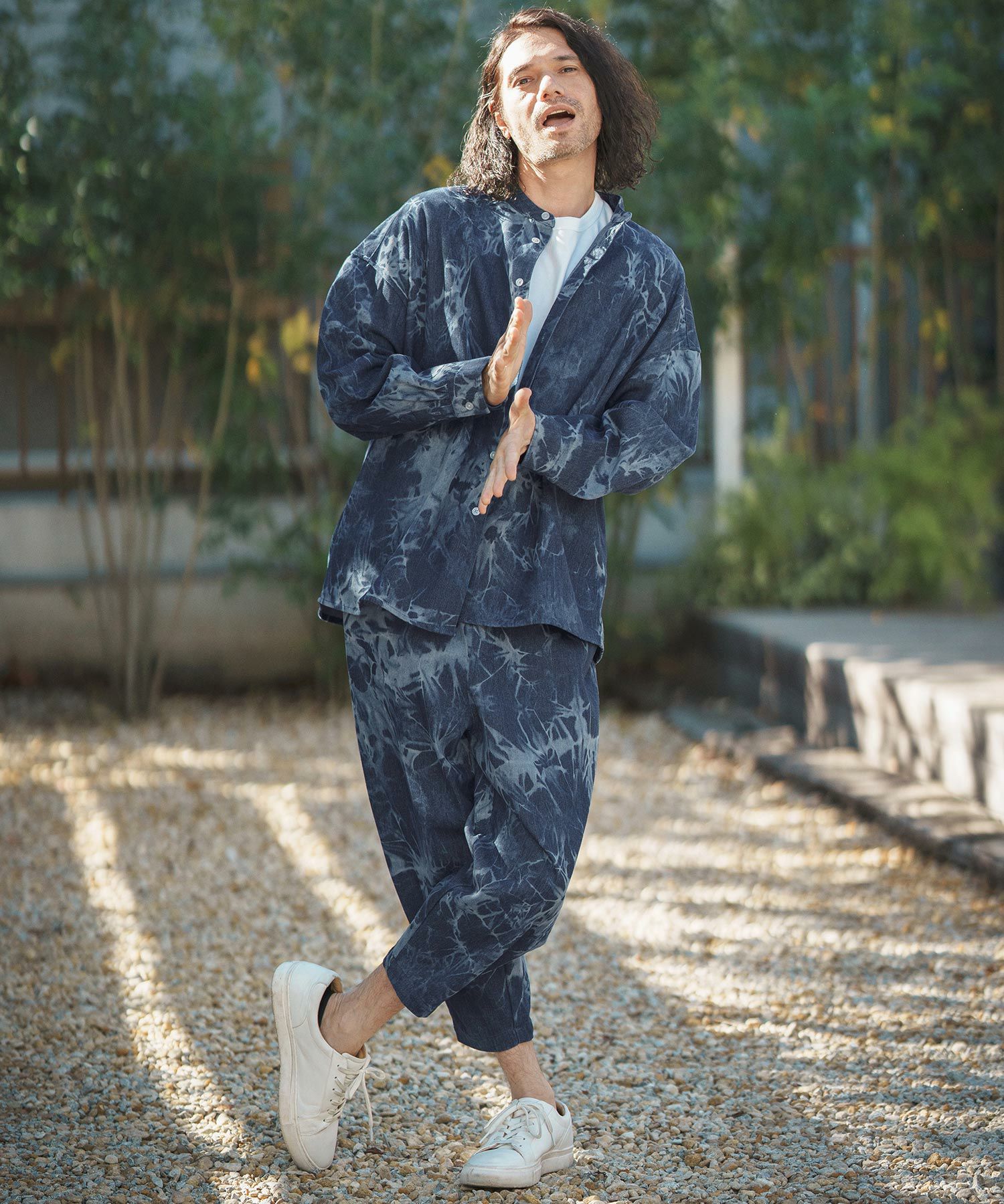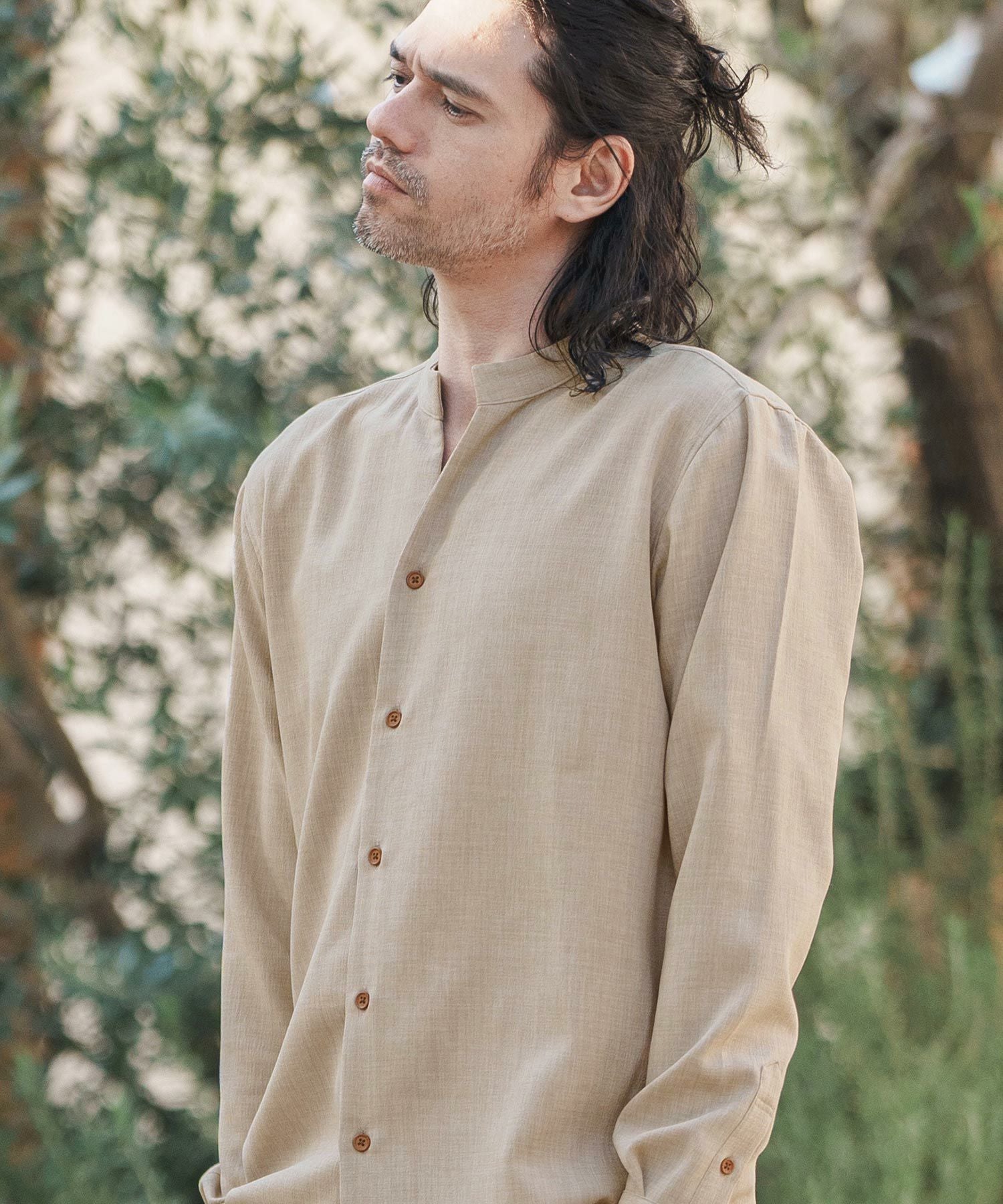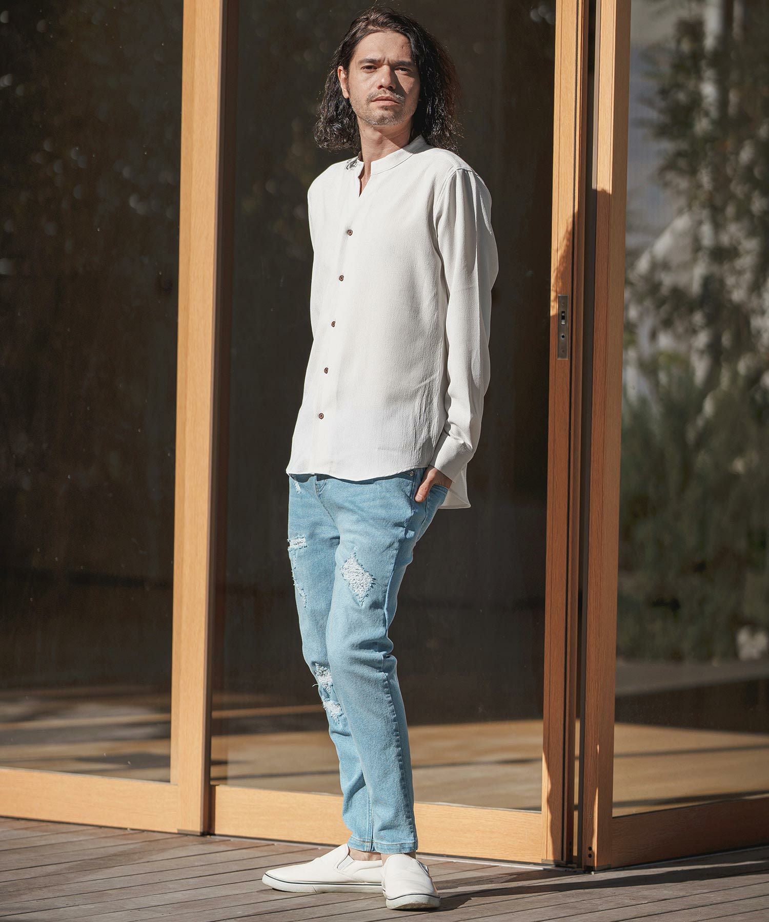 MROLIVE 50%OFF【MROLIVE(ミスターオリーブ)】CLASSIC PATTERN INDIGO LINEN - BAND COLLAR SHIRT バンドカラーシャツ(M241114)