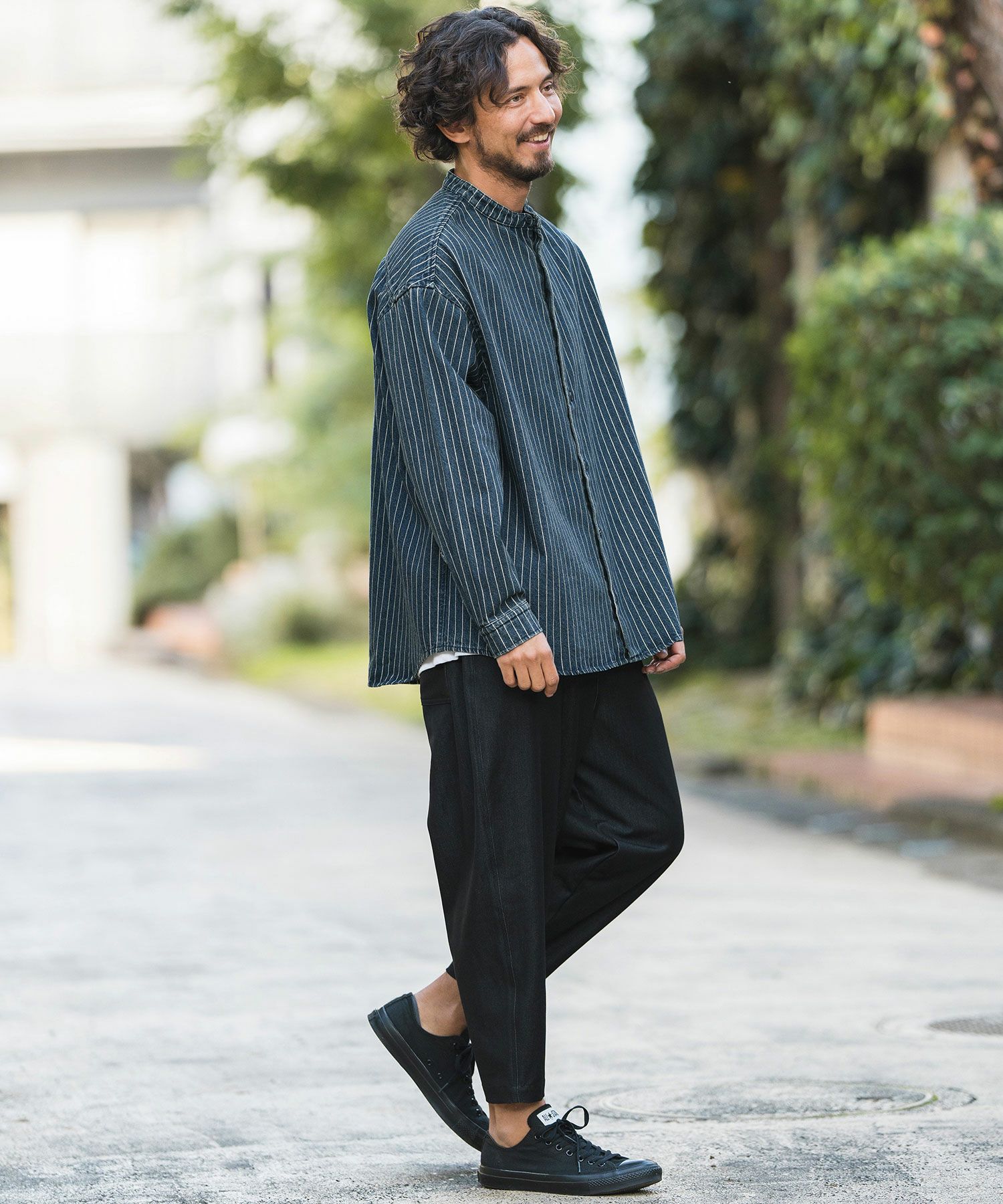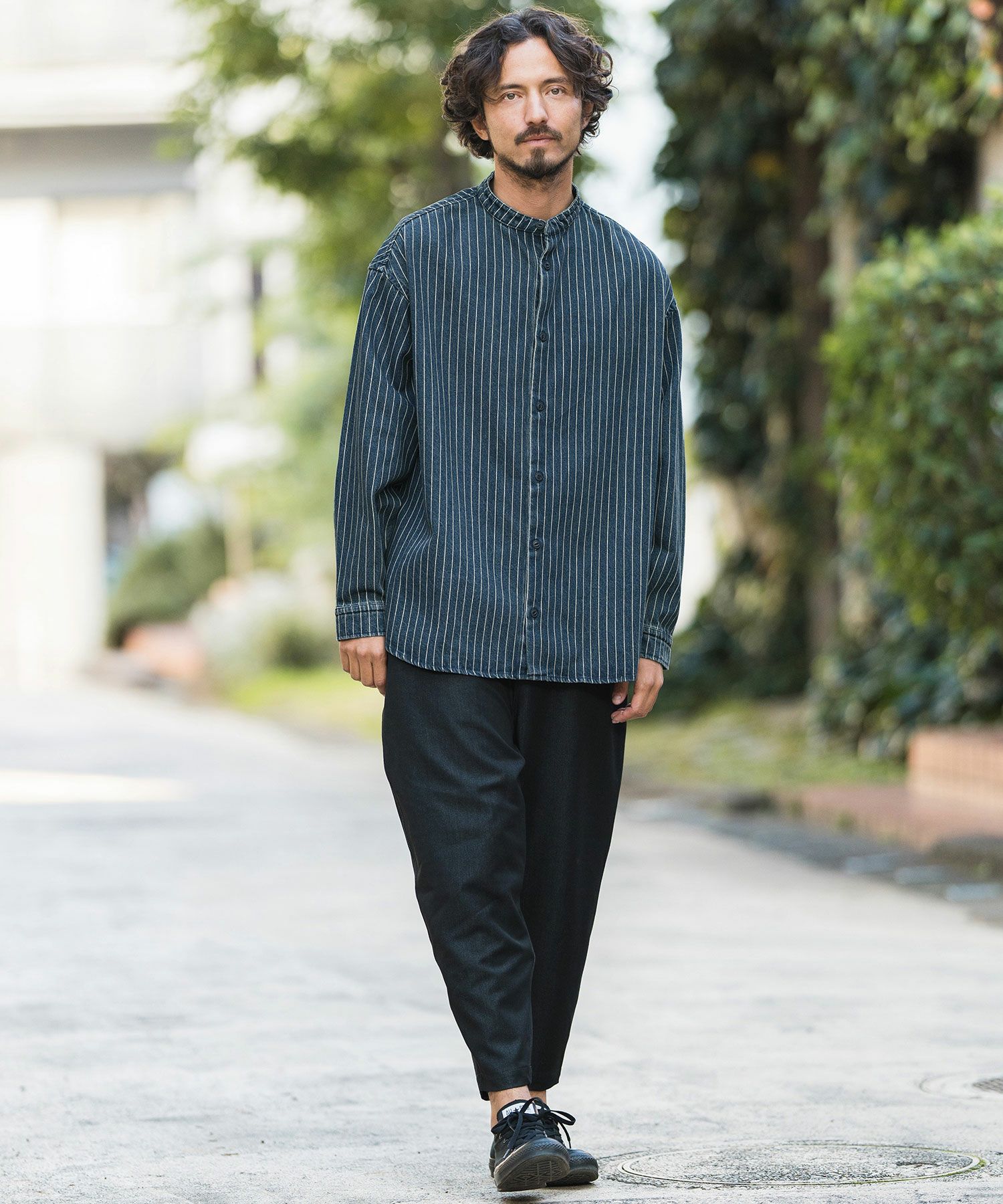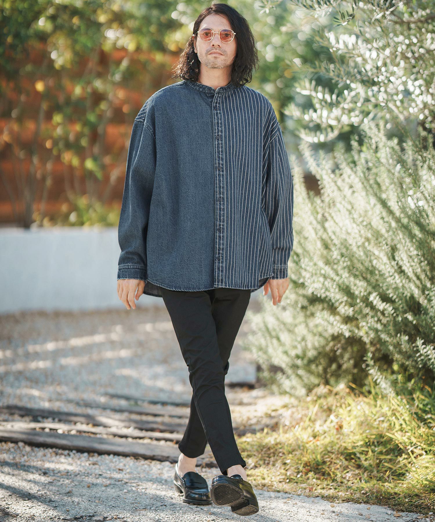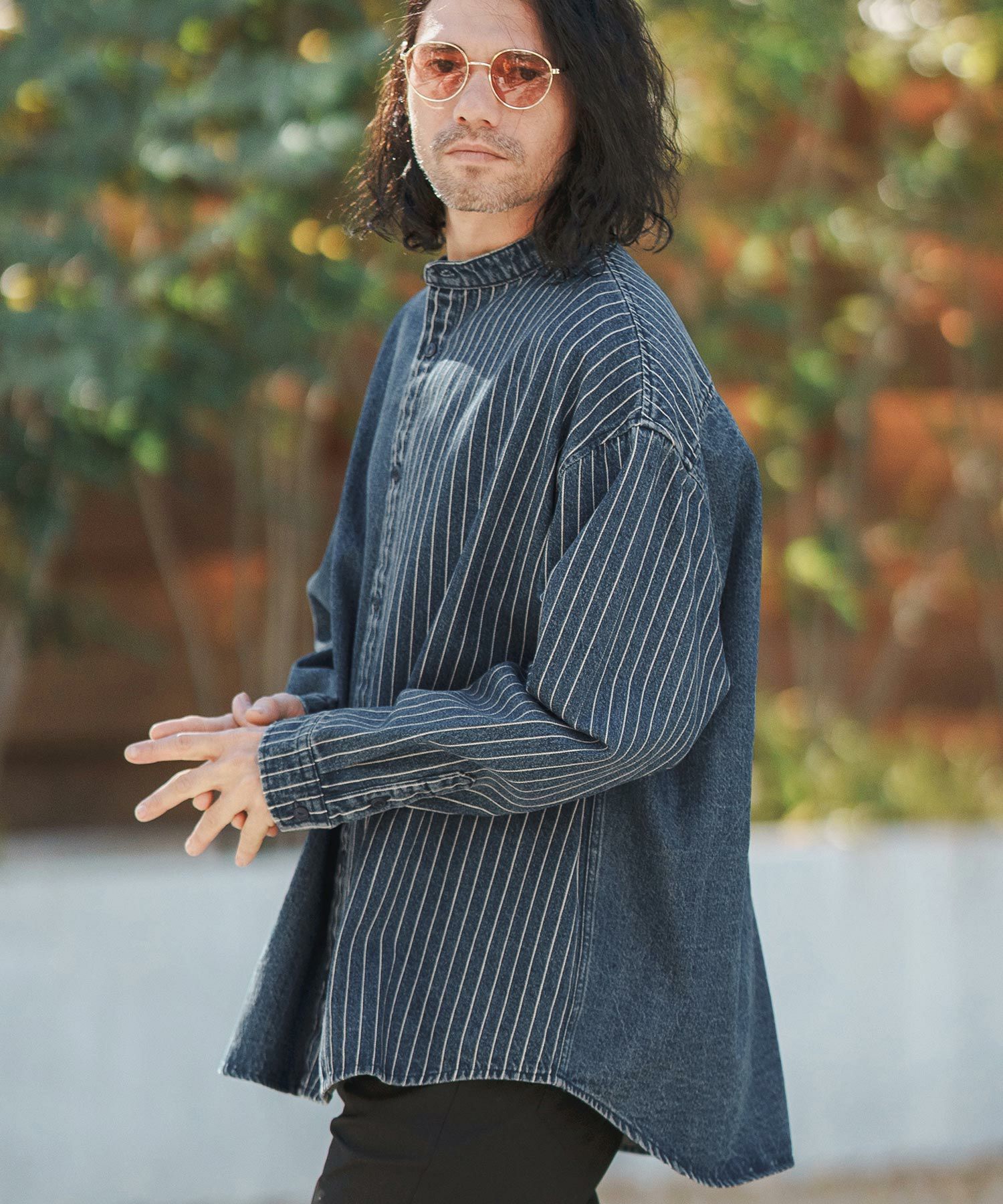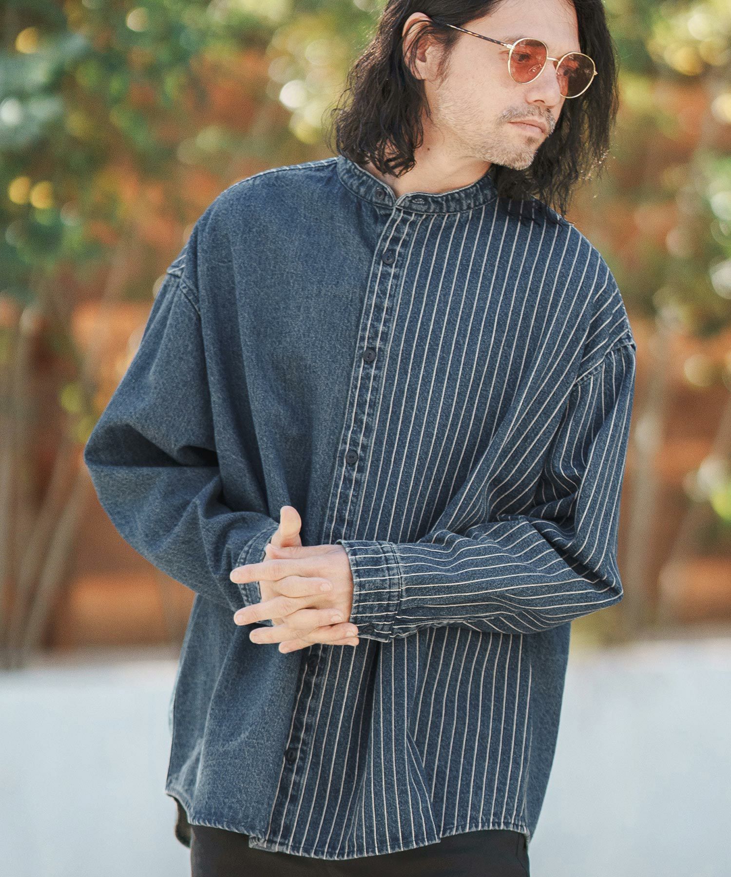 CAMBIO 30%OFF【CAMBIO(カンビオ)】Stripe Denim Chemical Wash Band Collar Shirts シャツ(MIU-241-005)