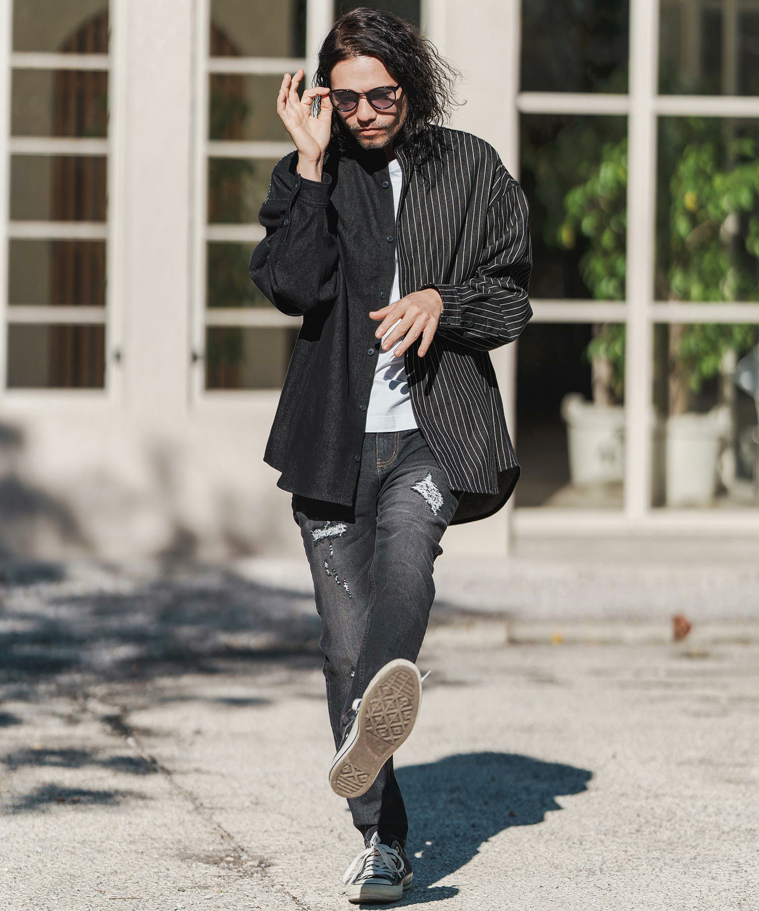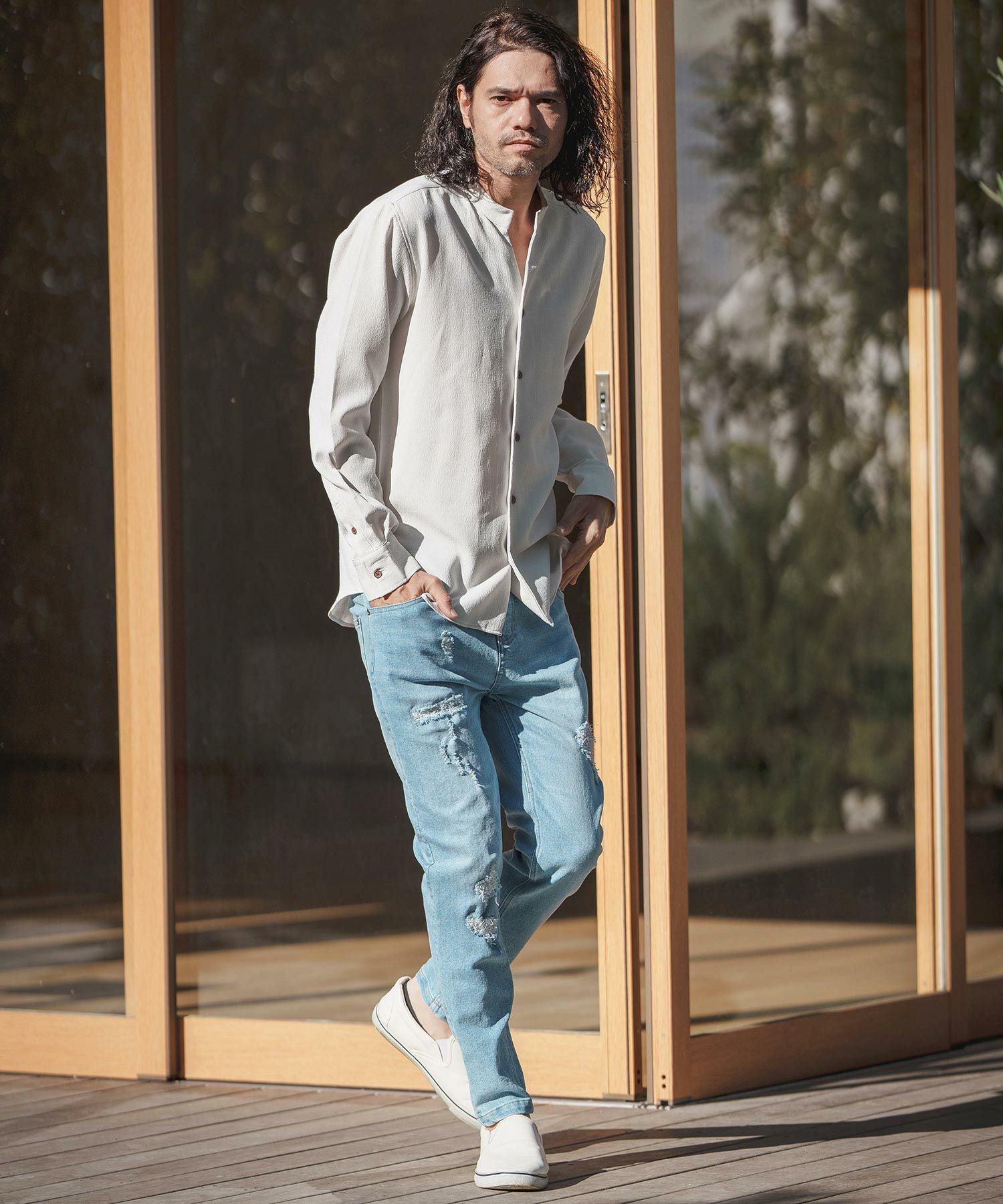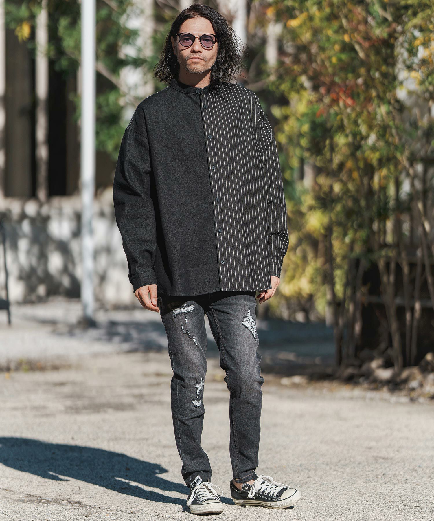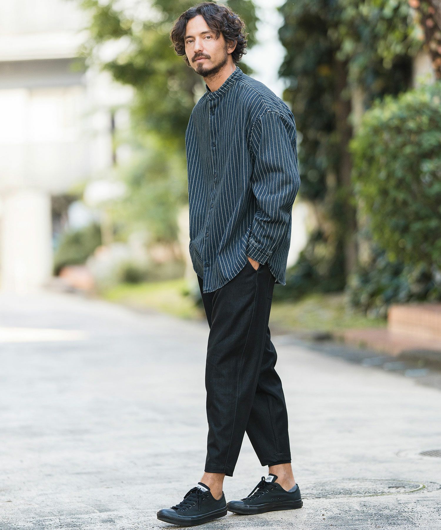CAMBIO 30%OFF【CAMBIO(カンビオ)】Stripe Denim Chemical Wash Band Collar Shirts シャツ(MIU-241-005)