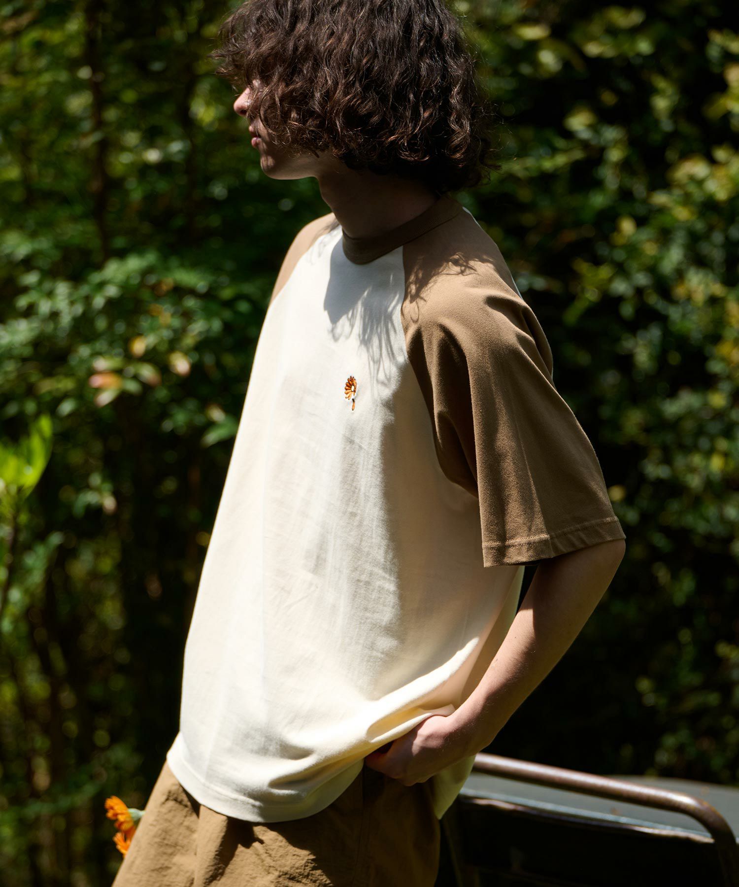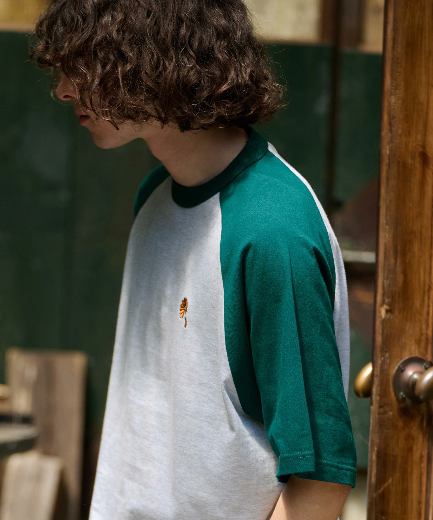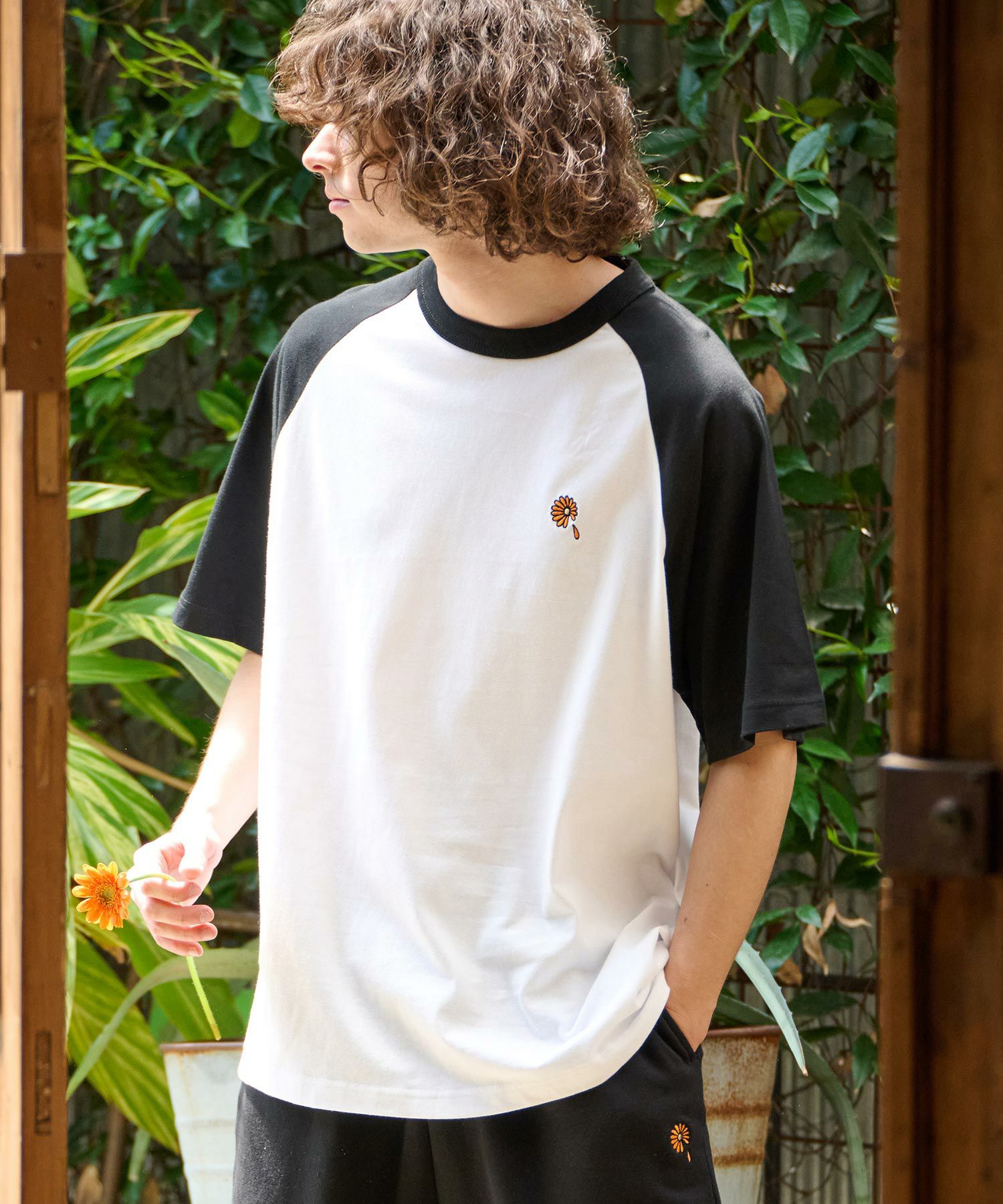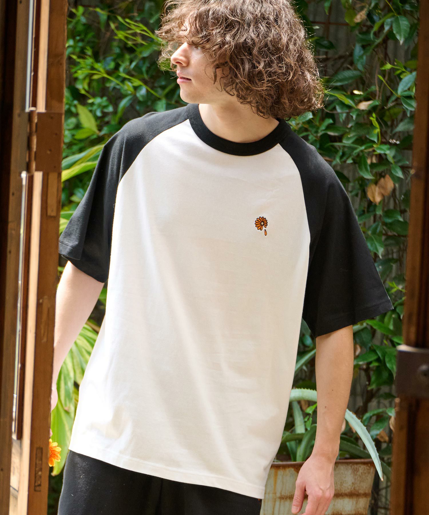ガーベラのワンポイント刺繍を施したラグランスリーブTシャツ。