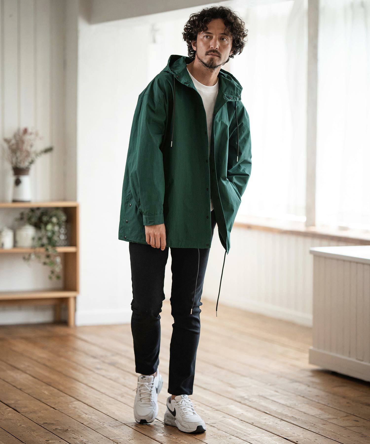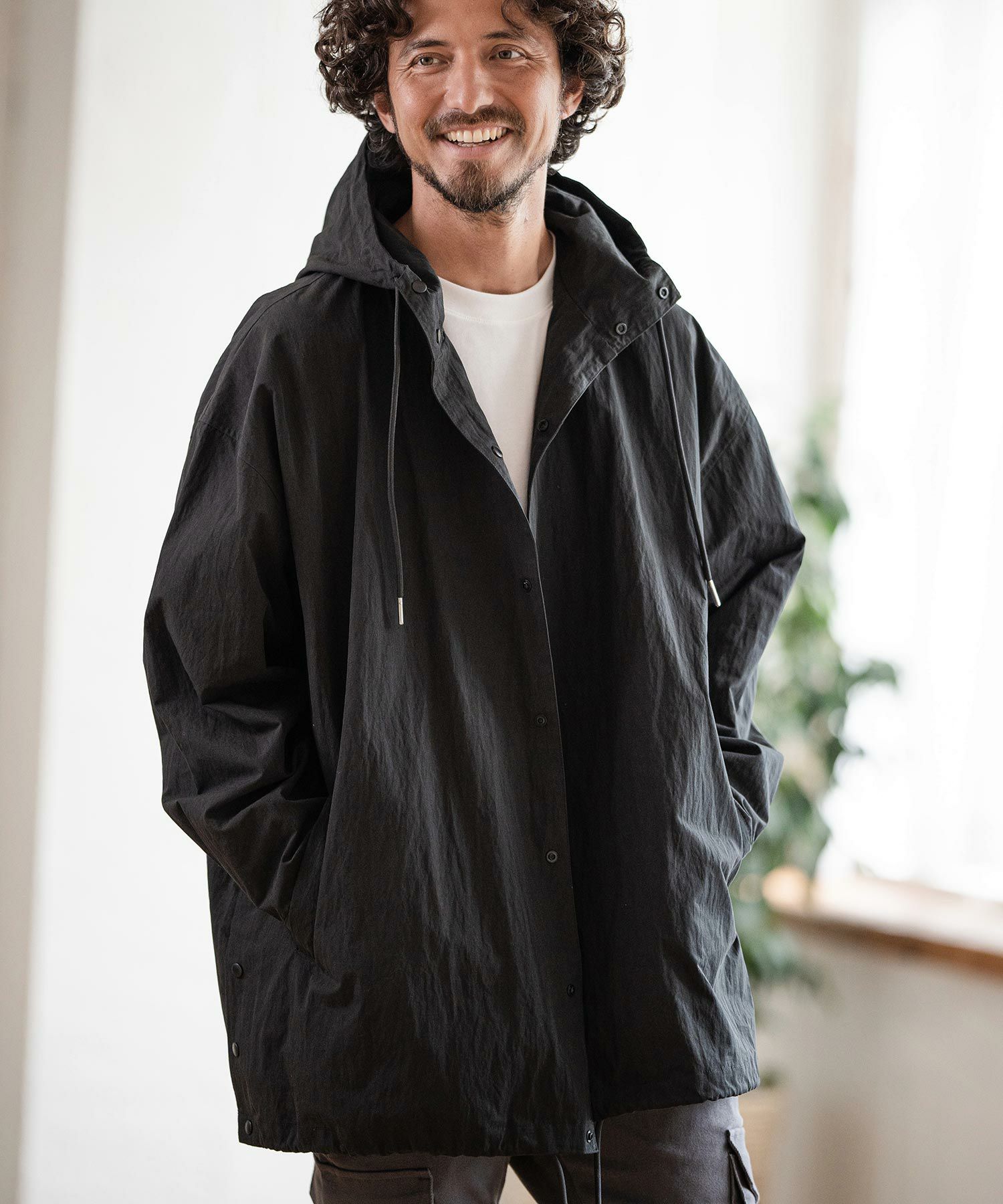 シルエットは着丈長めなコートタイプ、たっぷりとした身幅のルーズシルエットでカジュアルなフォルム、また寒い日には厚めのインナーを着込むことも可能です。