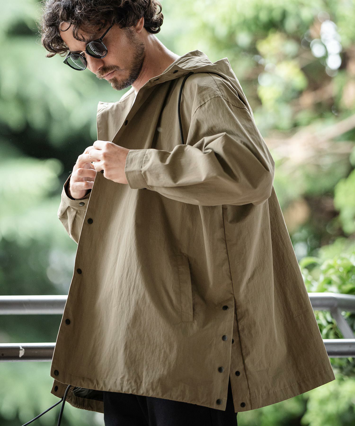 フードデザインに加えフロントをスナップボタンにしたカジュアルディティールのシャツコート、裏地1枚の仕様でラフに軽く羽織るようなイメージに最適で秋・春の着用に適した肉感です。