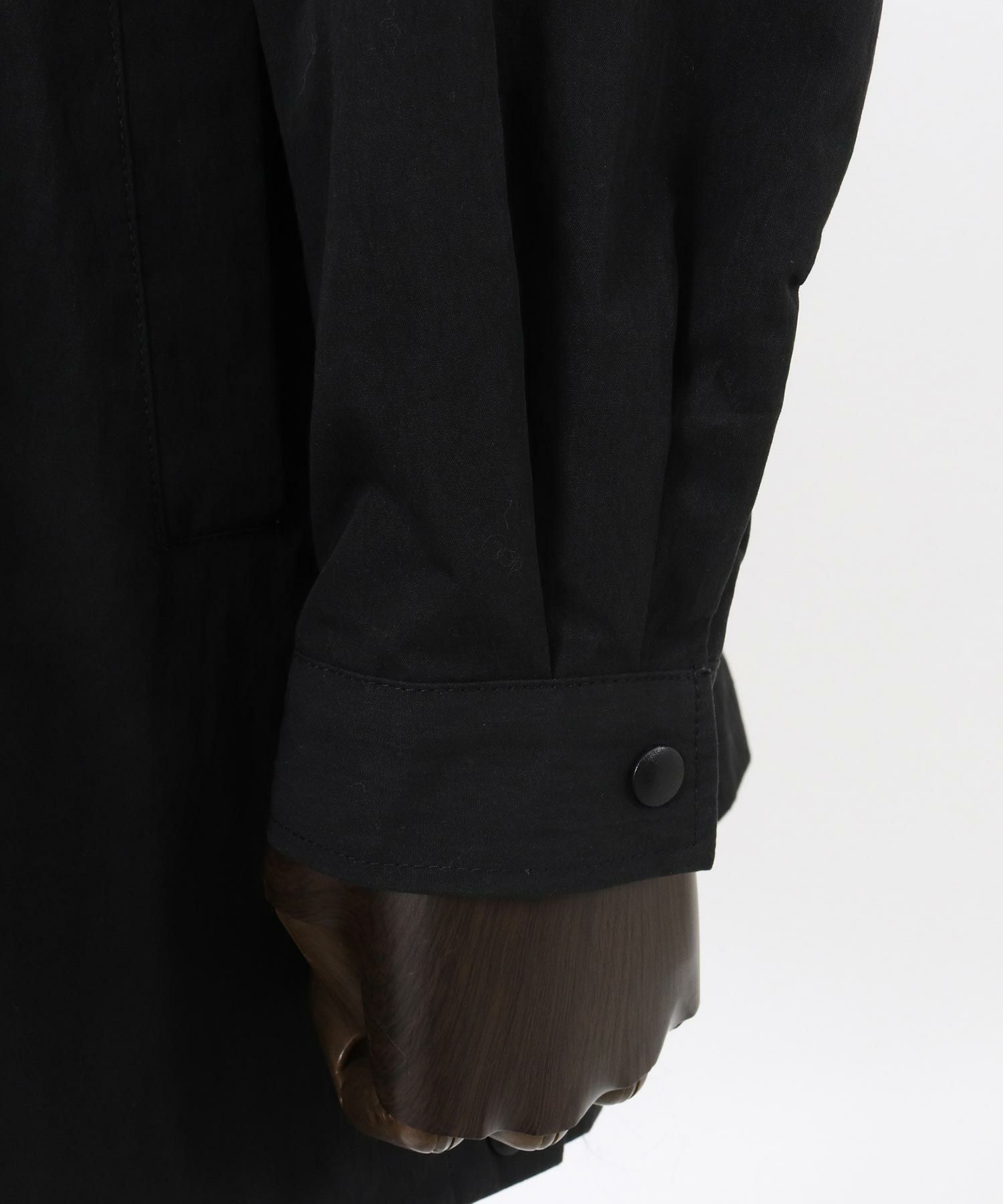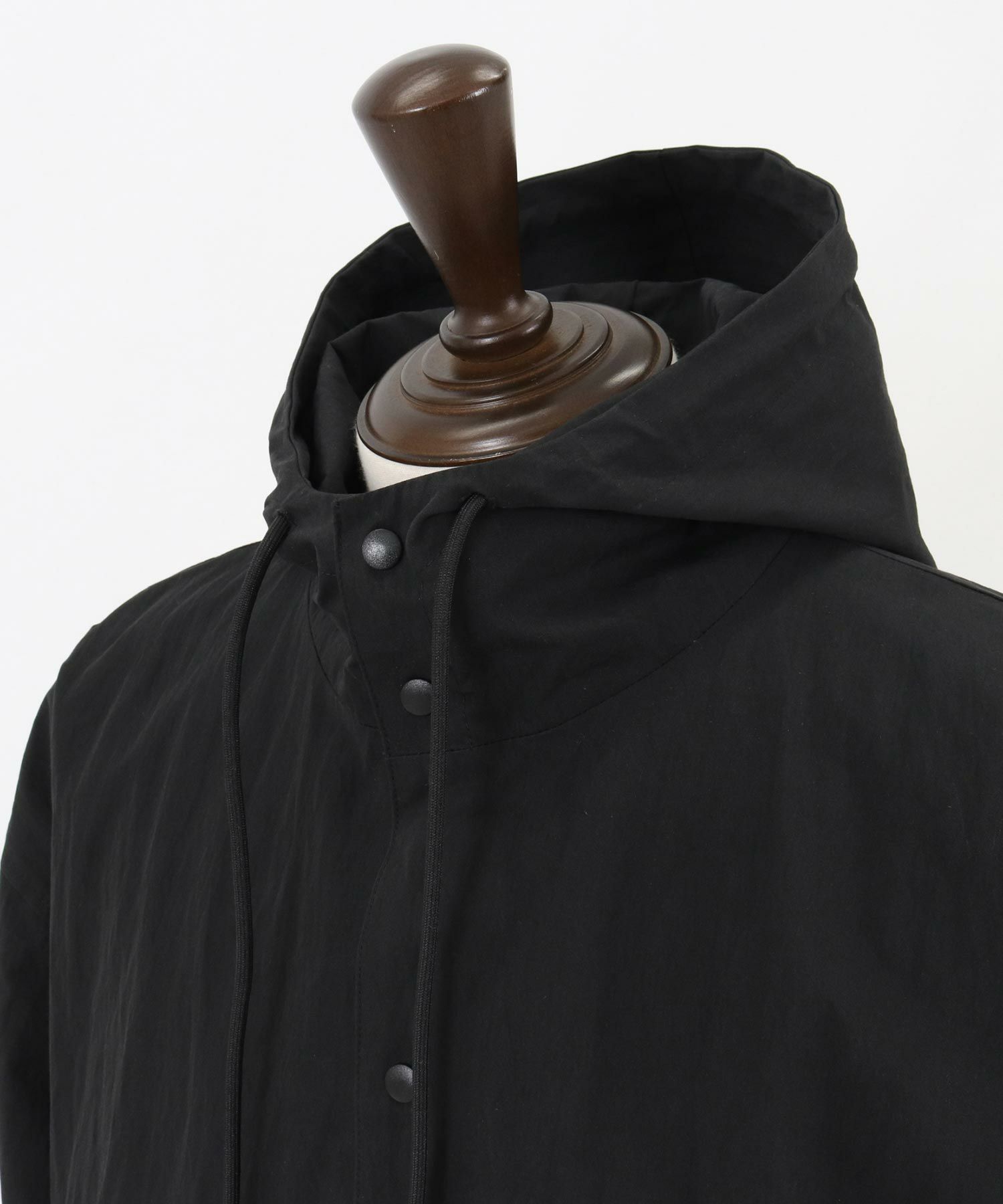 首元までスナップボタンが付いたフーデッドタイプでアウター要素のあるディティールワーク、着丈を長めに設定しコートのフォルムを採用、全体的にアウター的な要素をベースとしつつも使用生地の肉感はシャツ感覚で袖口はシャツモチーフのカフスデザインを取り入れた文字通りシャツコートといった仕上げです。