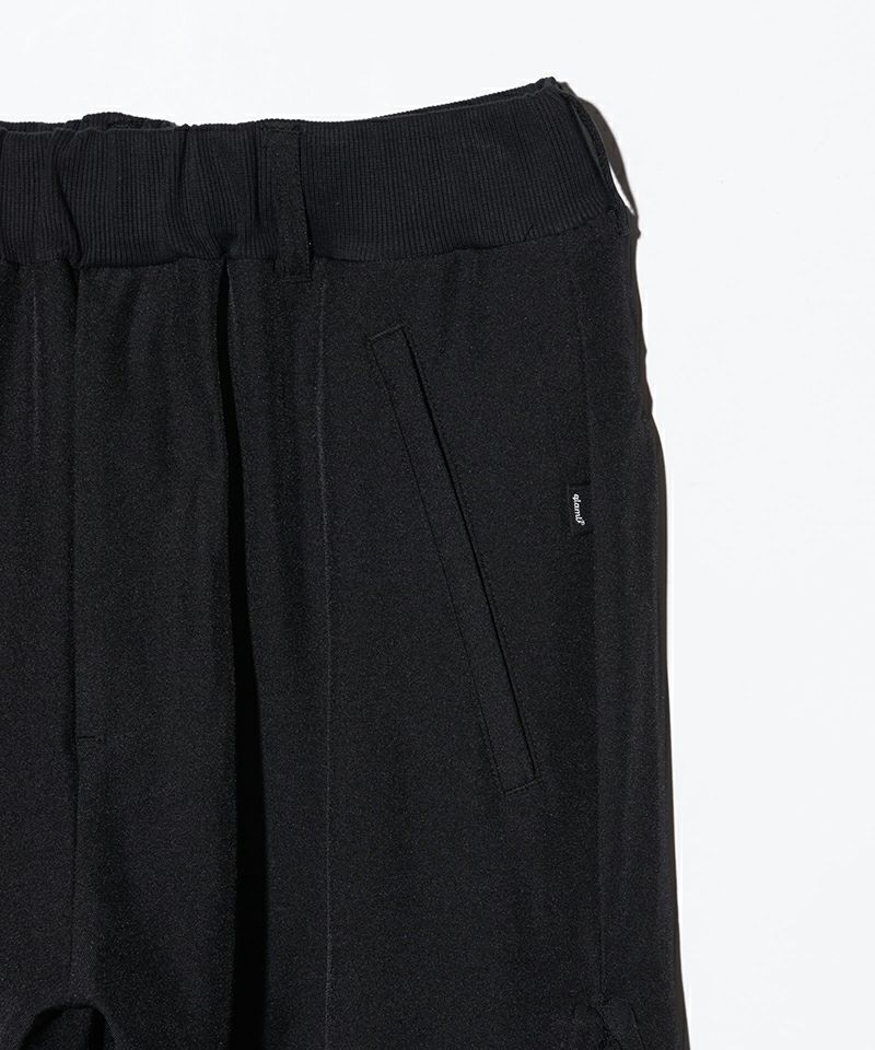 ワイドシルエット仕立てのボトムスはスーツ生地のサイドシーム部分を裾元までオープンし、隙間をスウェットのフェイクレイヤードパーツで切り替え。