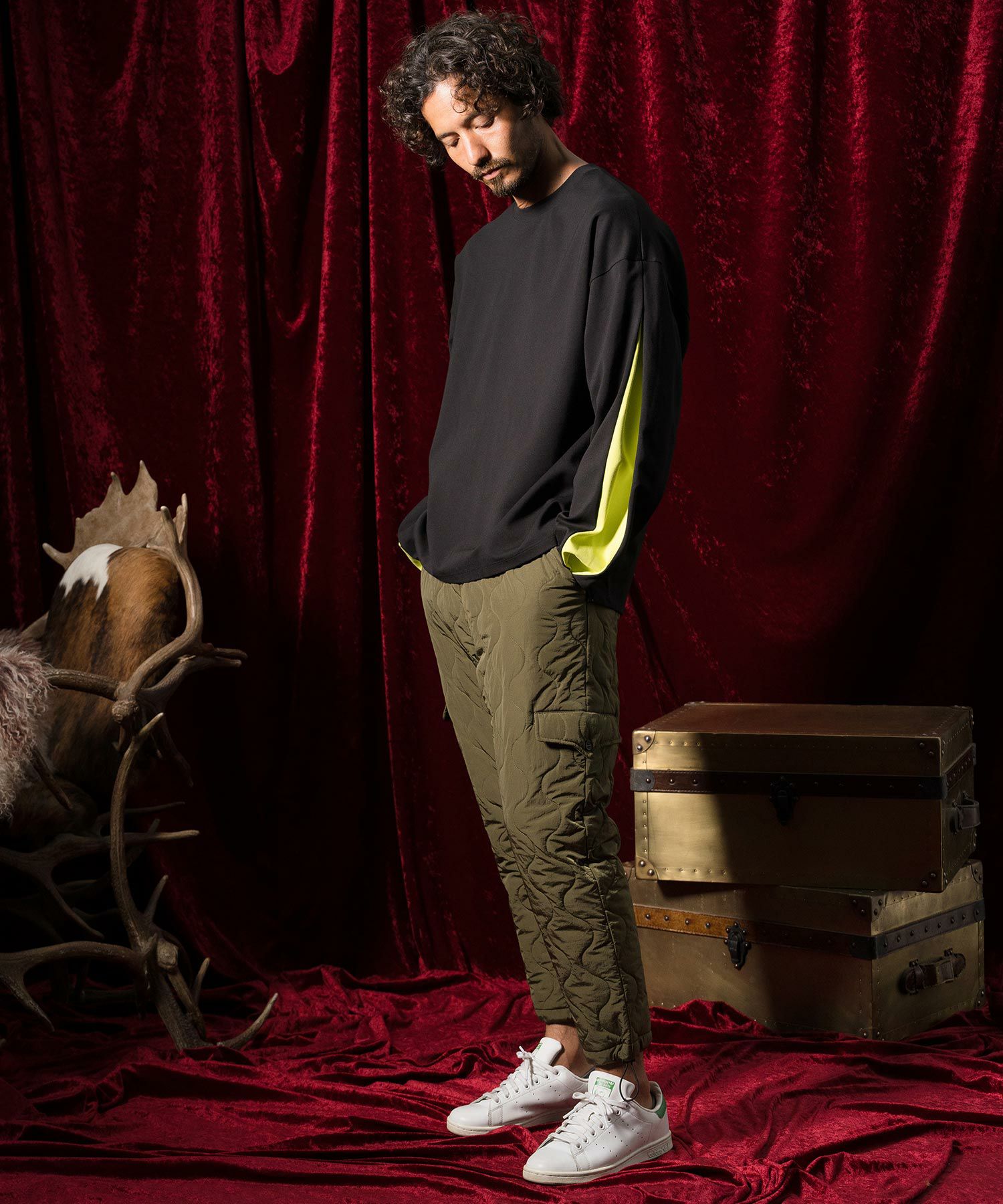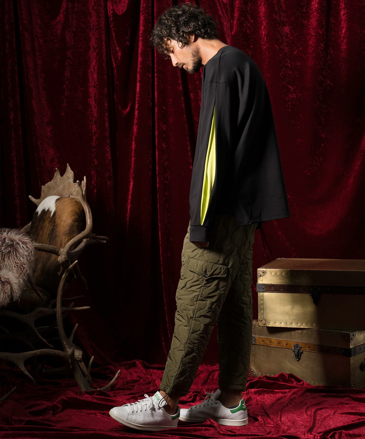 ワイド感覚なシルエットに加え、袖口周りのボリューム感があいまった個性的なシルエットが、コーディネートに変化をもたらす1着です。