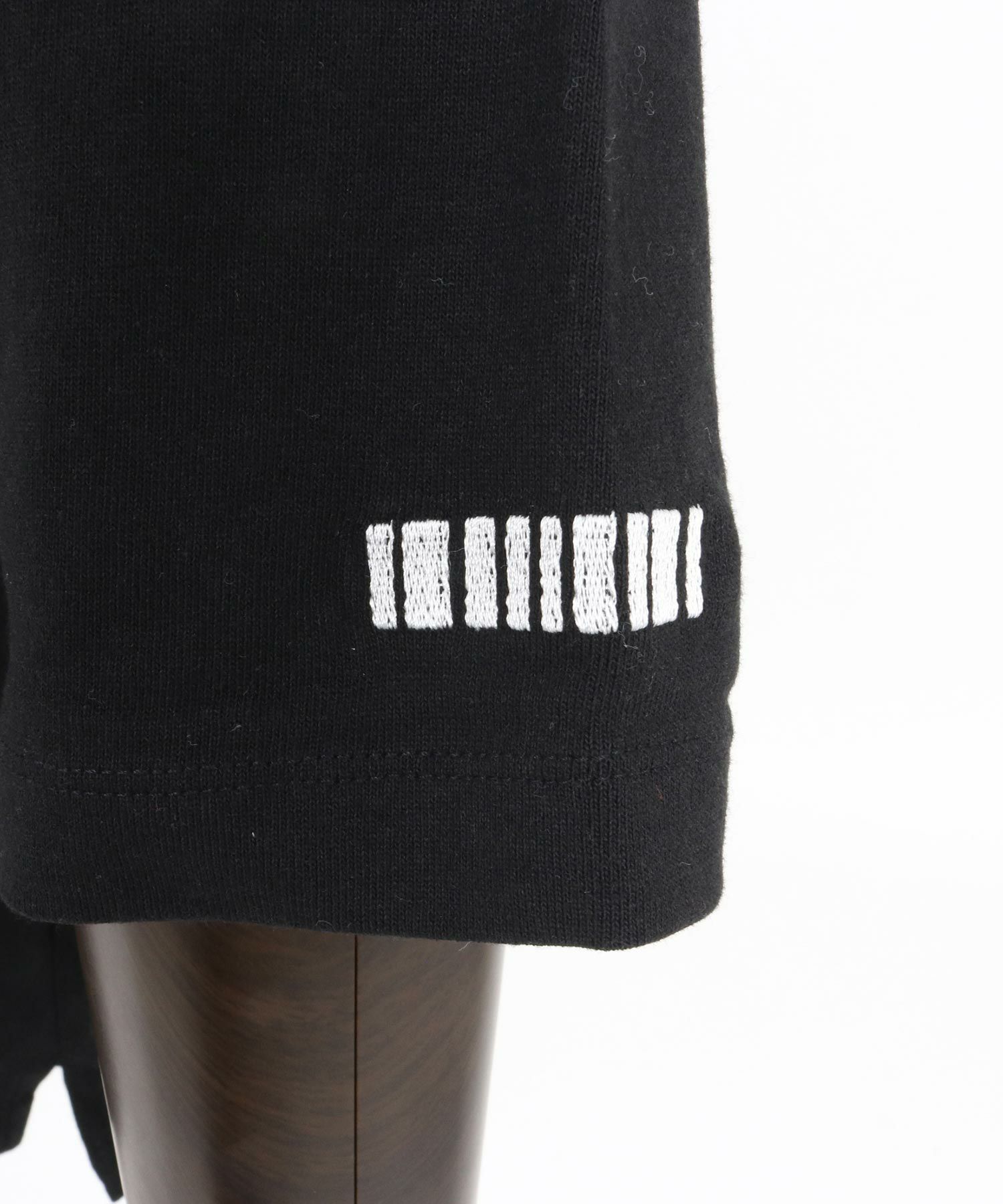 胸にはシンプルながらも存在感のあるロゴプリント、アイコンであるバーコード刺繍は左袖にセット。