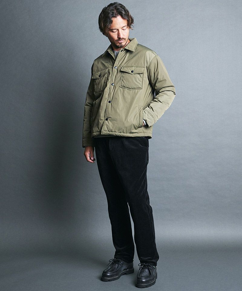 表地にはタテ/ヨコに70Dセミダルナイロンを使用し、ヨコは撚りをかけたフィラメント糸、フラットな表面感と上質な光沢感のある撥水加工を施したタフタ素材、裏地にはボアをセットしたコーチジャケット。