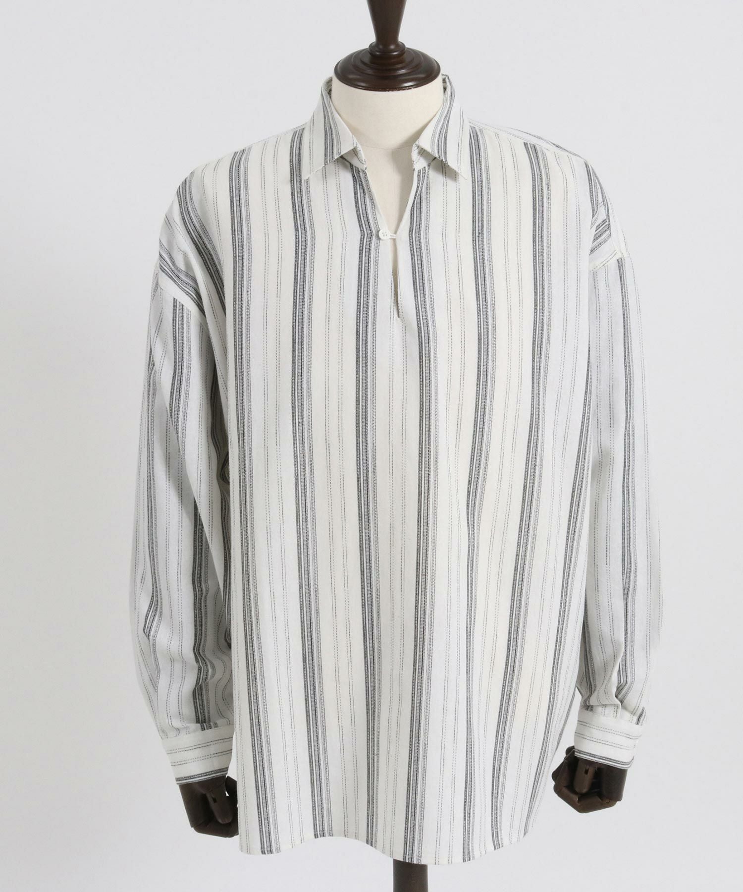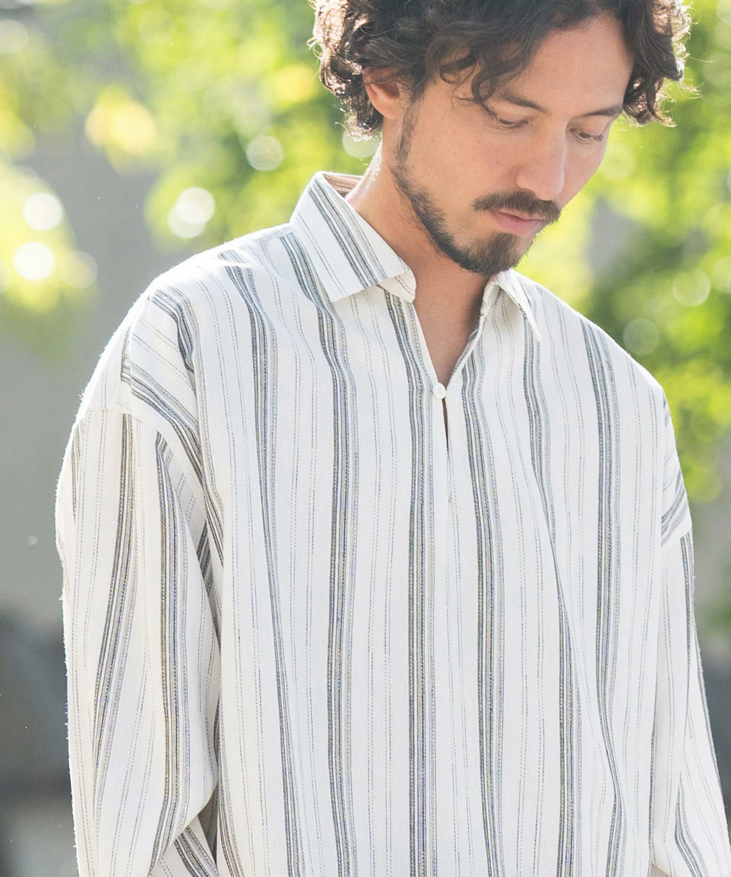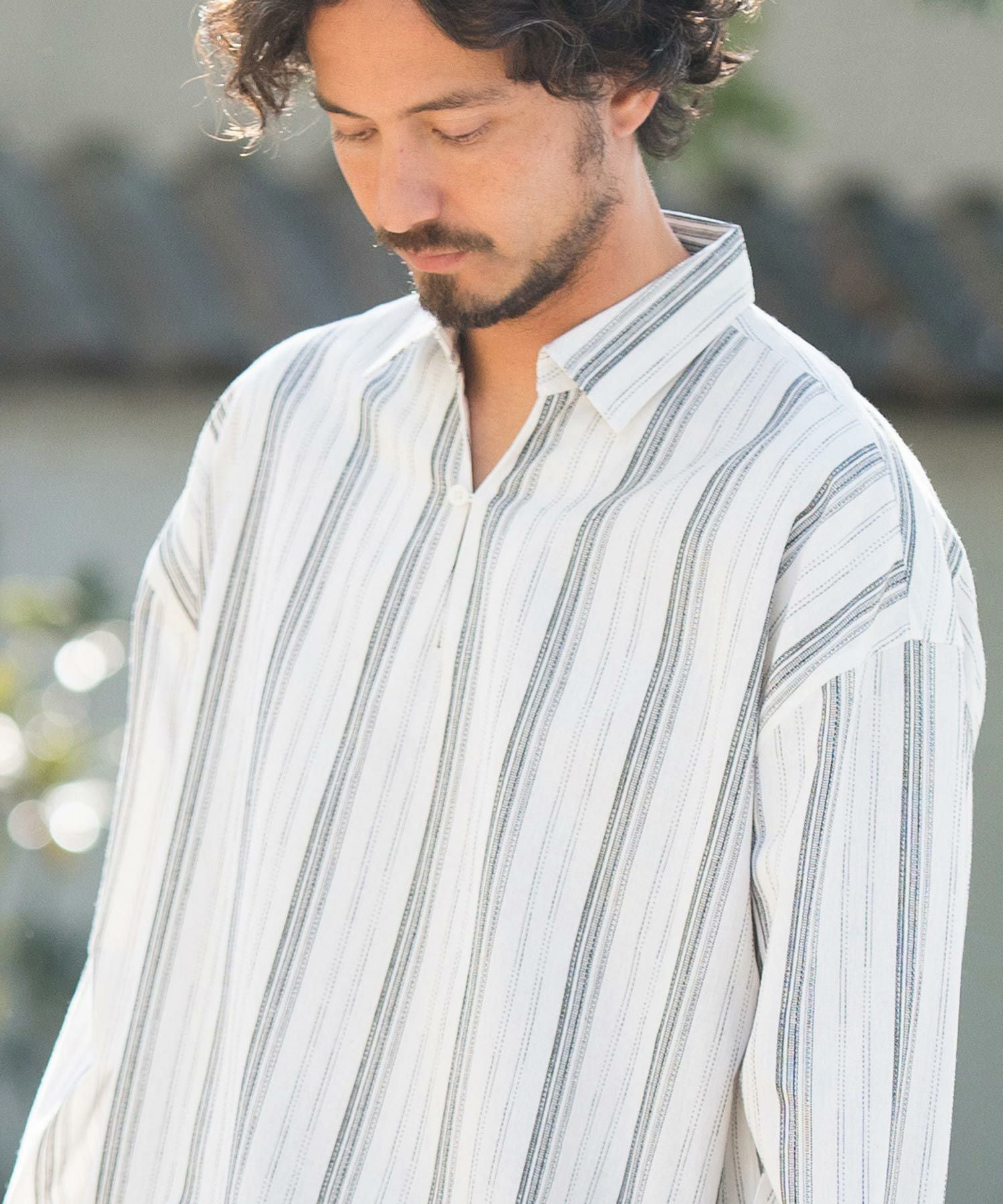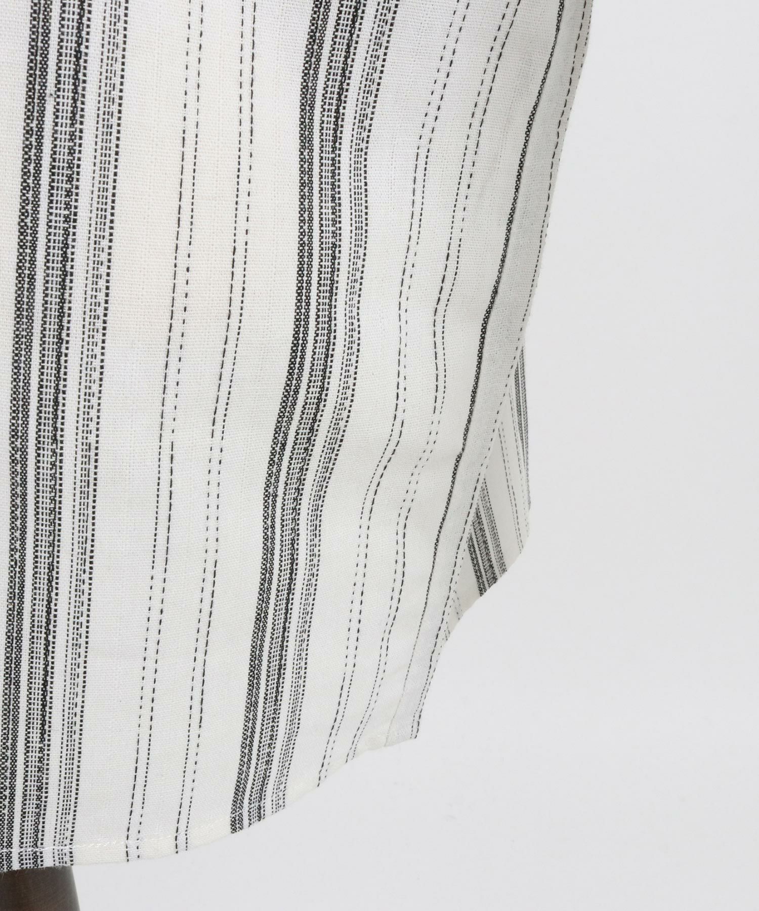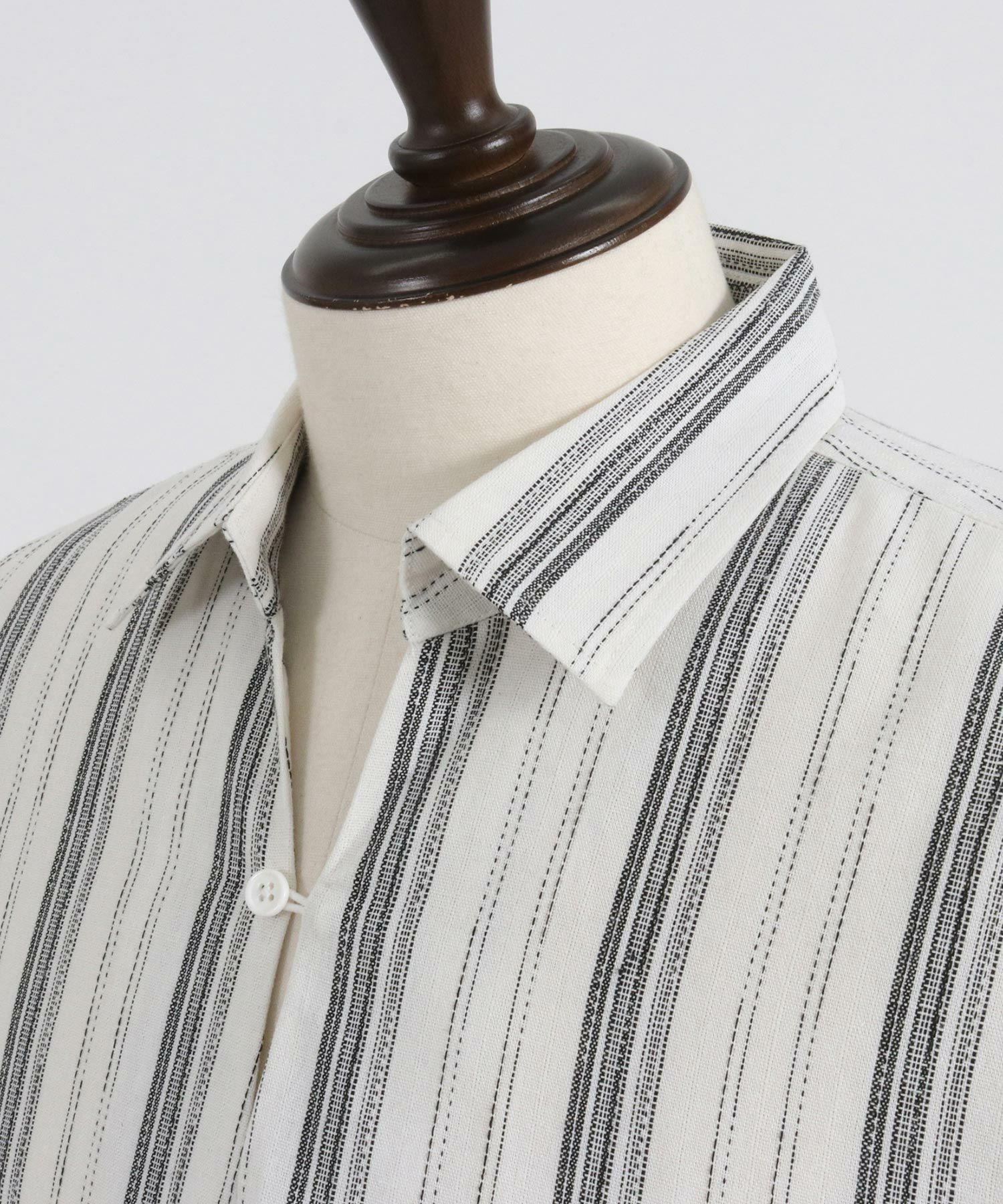 凹凸感のあるJQストライプ柄が特徴のリネン混素材を採用、シルエットはドロップショルダーを採用しワイドでありながら着丈は長すぎないトレンド感あるワイドシルエットに仕上げました。