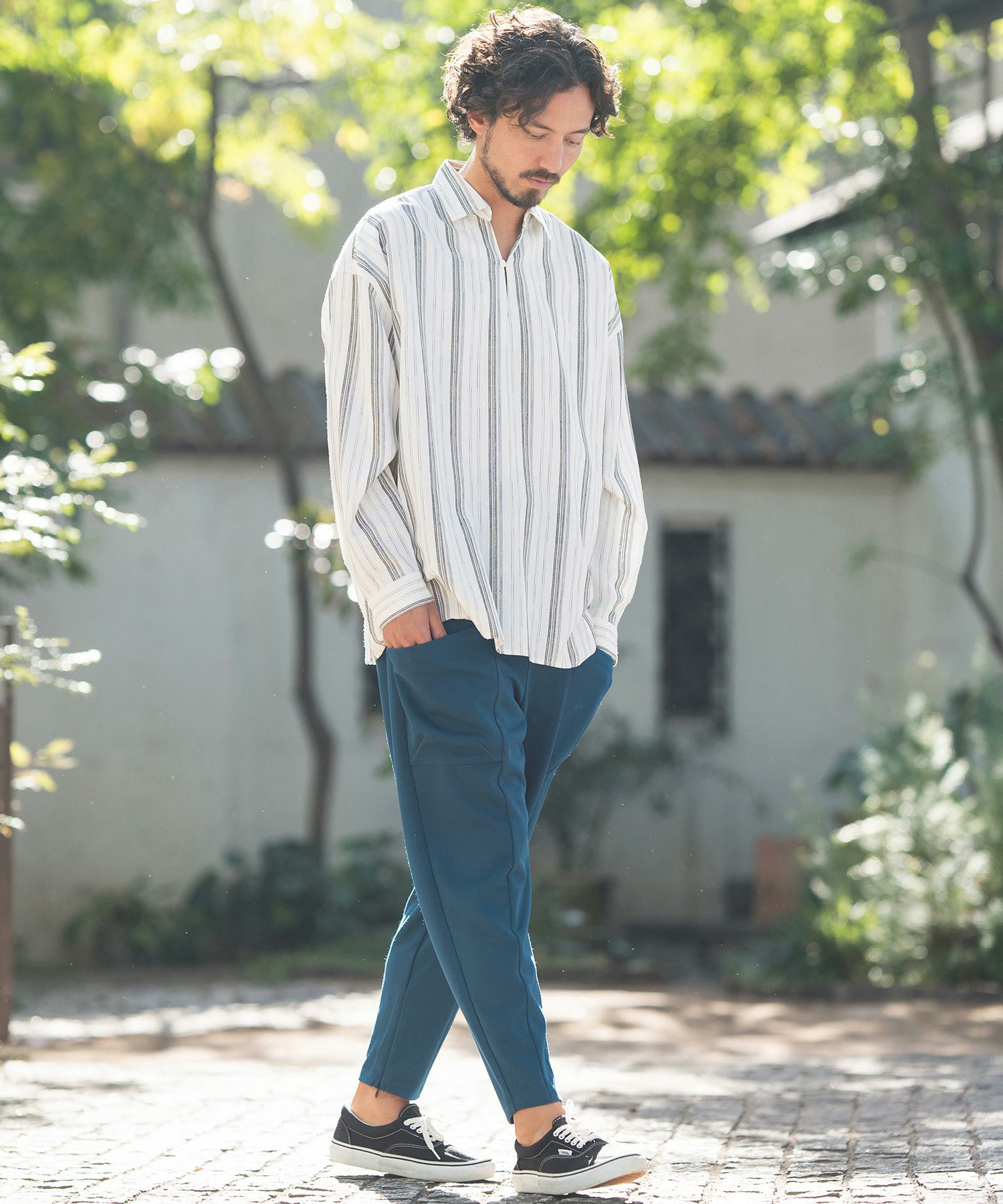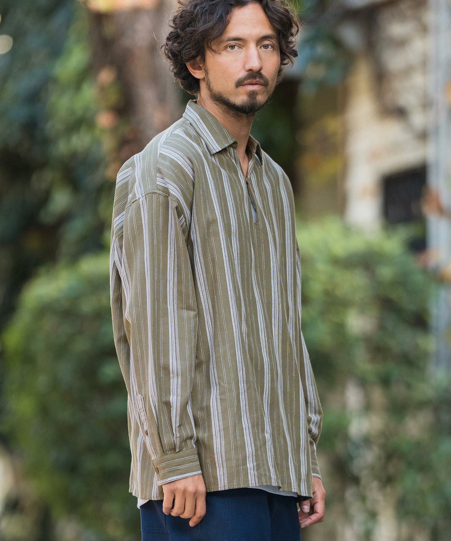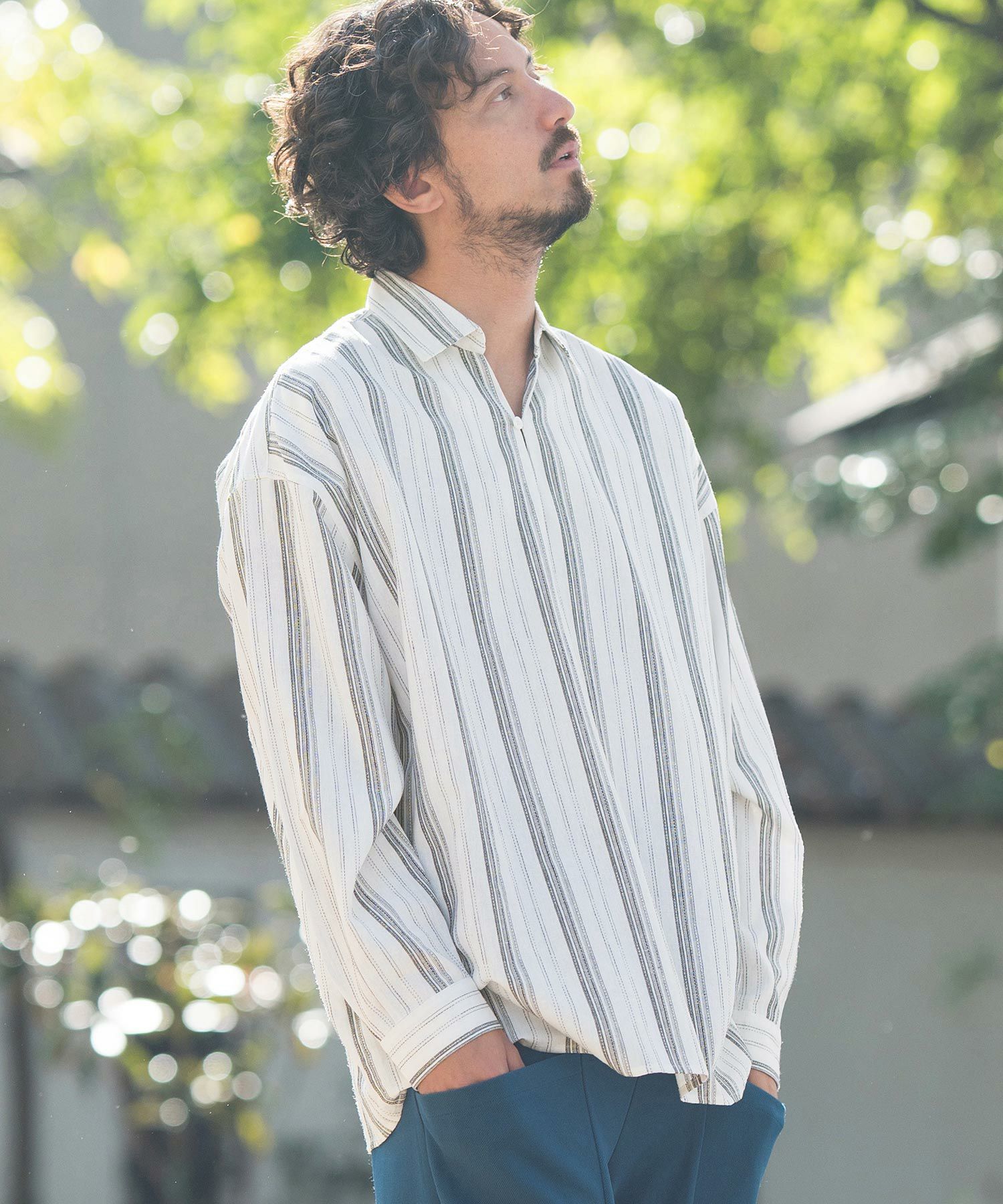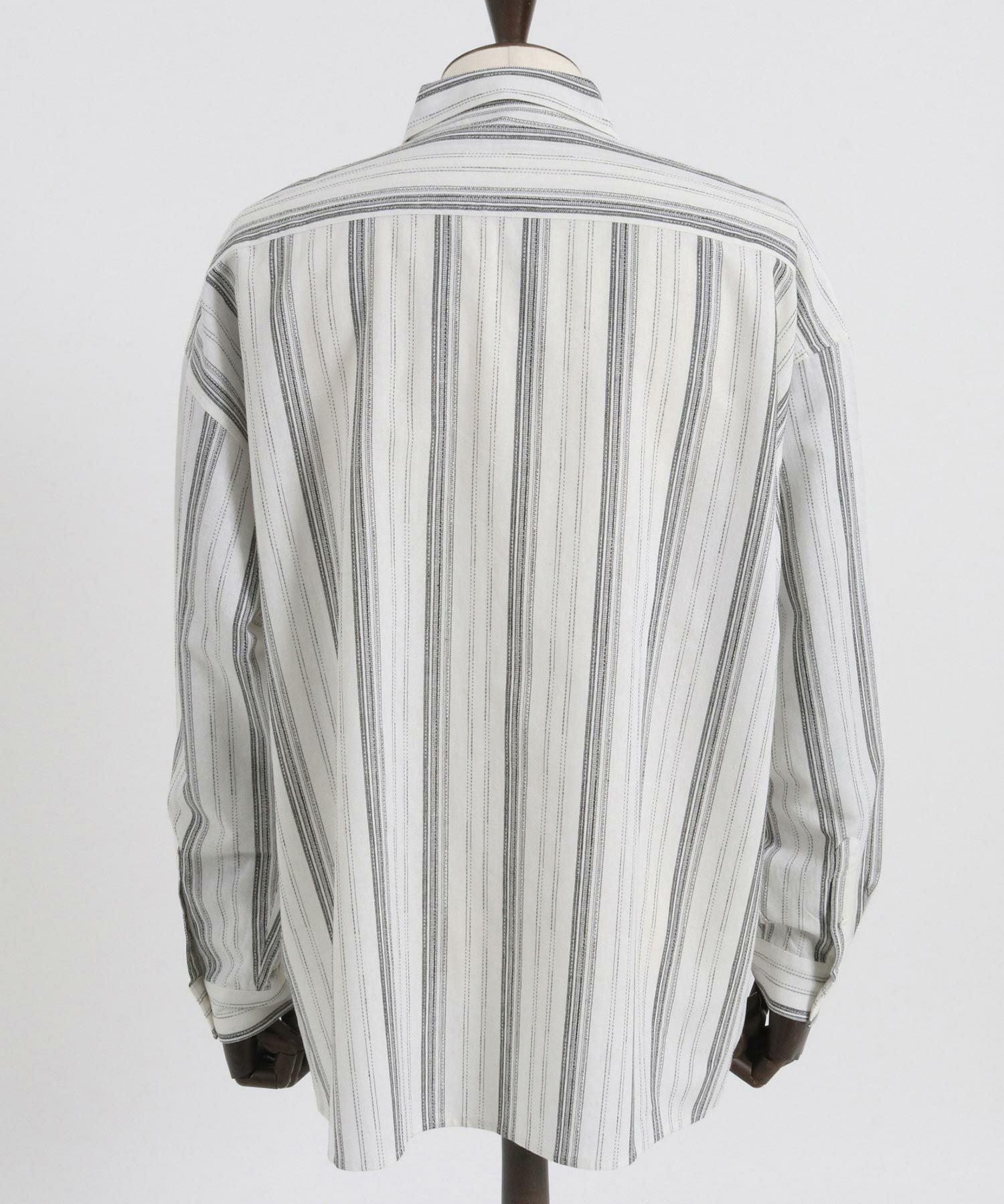 凹凸感のあるJQストライプ柄が特徴のリネン混素材を採用、シルエットはドロップショルダーを採用しワイドでありながら着丈は長すぎないトレンド感あるワイドシルエットに仕上げました。