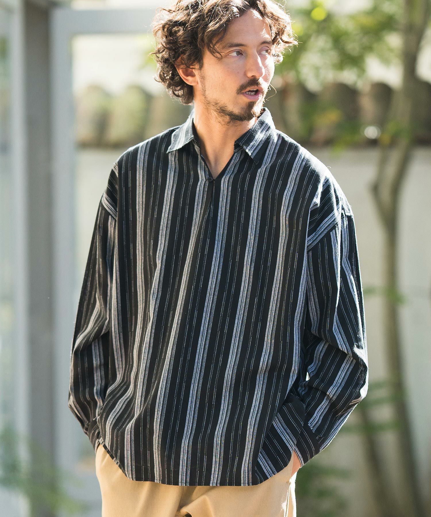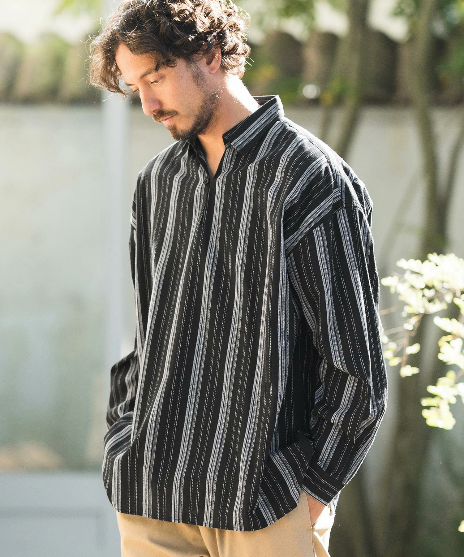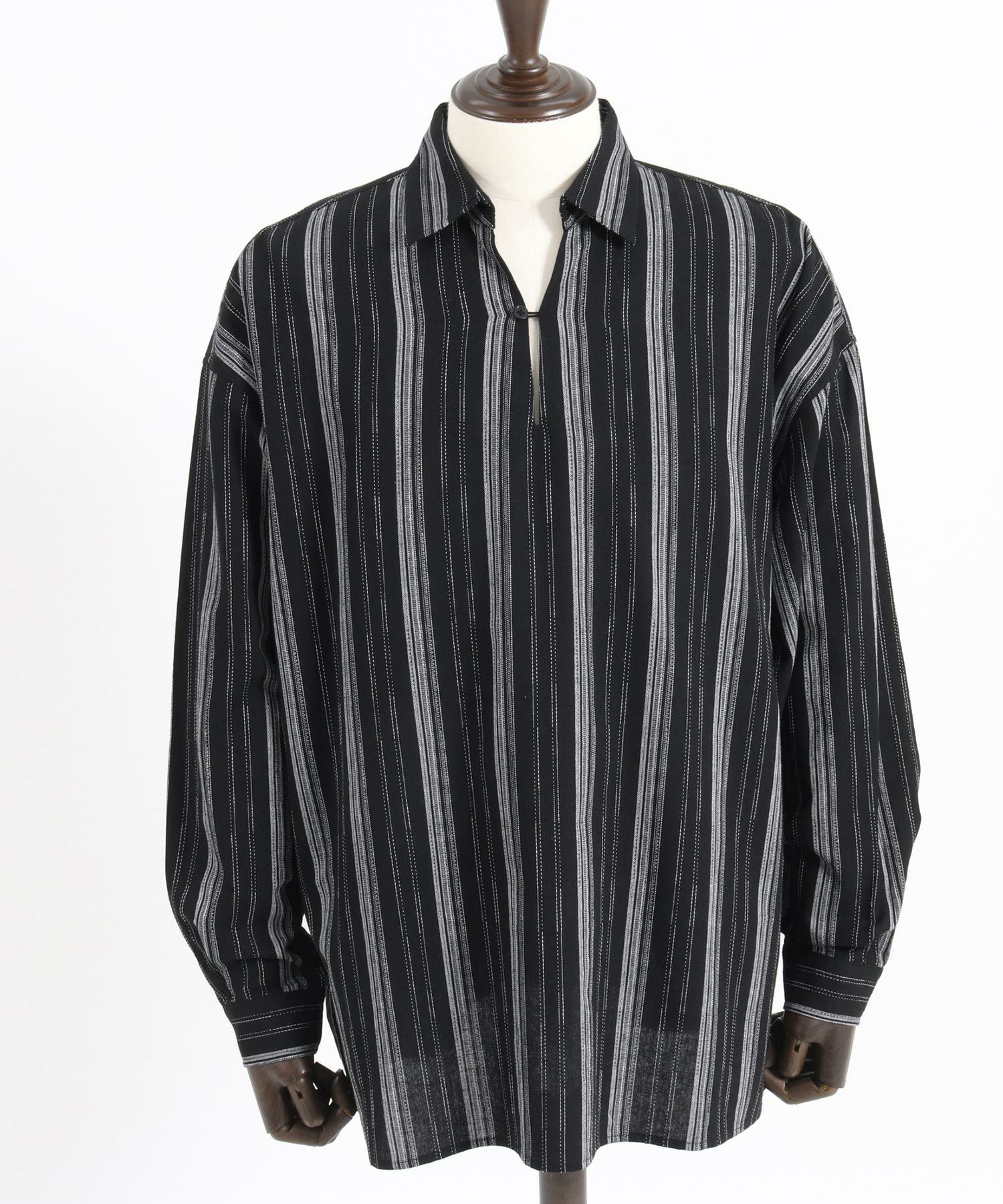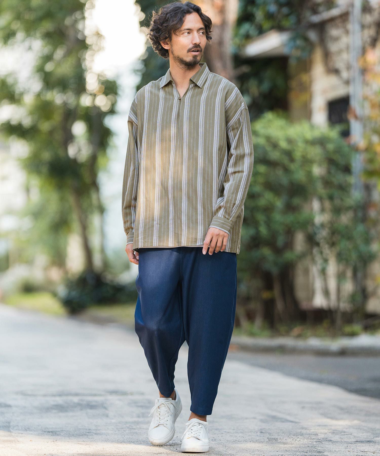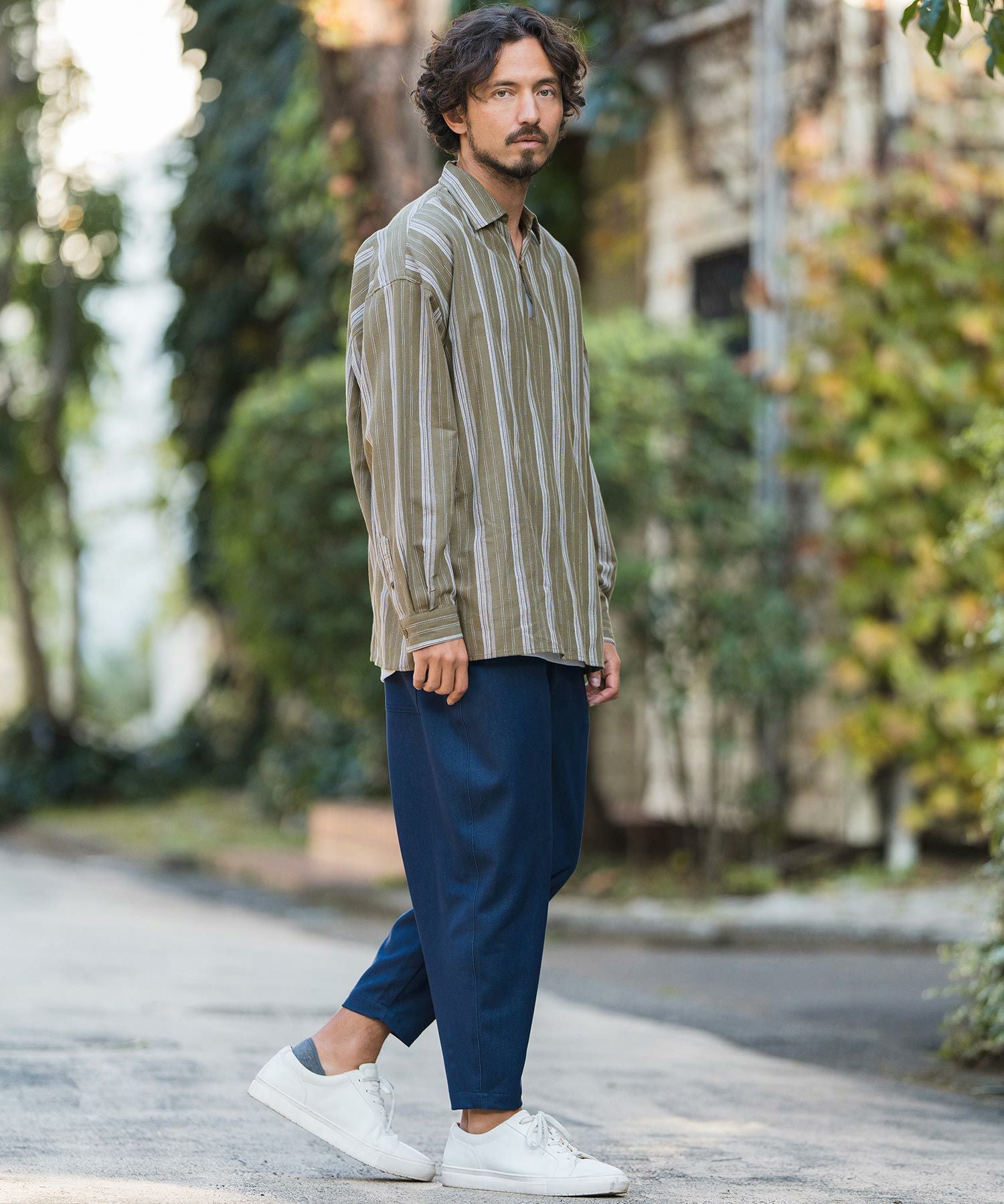 凹凸感のあるJQストライプ柄が特徴のリネン混素材を採用、シルエットはドロップショルダーを採用しワイドでありながら着丈は長すぎないトレンド感あるワイドシルエットに仕上げました。